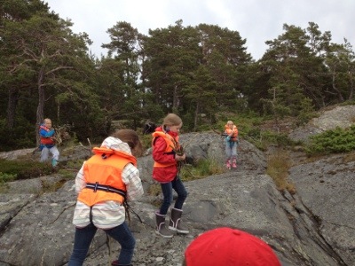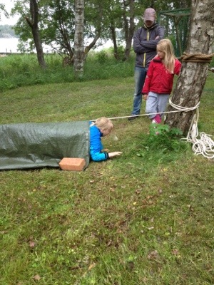 Barnen fick sen i uppdrag att paddla ut i vattnet och hämta en boj med fastsatt nyckel, klura ut vart den passade och öppna. Där fanns dock inget godis men de fick en ledtråd – fågel. Det tog en stund för dom att hitta skatten som var upphängd i ett träd men efter att ha firat upp lillasyster fick dom till slut ner korgen och godiset var säkrat! Jag undrar bara vad som hade hänt om de vuxna hade vunnit utslagstävlingen…?
