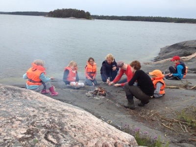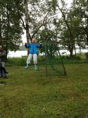 De behövde lite ensamtid för att få ihop banan så Peter kom på den briljanta iden att åka båt till en ö, göra upp eld och grilla korv med egenfixade grillspett. Riktigt mysig utflykt blev det. Efter 2 timmar kom vi tillbaka till en färdigriggad Wildkidsbana. Barnen var lite besvikna på att banan liknade den vi hade förra året men döm om vår (läs: föräldrarnas) förvåning när vi förstod att det nya för i år var att barnen tävlade mot föräldrarna!