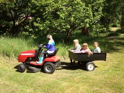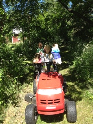 Idag har vi hinnit med otroligt mycket. Efter en stadig frukost gav tog jag och tjejligan (Elsa, Tove, Lovisa och Lina) åkgräsklipparen med vagn och gav oss ut för att plocka blommor till midsommarstången. Det var lite myggigt men det glömdes snart bort när vi bestämde att barnen skulle få turas om att köra mellan blomplockarstoppen. Vi fick ihop en redig hög med allt från smörblommor till liljor (hoppsan, förlåt det var inte meningen…) och var ganska nöjda med det.