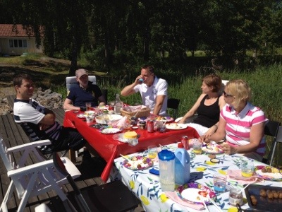 Medan vi har borta hade lunchförberedelserna redan satts igång. Det är mycket att tänka på. Potatisen ska skrubbas och gräslöken ska klippas och köttbullarna stekas och pajen värmas. Inte nog med det, alla lock till sillburkarna måste öppnas, och det tar tid! En fin lunch på bryggan i solen blev det i alla fall. Det var faktiskt ett tag sedan vi ens kunde sitta ute på midsommarafton!