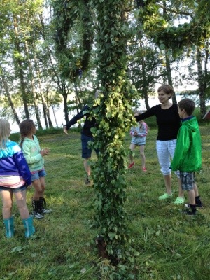 Efter lunchen klädde vi färdigt midsommarstången. Egentligen har man inte midsommarstång i Finland utan man har Kokkobrasa. Det är ungefär som den Svenska majelden. Himla trevligt faktiskt. Dessa eldar tänds vid tolvslaget och här på ön brukar det vara jättefint att se eldarna som tänds på öarna omkring. Vi håller oss dock till det vi är bra på, dvs. Midsommarstång. Den blev jättefin i år!