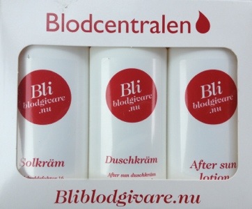 Lina tyckte det var lite spännande och lite läskigt, men väl inne var det inte så farligt. Mannen som man registrerade sig hos pratade hela tiden pedagogiskt om vad jag fick göra och vad som skulle hända. Lina fick ett nyckelband och en reflex och en dricka som hon kunde sitta med när jag var iväg och tappade. Medan jag gav blod hann Lina också tala om att hon fyller år imorgon och fick en fin present av mannen vid registreringen. Ett sommarset med solkräm, duschkräm och after sun lotion. Hon var mycket nöjd när vi gick därifrån och det var jag också!
