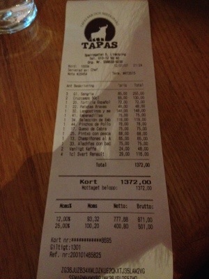 Vi hittade en trevlig Tapasrestaurang som hade mycket bra mat. Dom hade en ”prova på meny” med 10 rätter som såg helt ok ut men vi bestämde oss för att välja ut rätterna själva. Sagt och gjort valde vi ut 10 rätter som verkade bra och beställde.