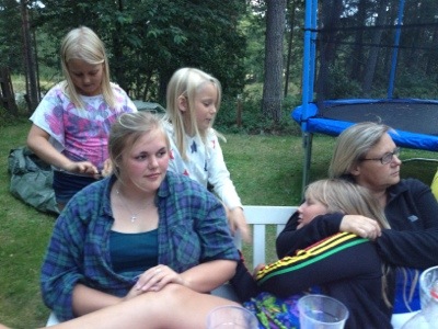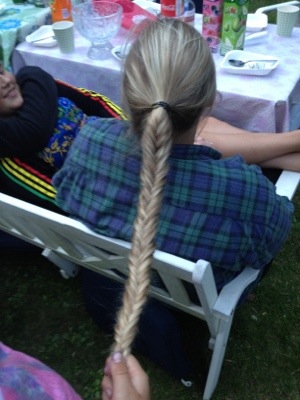Hela gänget, Tove flätar Emy, Nora, Suzi, Olle, Lina och Magnus. Och så Bella längst fram