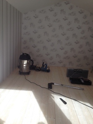 Ja, sen har han faktiskt finslipat golvet i Friggan medan vi var och köpte golvlack och lite golvspackel till kvisthålen i golvet.