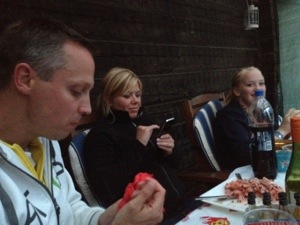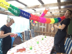 Hanna och Malin pyntar inför kvällens kräftskiva