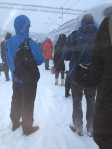 Jag kom med och åkte in i snigelfart. Vi stod fast rätt länge på hemmaperongen i pendeltåget. Alla ringde som galningar och ställde in möten och försökte rodda runt för att få till dagen. Föraren hade ingen aning om hur lång tid vi skulle stå fast men till slut rullade vi vidare lååångsamt.