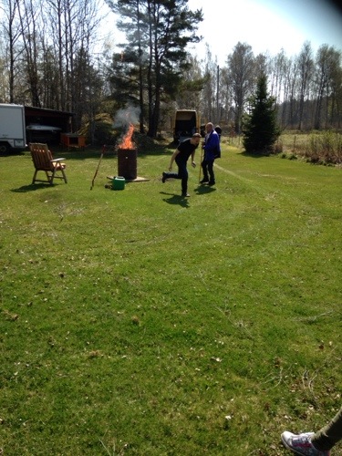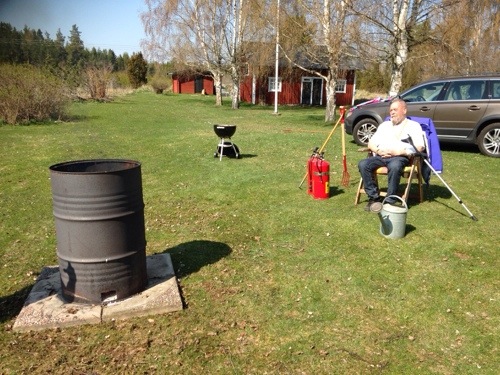 På lördagen kom det fina vädret och vi satte igång och kratta och rensa i trädgården på Löten. Magnus och Ingela förberedde eldningstunna och farfar sattes som eldningsvakt. Lite bensin på de torra grenarna, i med tändstickan och KABOOOM så var det bara att ta skydd, hehe😊