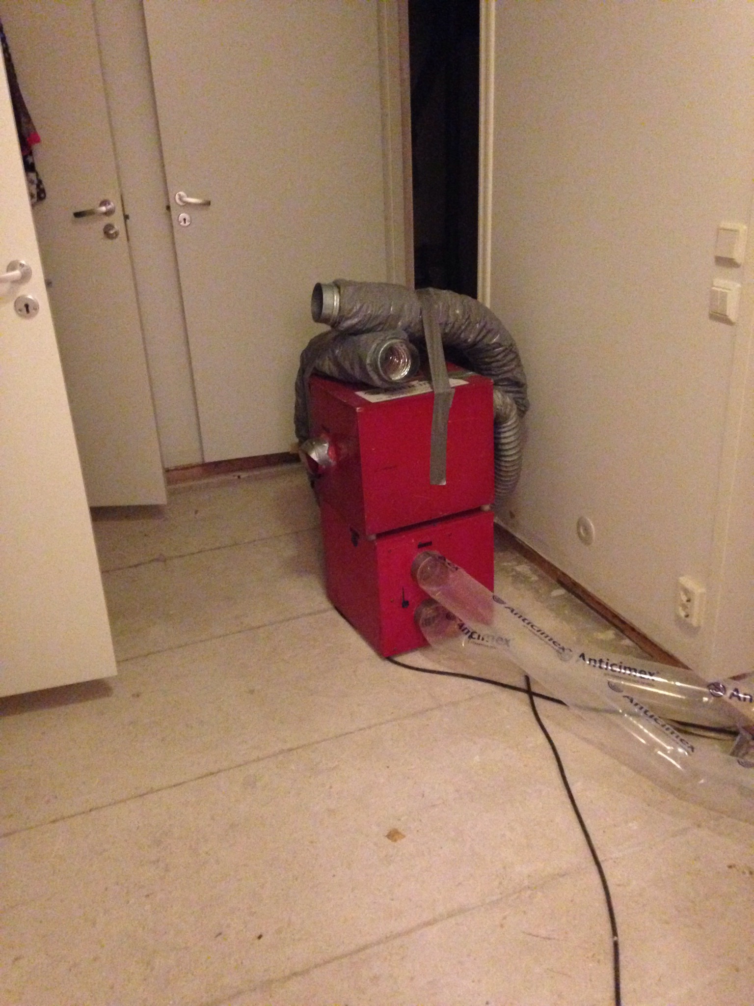 När två veckor har gått kommer dom och mäter fukten igen. Jag har ingen stor förhoppning om att det är klart då, inte efter alla skräckhistorier jag har hört från andra där det ibland har tagit flera månader innan det har torkat. Men vi får se.