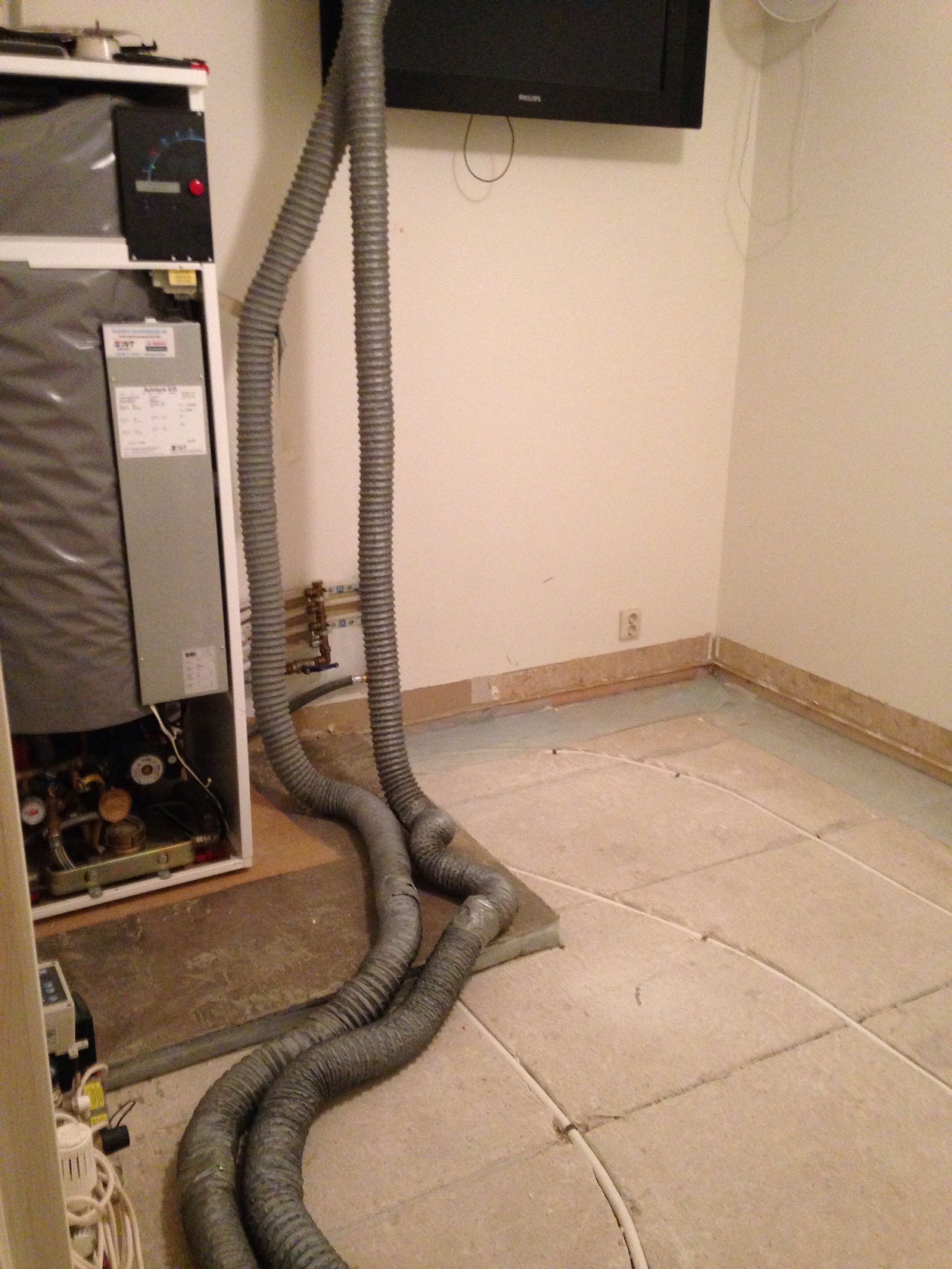 Nästa utmaning är hur vi ska göra med golvet i pannrummet. Mattläggaren säger att det inte är tillåtet att lägga golvet på det sätt som vi hade det tidigare, utan att vi måste gjuta hela golvet. Då tar det ca 2 månader (Magnus rättar och säger 2 veckor, det är ju en baggis ju!) till att torka det, dessutom utan panna, dvs inget varmvatten eller värme. Då får vi troligtvis ha en liten portabel varmvattenberedare och värmefläktar. Vi som trodde det var slut med fläktar när golvet var torrt, suck!