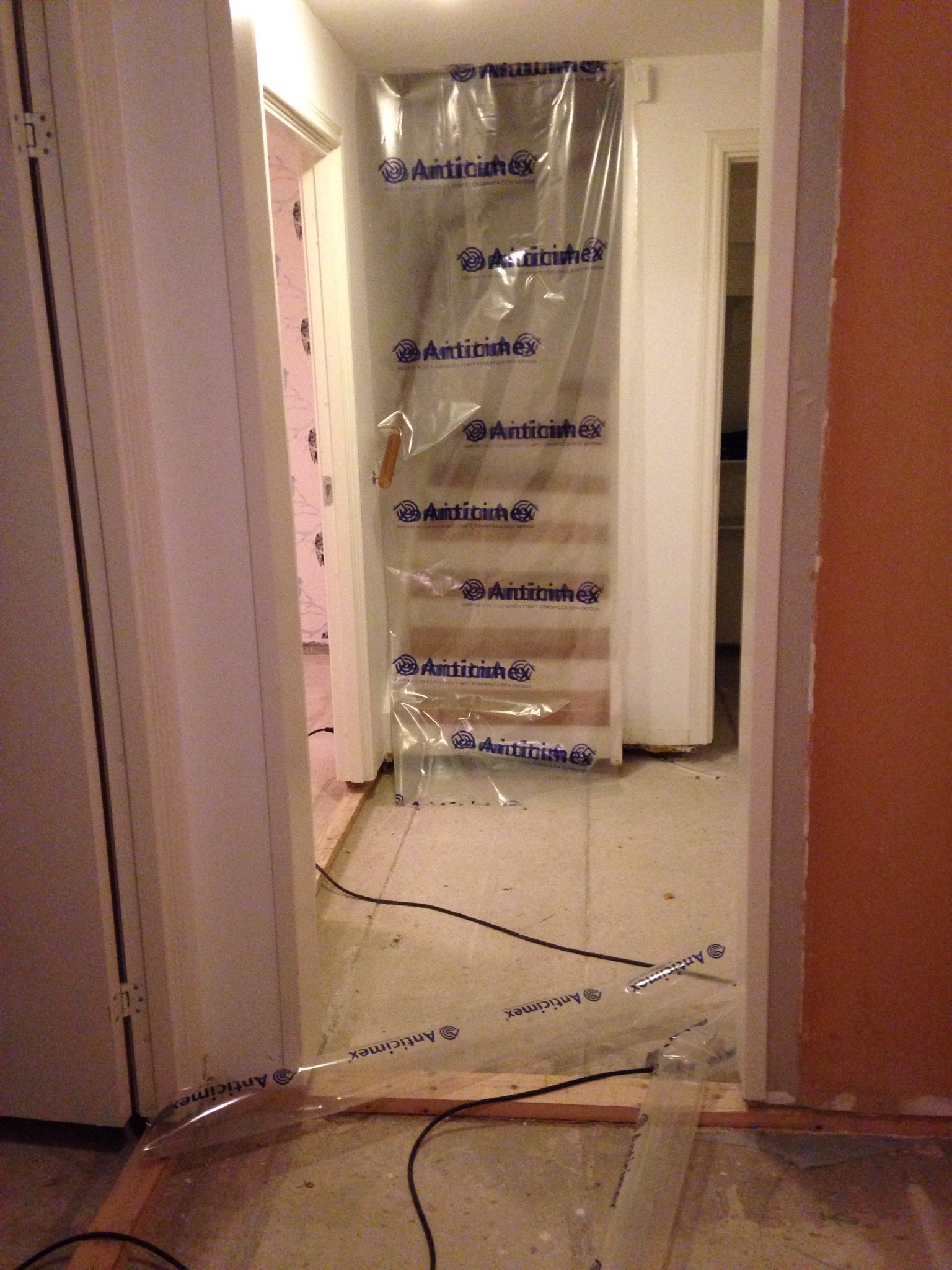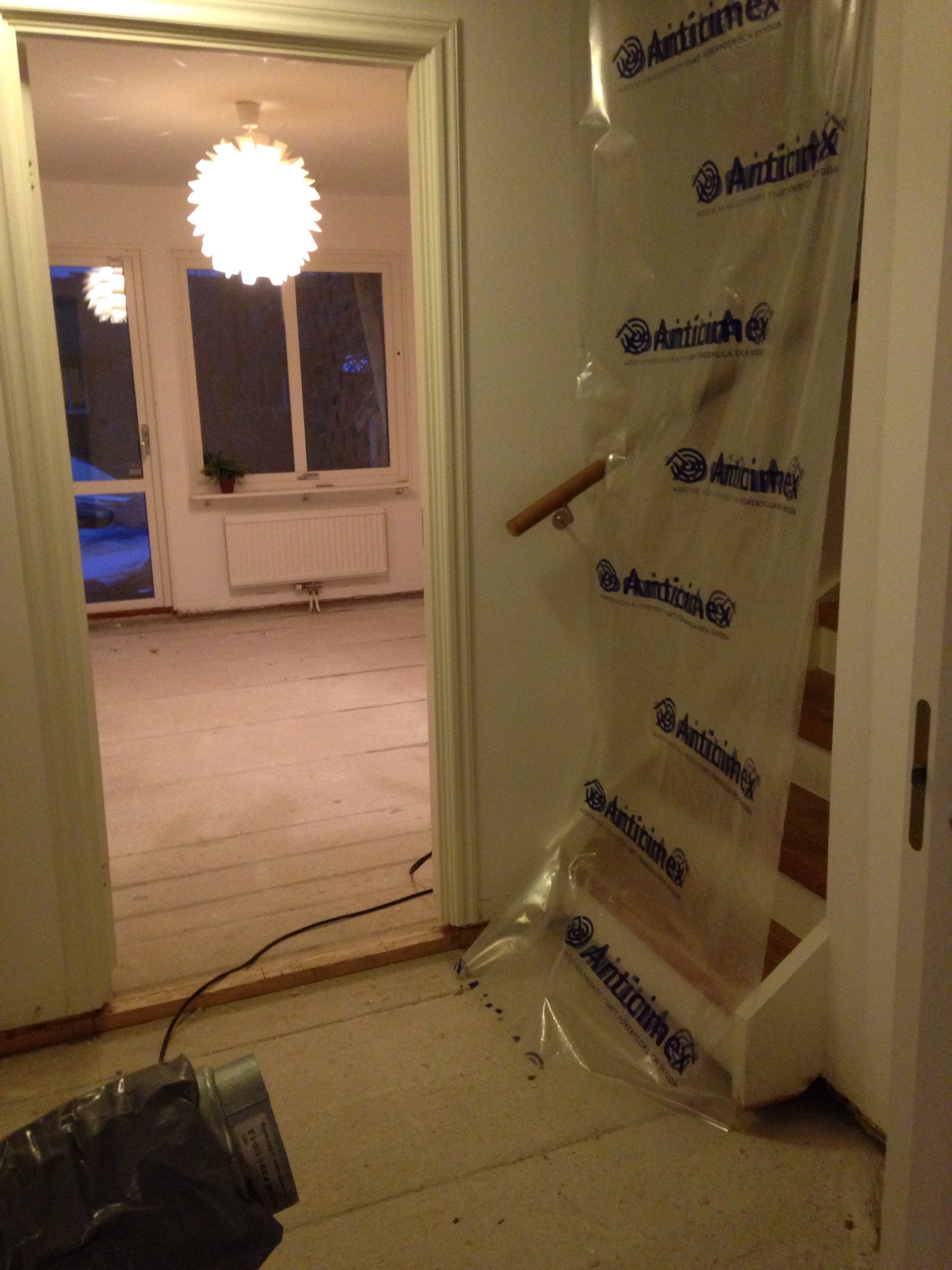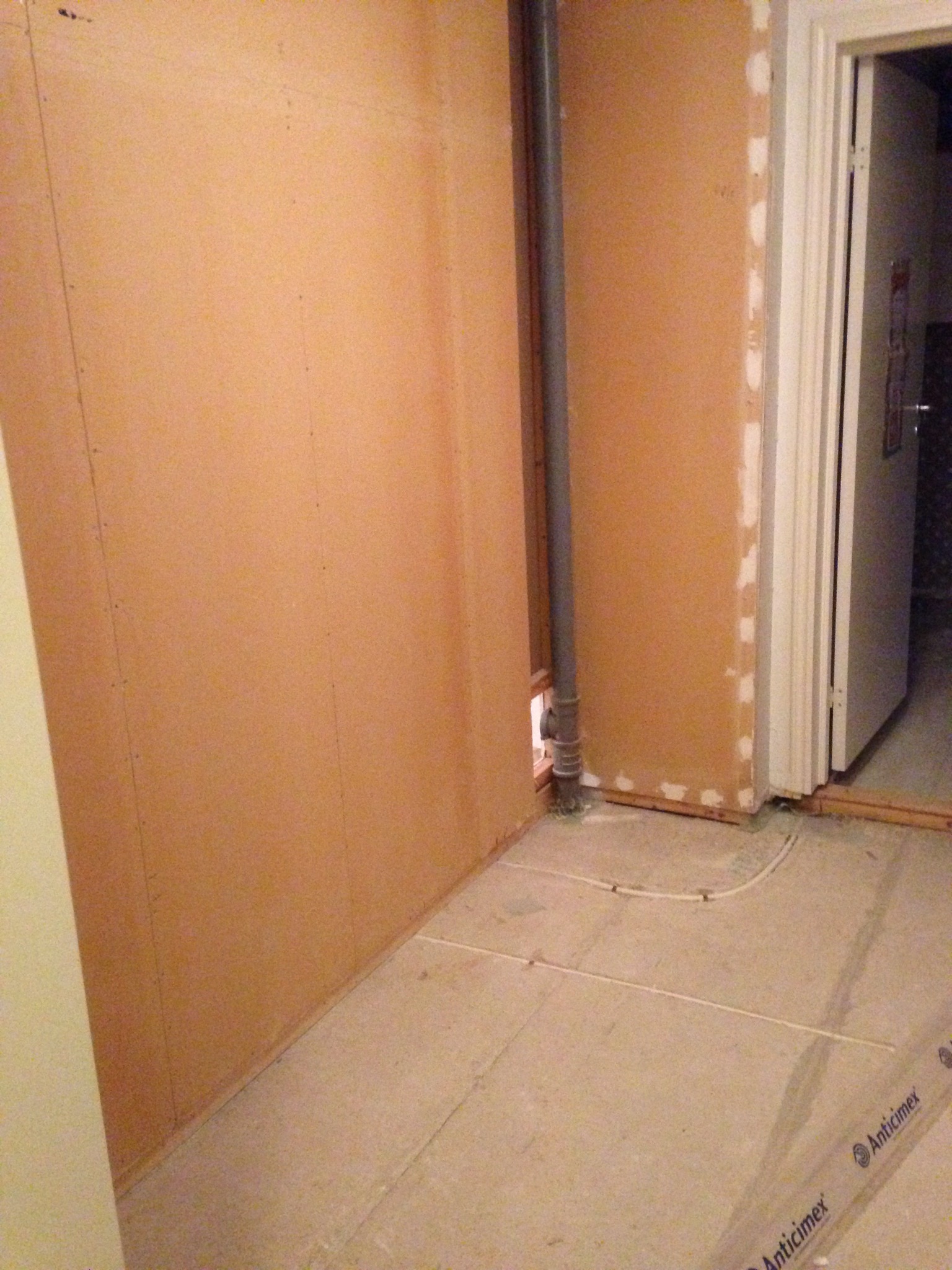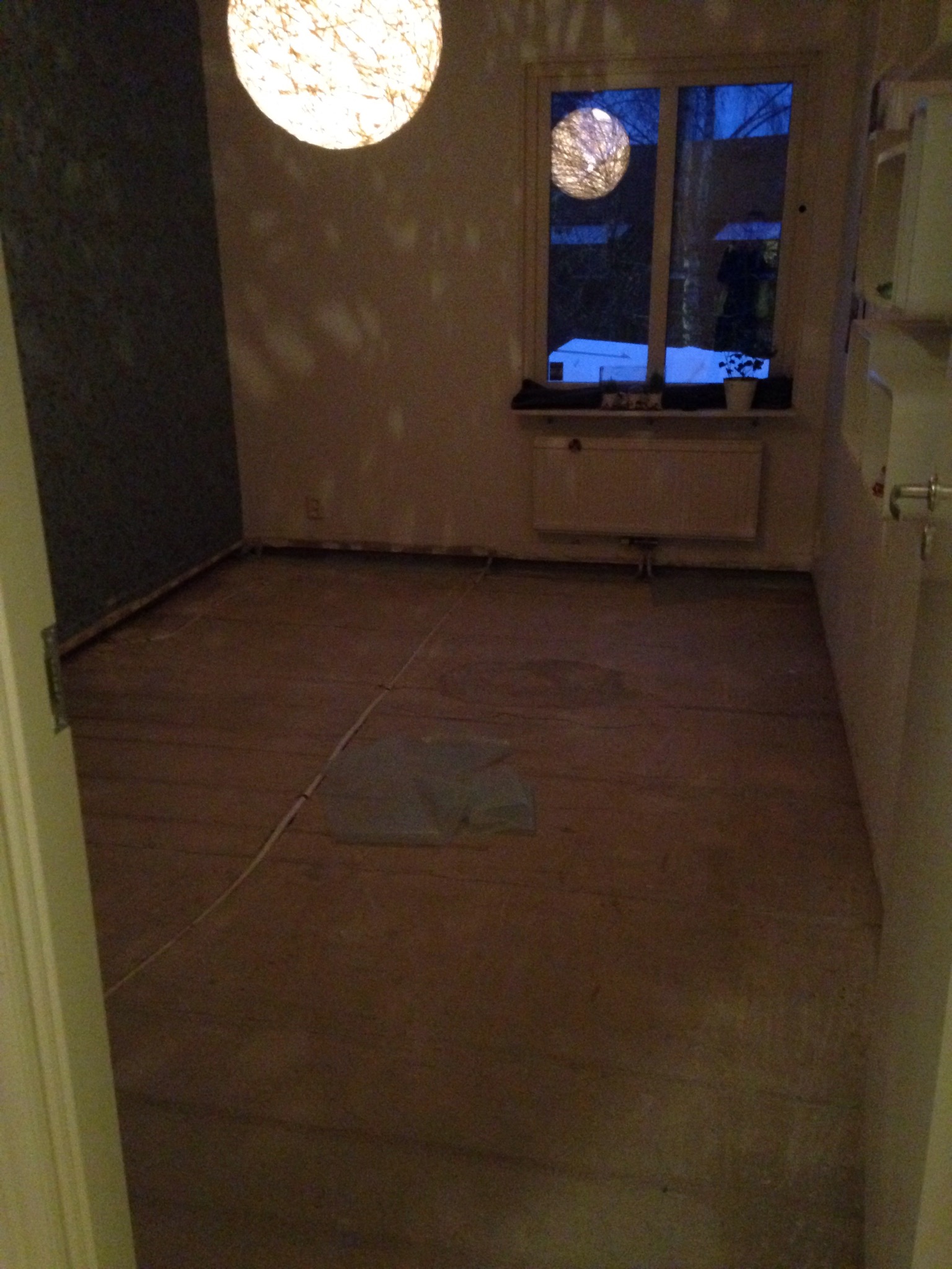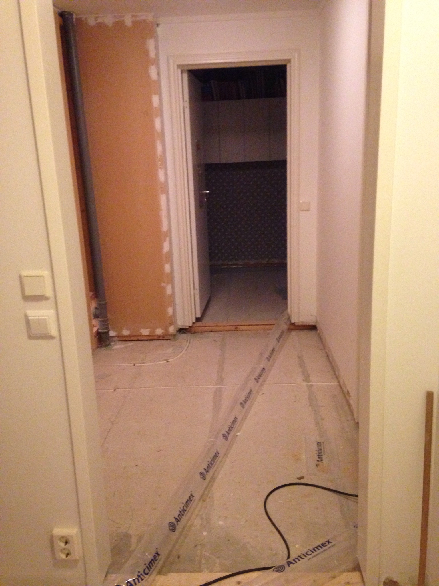 Den 21 september gick en slang på vår vattenberedare sönder och vatten stod som en fontän ut över golvet. Tack vare goa grannar som hjälpte till att torka upp vattnet blixtsnabbt trodde (eller snarare hoppades) vi att vattenskadan var hyfsat begränsad till hall och vårt sovrum. Men det som först inte såg så farligt ut visade sig vara värre än vi trodde och hela undervåningens golv, utom badrum, är nu rivet till grunden.