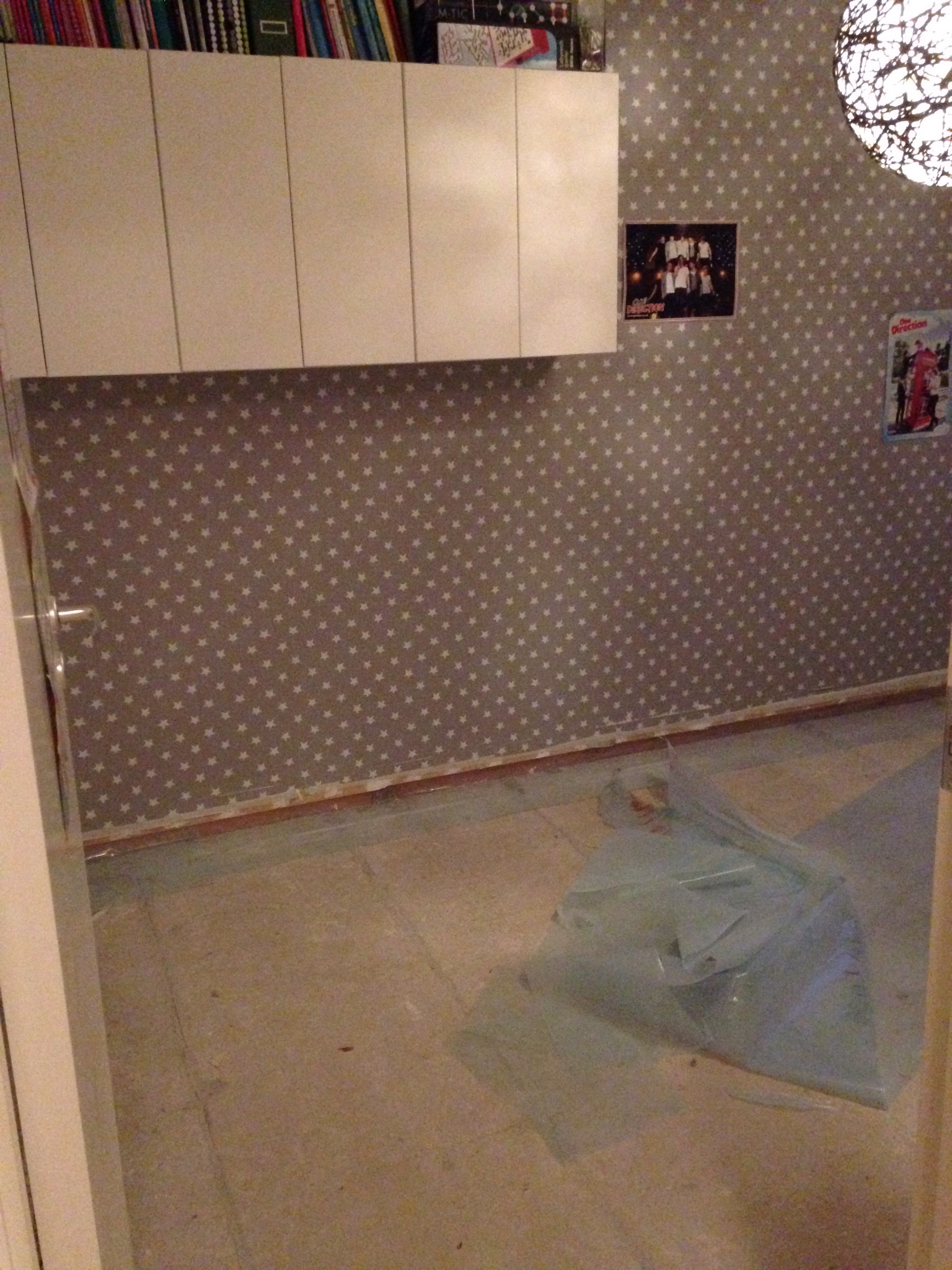 Toves sovrum. Det vita som syns utanför fönstret är inte snö, som man skulle kunna tro, utan högen av frigolit och gamla golv vi just slängt ut.