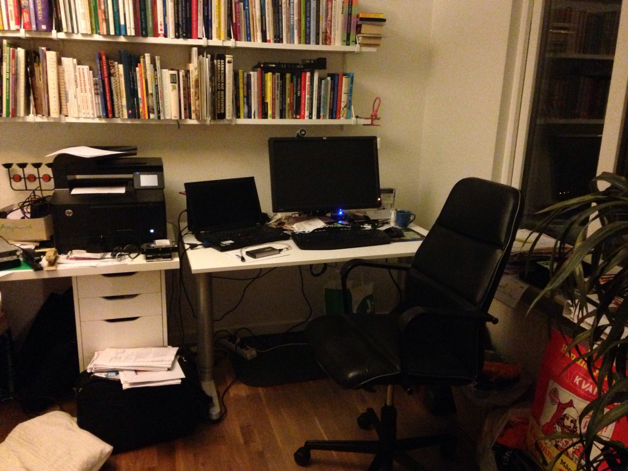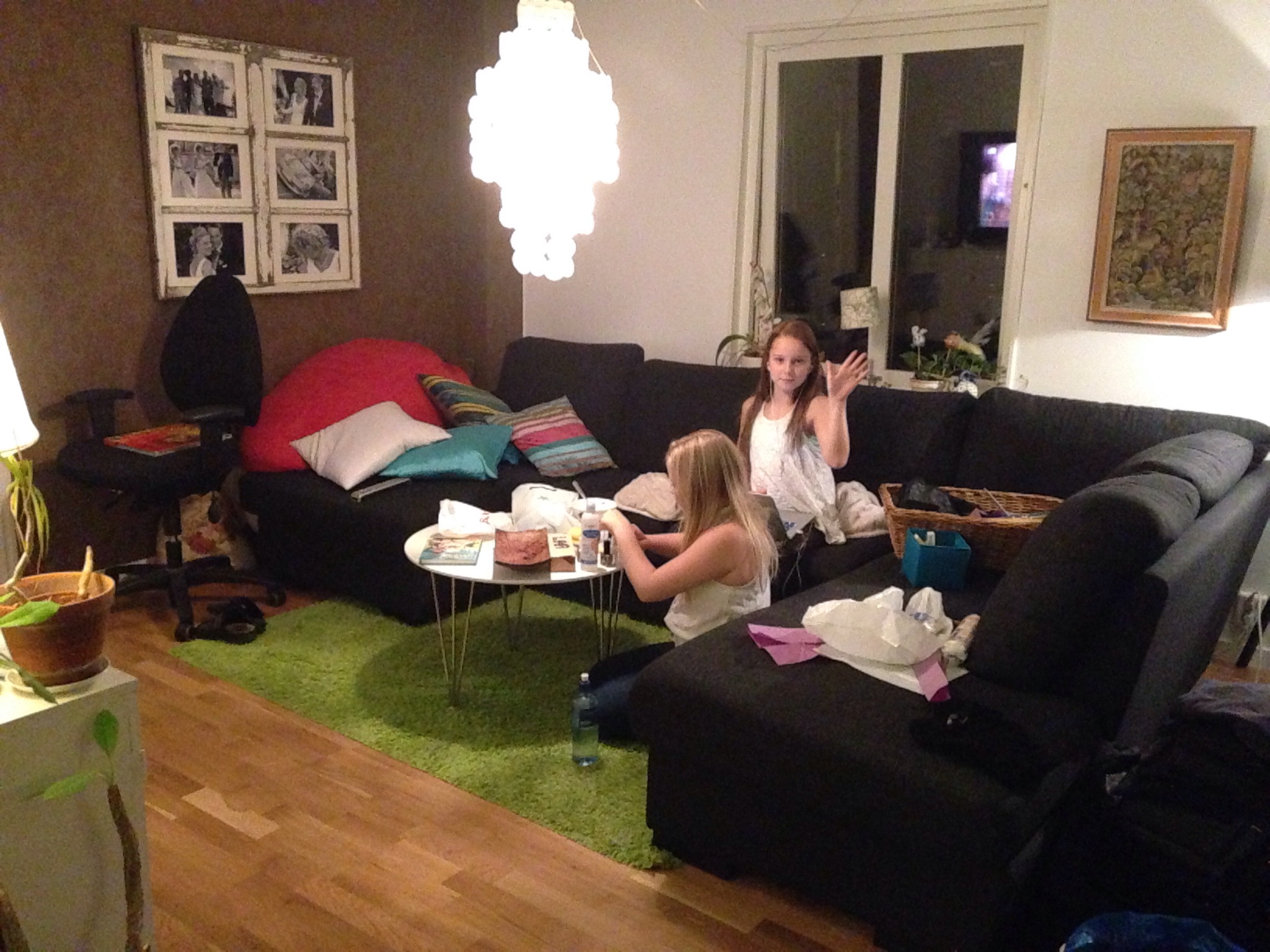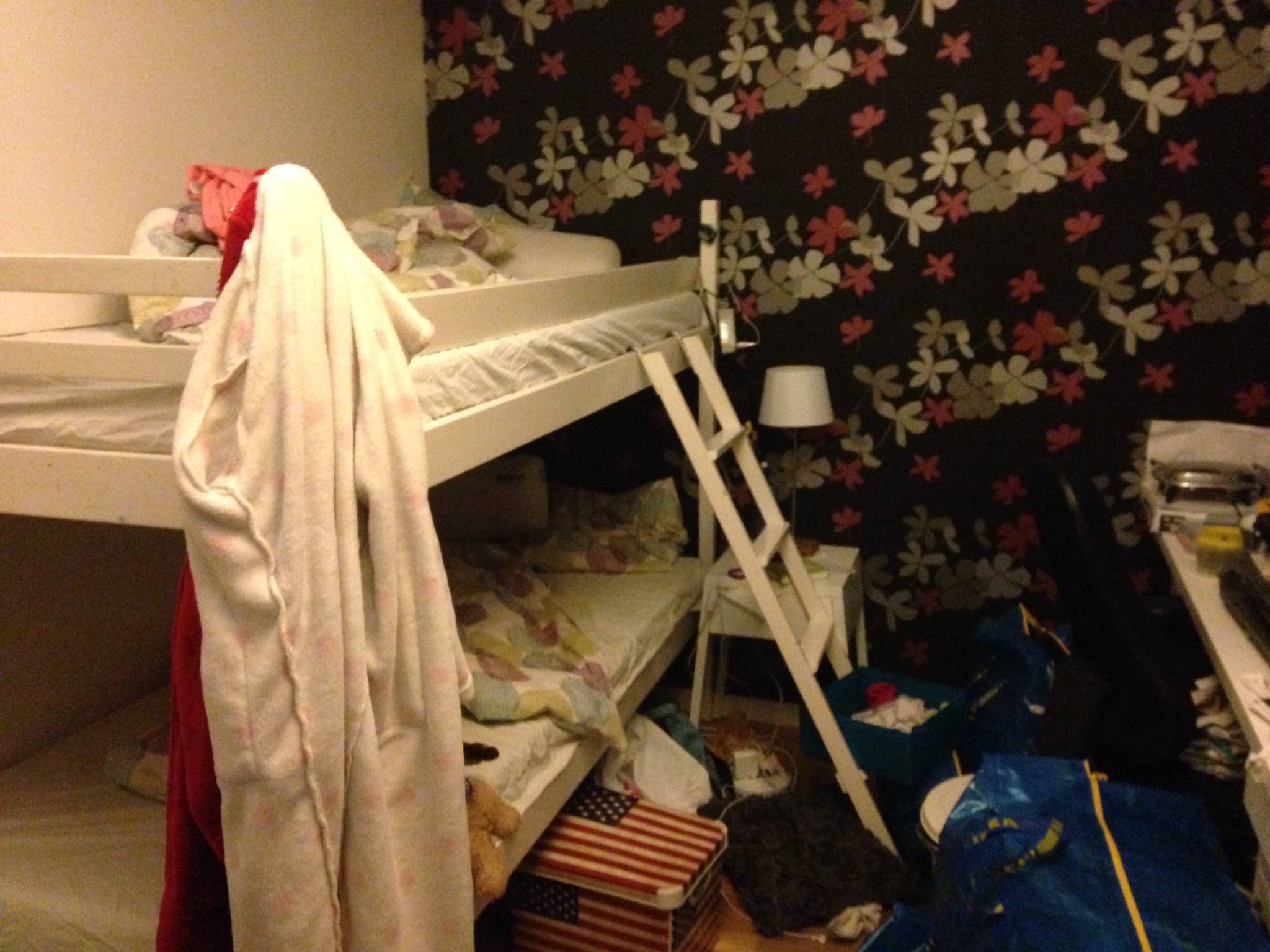 Vi bor numera i en tvåa med kök på övervåningen. Magnus och min säng står i vardagsrummet under matbordstaklampan och tjejerna sover i våningssäng i arbetsrummet. Ganska mysigt faktiskt måste vi erkänna, i alla fall om man kunde få bort ljudet av luftavfuktarna som går dygnet runt. Det är faktiskt ett grymt jobbigt ljud, speciellt när man ska sova.