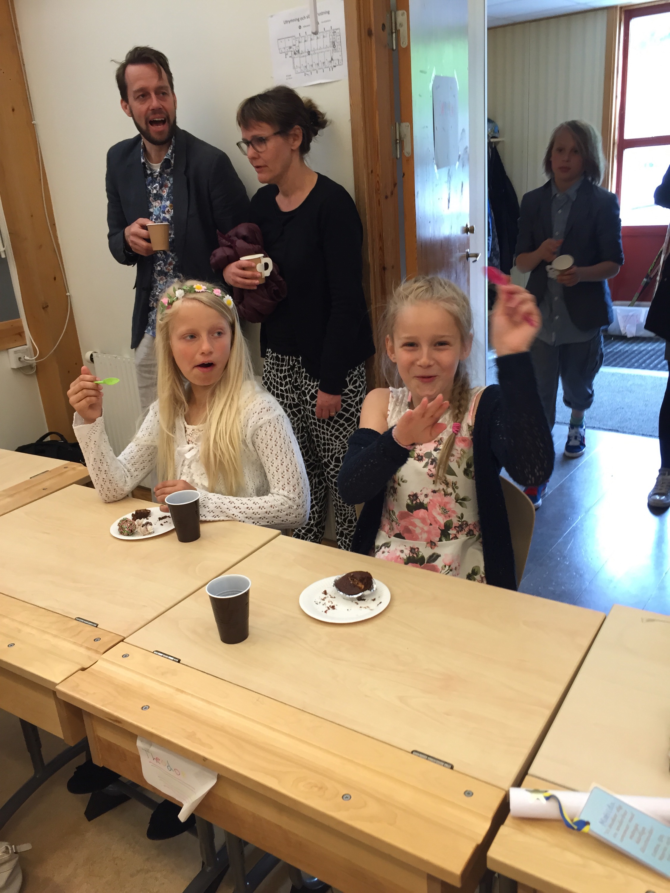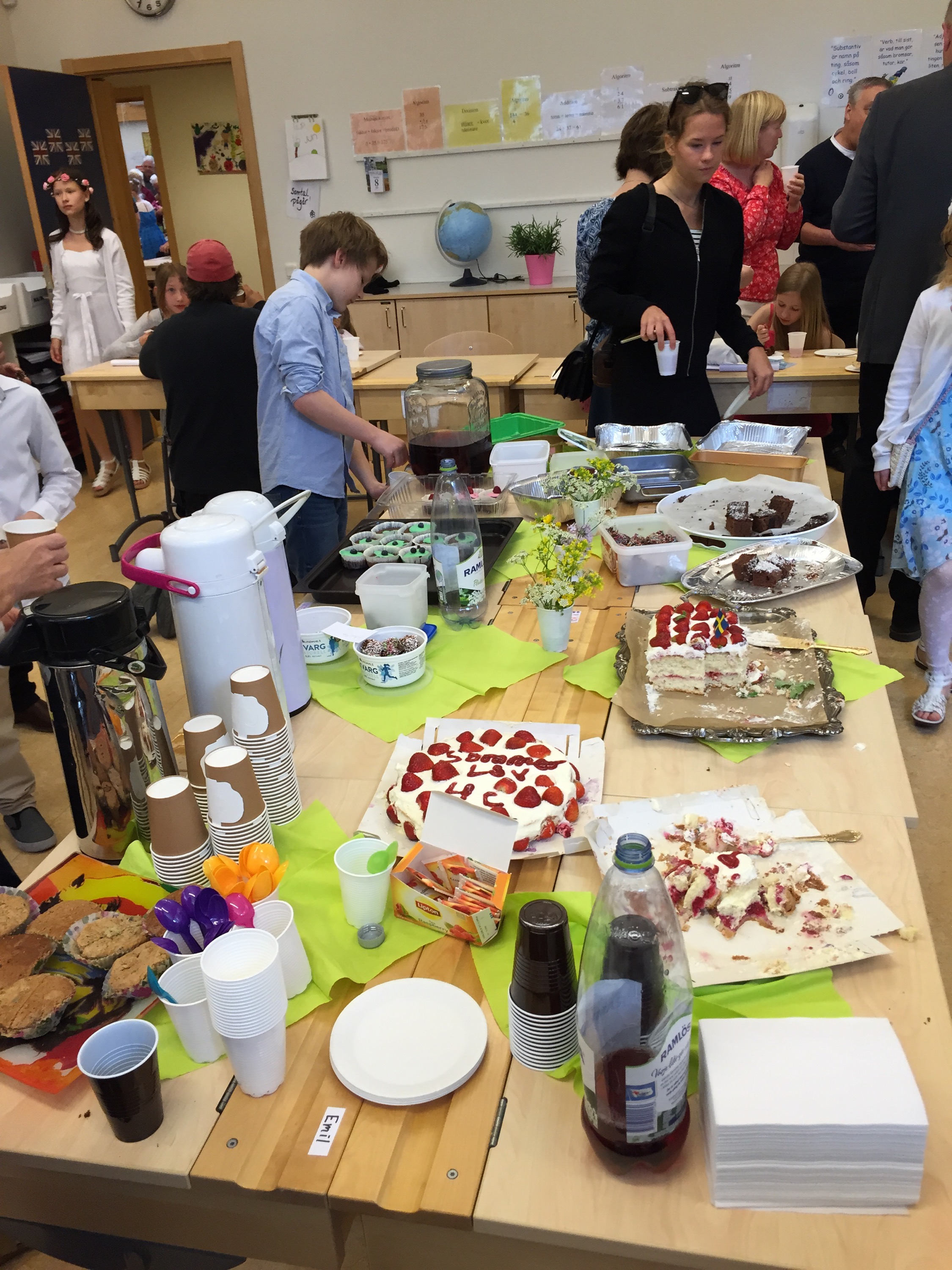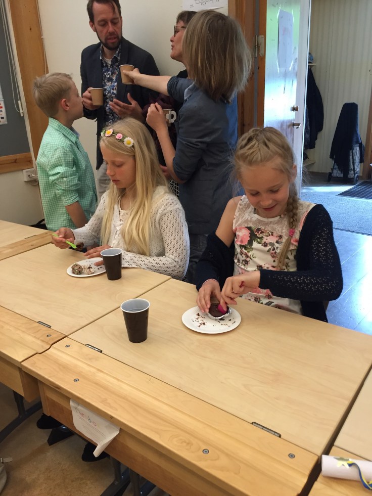 Fika i Linas klass. Barnen hade själva fixat allt. Lina och Ida bakade här hemma igår.