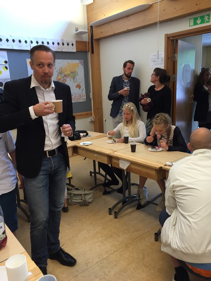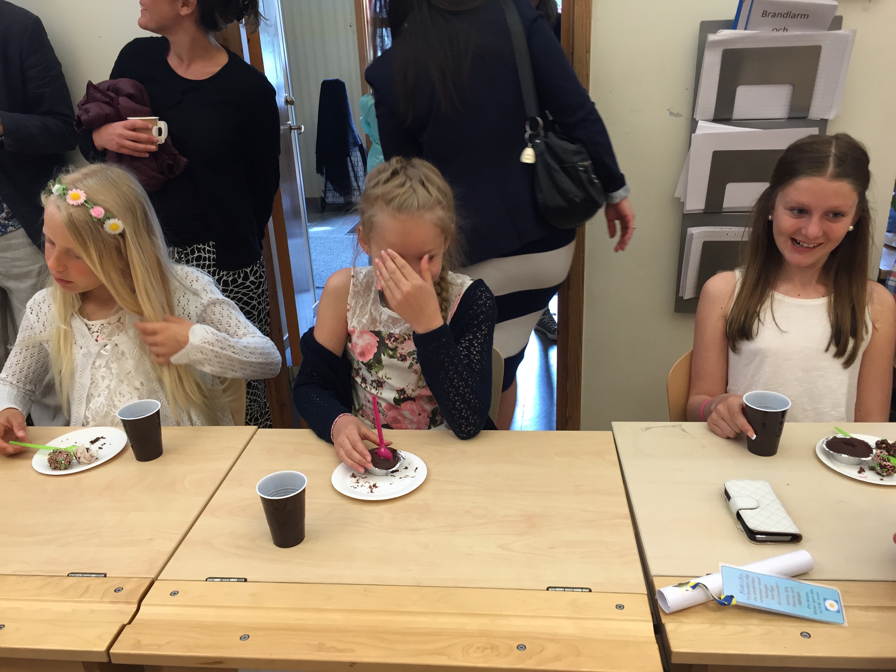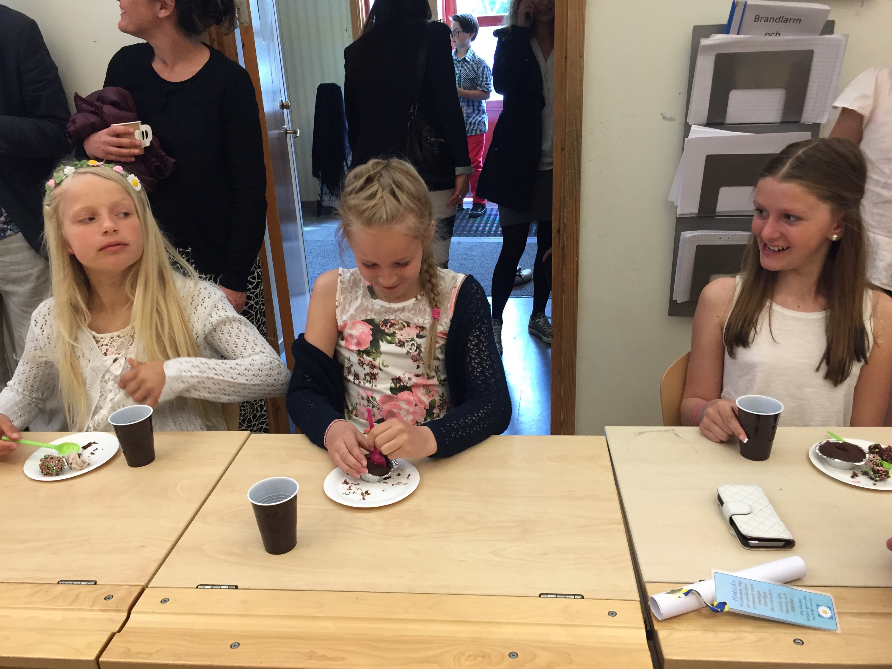 Fika i Linas klass. Barnen hade själva fixat allt. Lina och Ida bakade här hemma igår.