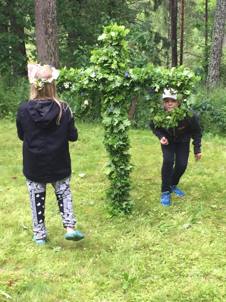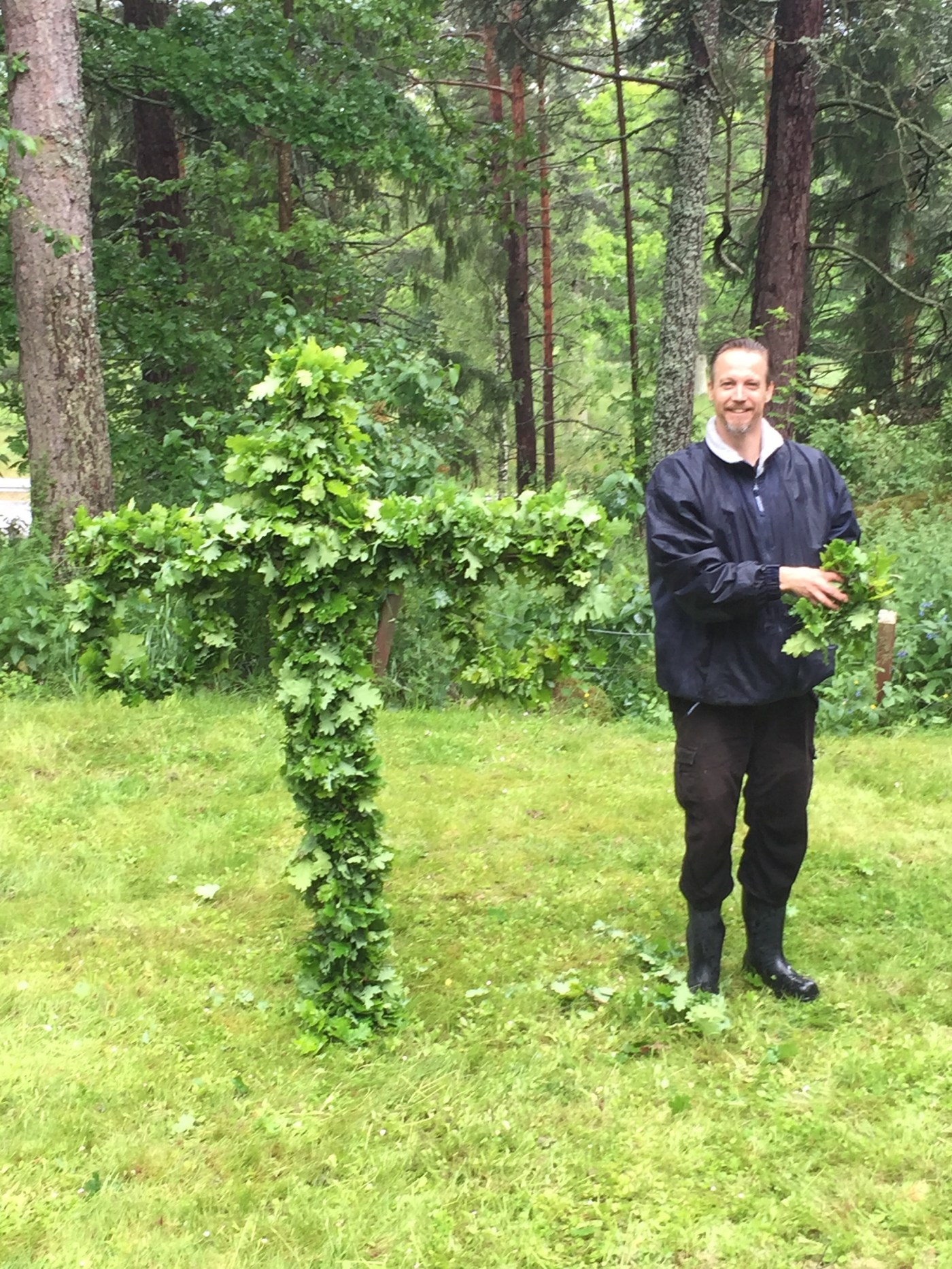 Midsommarstång på gång, med ….EKLÖV?!? Ska tydligen vara så på Tallåsen. ”Så gjorde alltid mormor och morfar, och det beror på att det inte finns några Björkar här uppe i skogen”. Ja, men då får det väl bli Eklöv då! Tradition är tradition, och det är viktigt! Magnus har till och med bildbevis…
