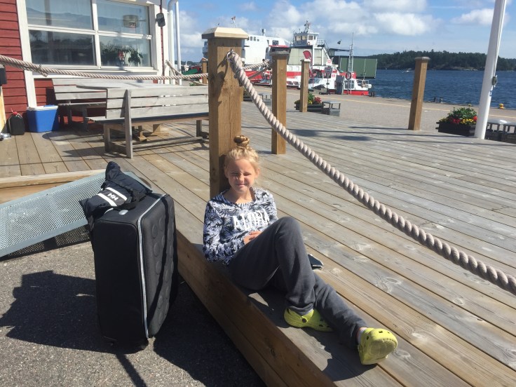 Lina skulle åka och hälsa på kompisen Ida på hennes landställe som ligger på en ö utanför Sandhamn, så vi skulle mötas upp där. Här väntas det på färjan i Stavsnäs.