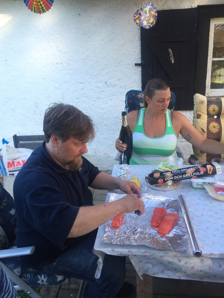 Ingela förbereder välkomstdrink och Henke laxpaket till de som inte älskar skaldjur.
