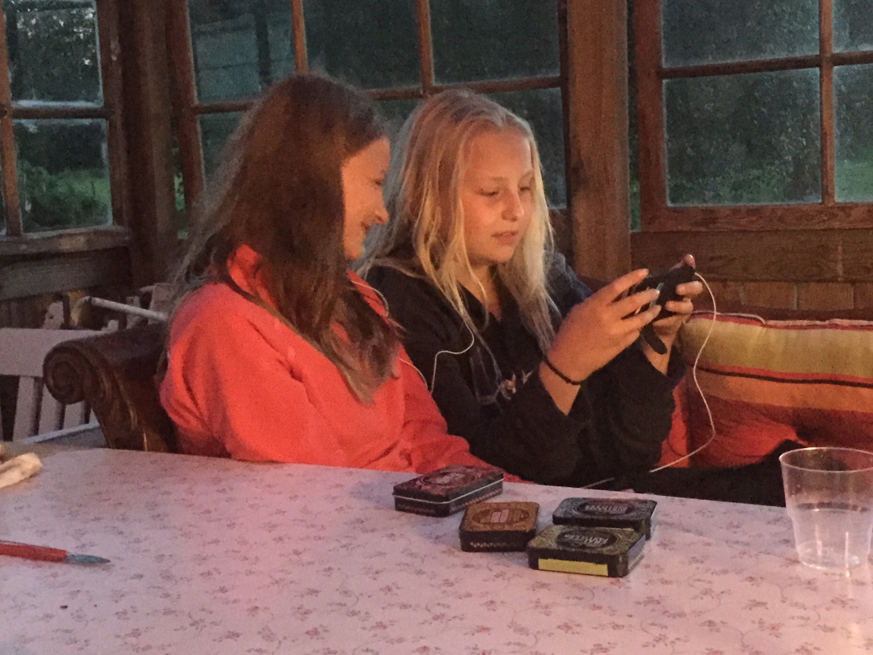 Kusinerna Jonna och Tove myser i soffan.