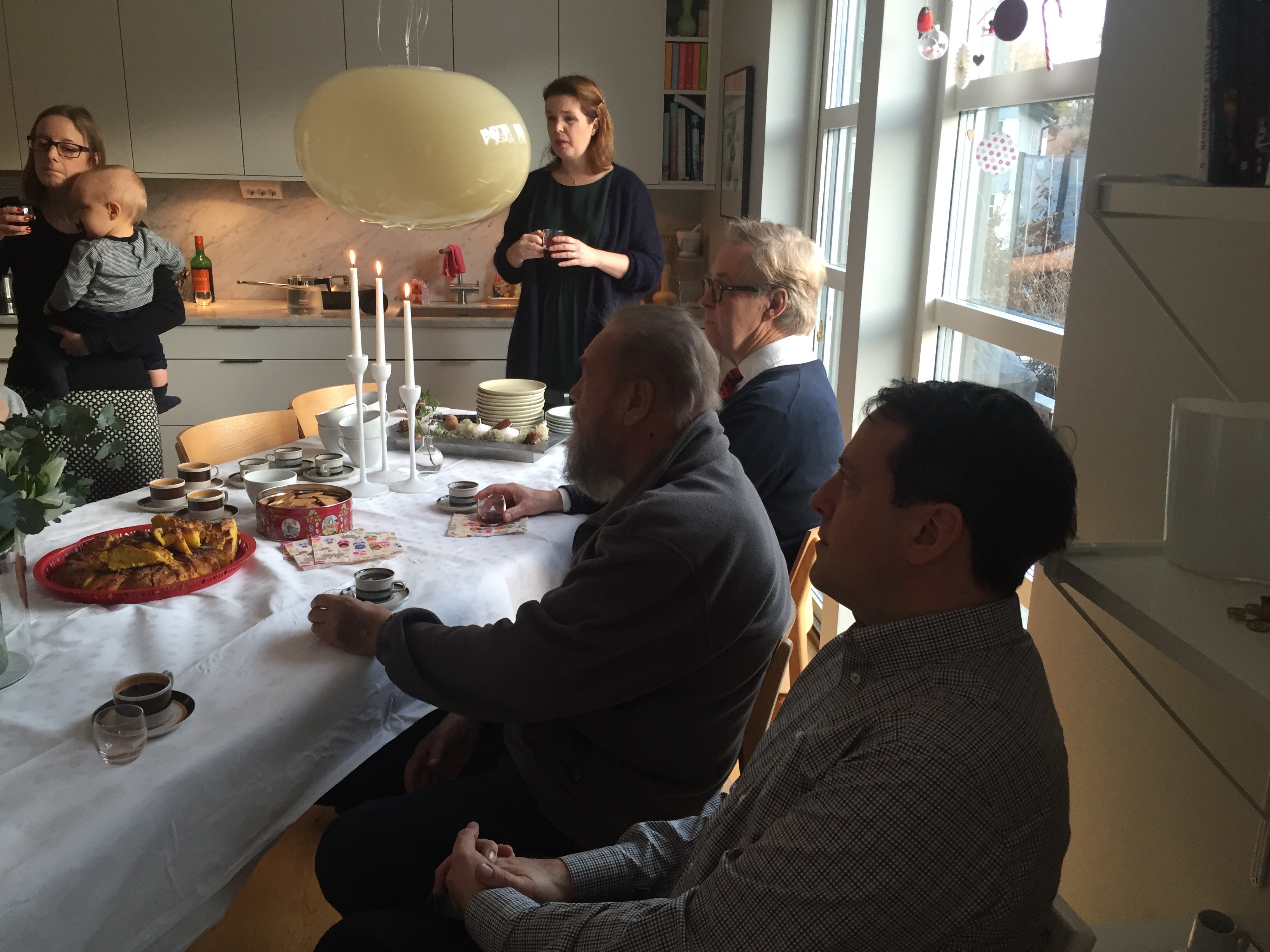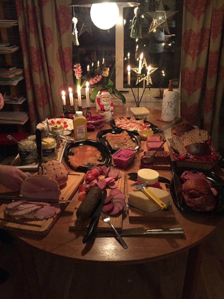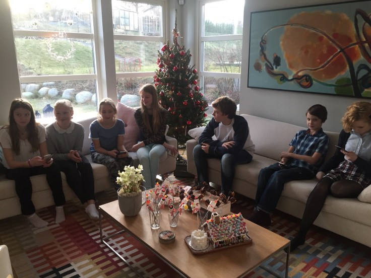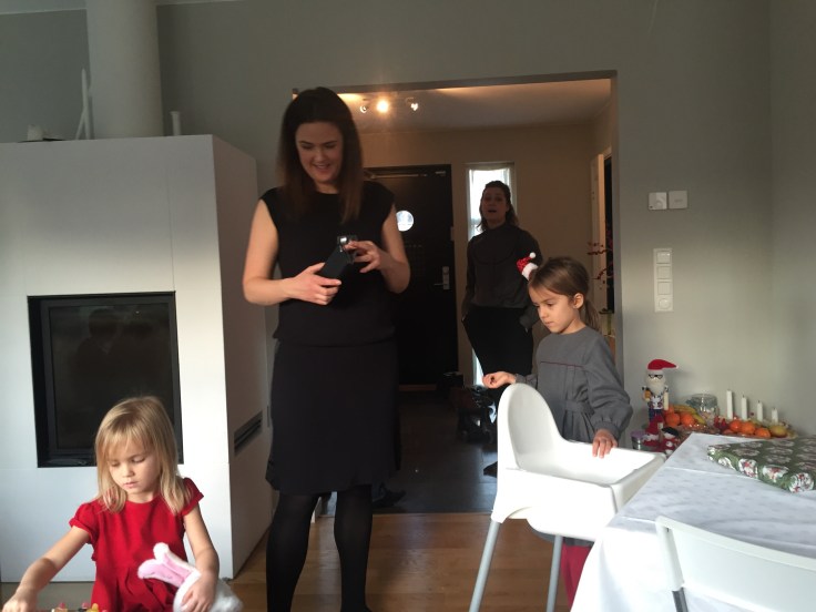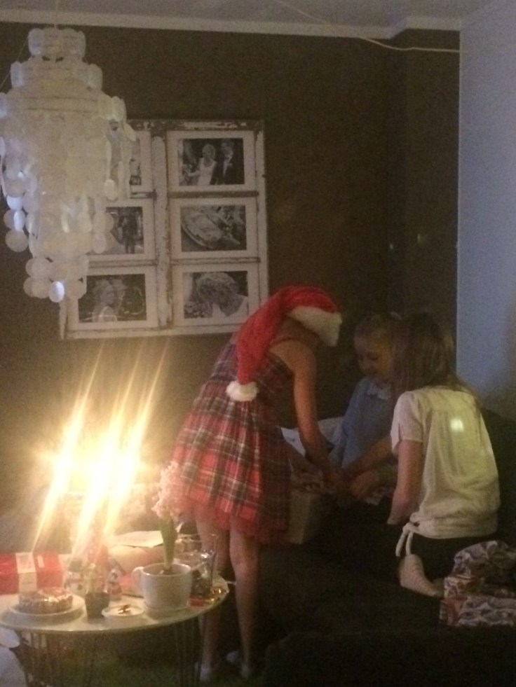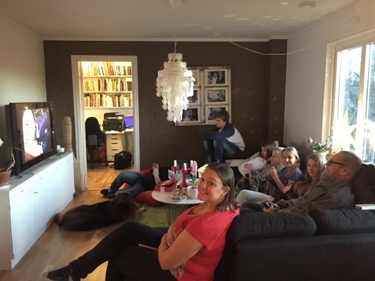 Efter frukost på julafton packade vi in alla i bilen och åkte över till Magnus kusin Elin och hennes man Ralph för att fira mini ”Olssons”-jul. Innan barnen kom firade vi alltid Magnus julafton hos Olssons. Nu är vi så många så nu träffas vi och fikar en stund innan Kalle Anka. Helt galet att dom får in alla igentligen;