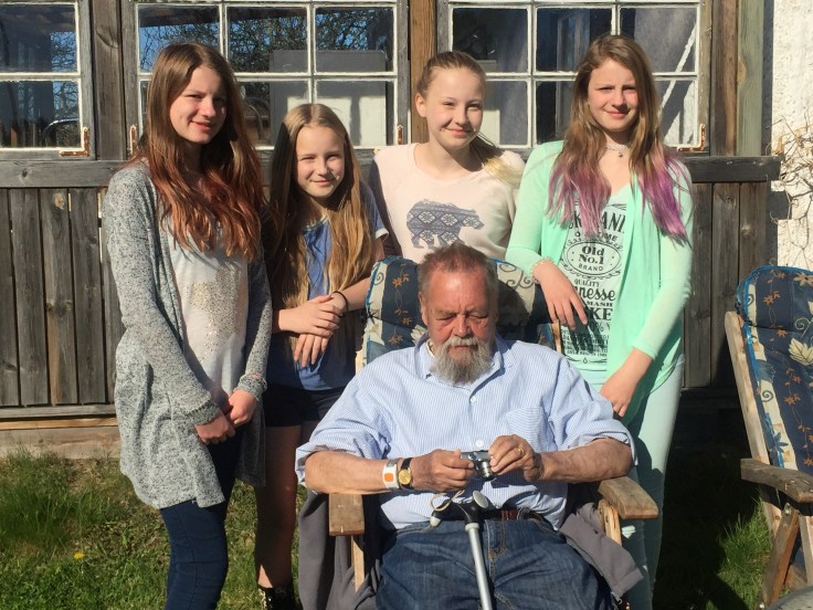 Farfar sitter och solar pÄ Löten omringad av alla tjejbarnbarn. Sonny och Henric har varit ivÀg pÄ Gokarthelg sÄ ett barnbarn saknas pÄ bilden.