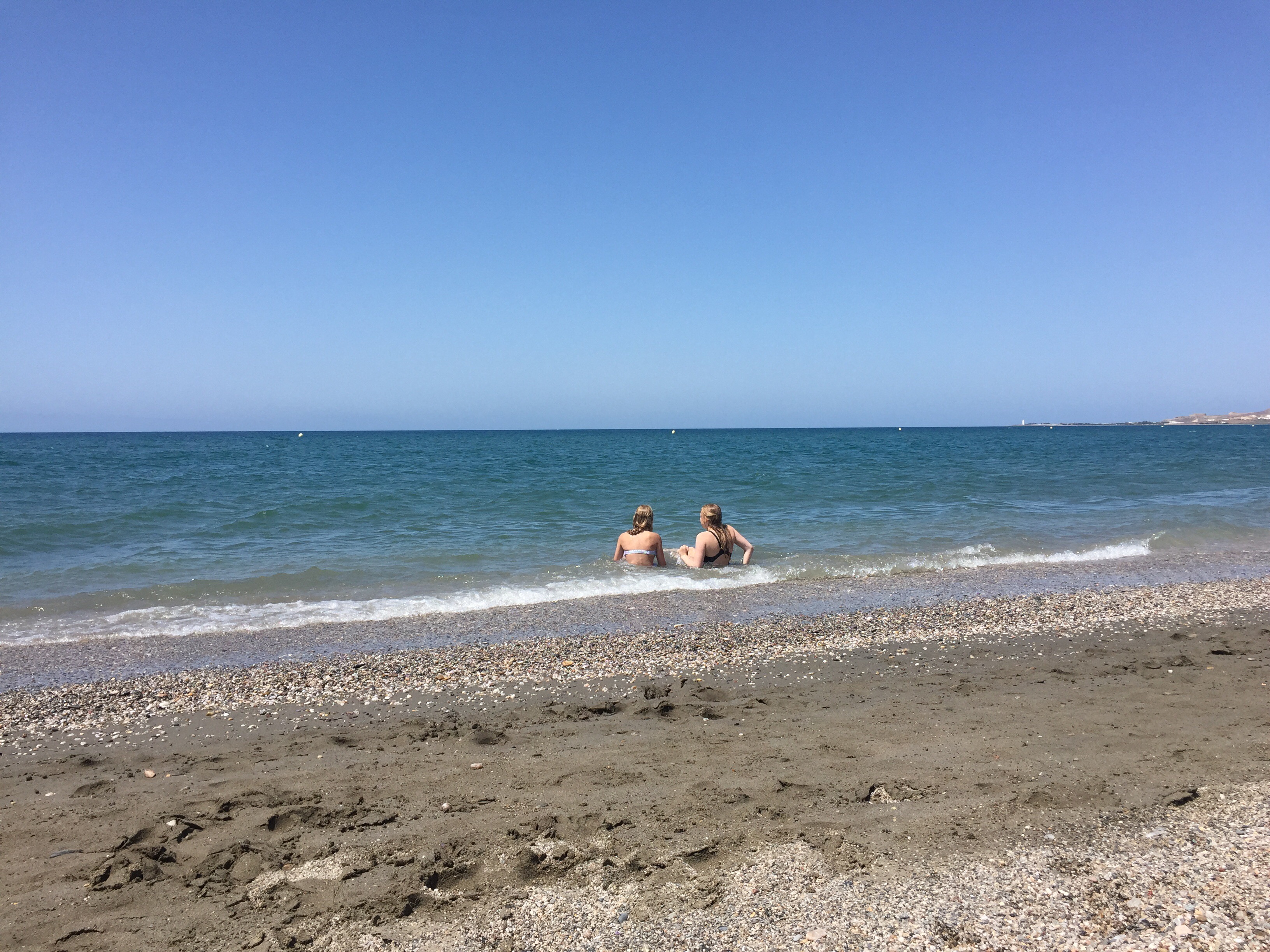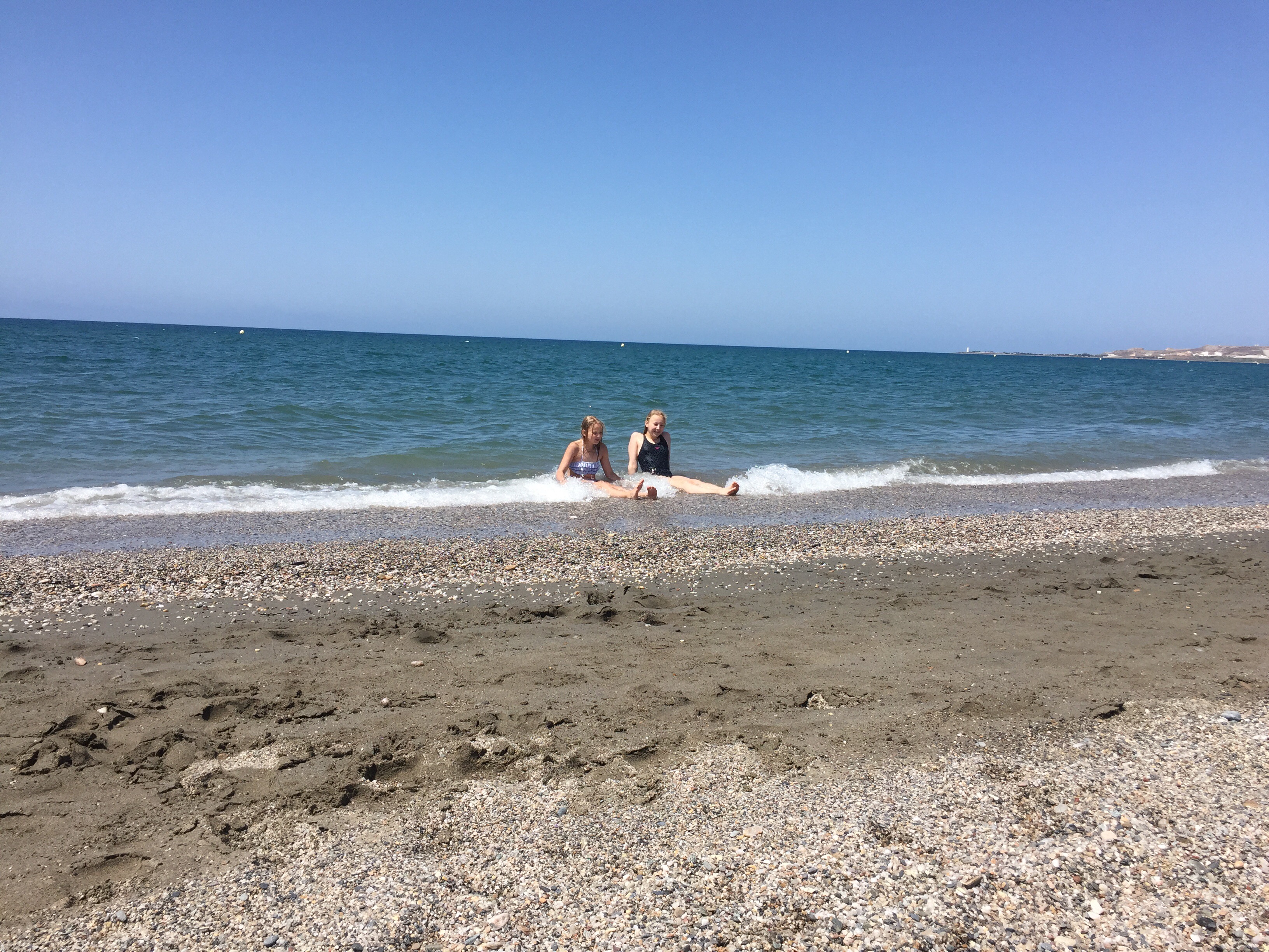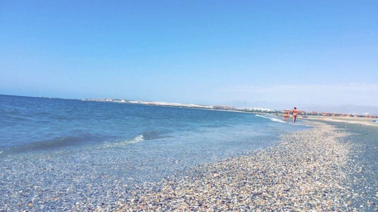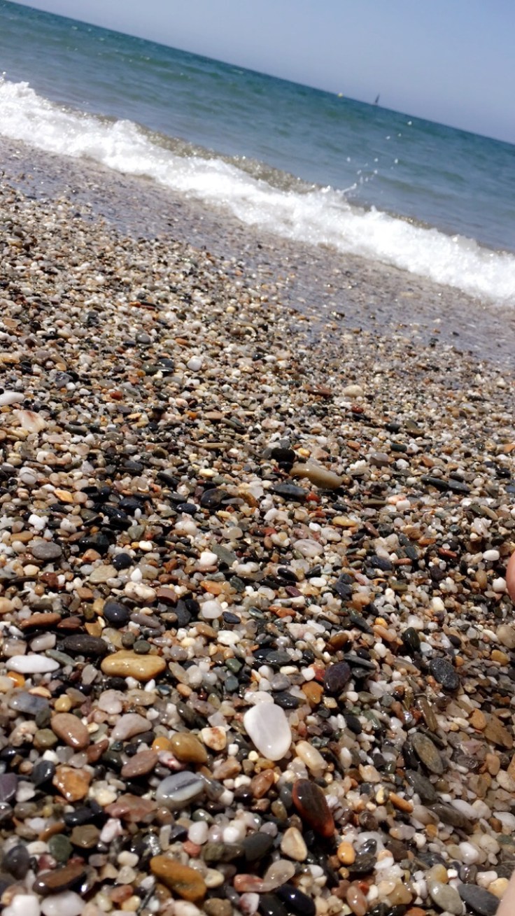 Den här stranden är lång, mest sand men med en sträng av lena stenar och snäckor.
