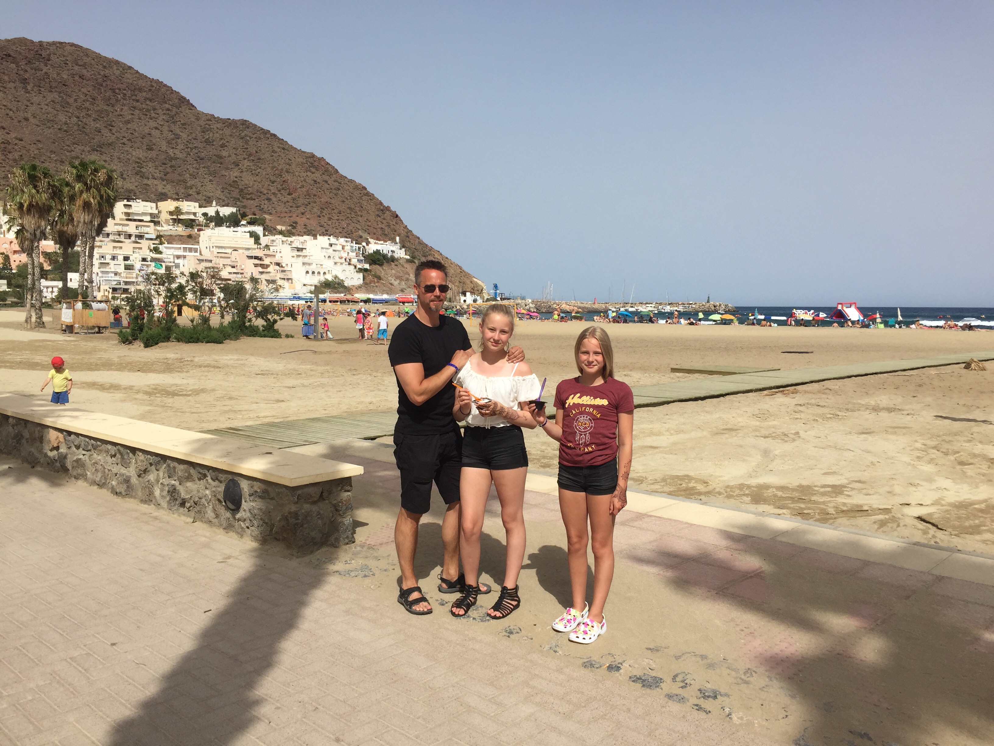 Familjen nere vid stranden och strandpromenaden som kantas av fina palmer.