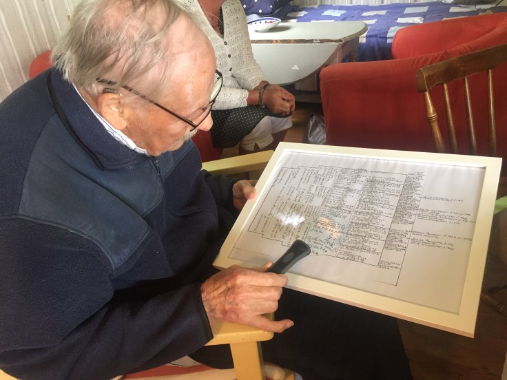 Pappa studerar släktträdstavlan som börjar med min farmor Adina.