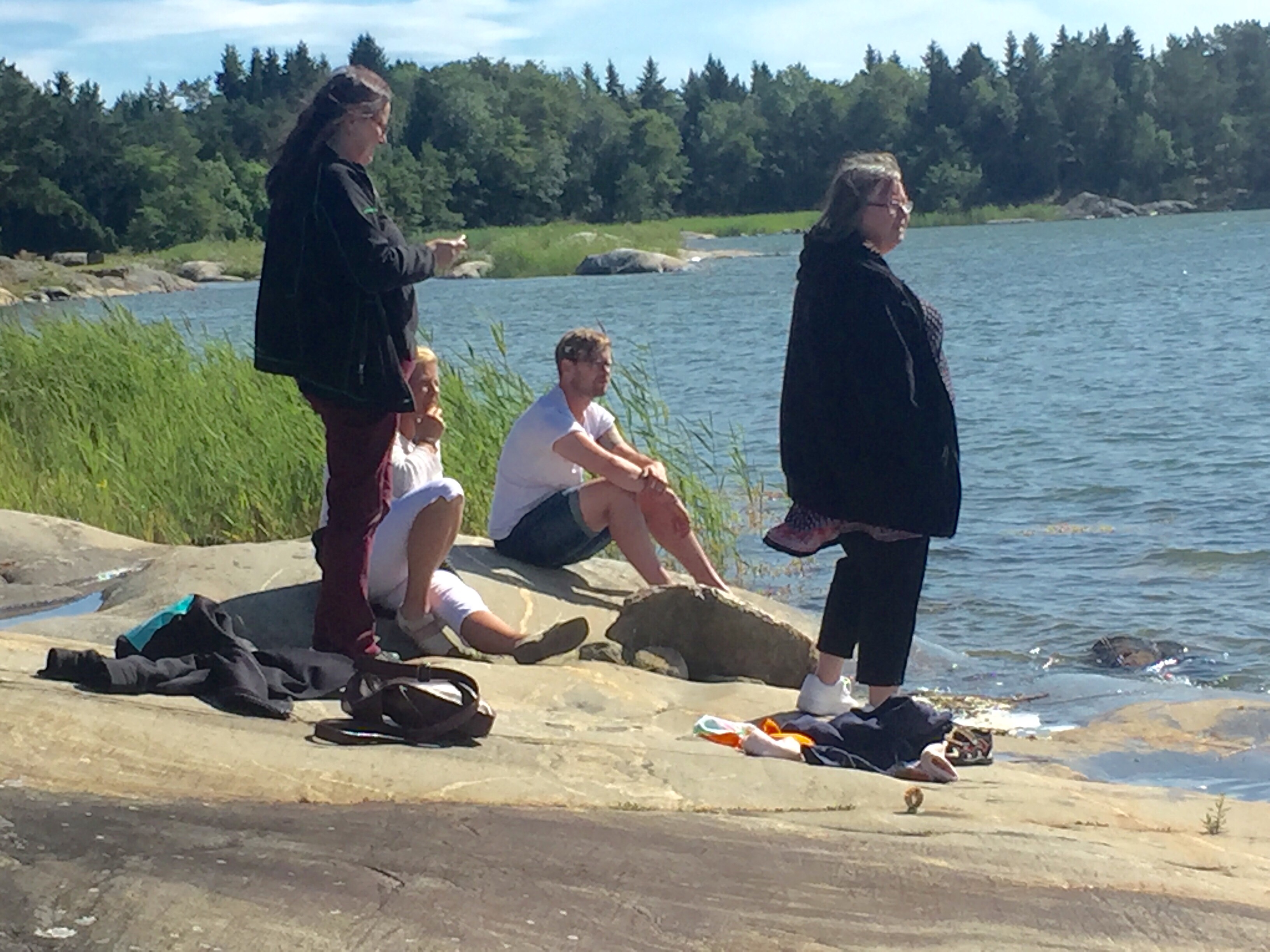 Robin, Agneta, Molly (Robins) och Nina. Molly tyckte det var toppen att kunna bada. Hon låg där och guppade hur länge som helst och verkade inte tycka att det var kallt alls ”om jag flyter iväg här så kan pappa simma och hämta mig”. Klipporna ner i vattnet var kul också ”det är nästan som vattenrutschbanor här”😊