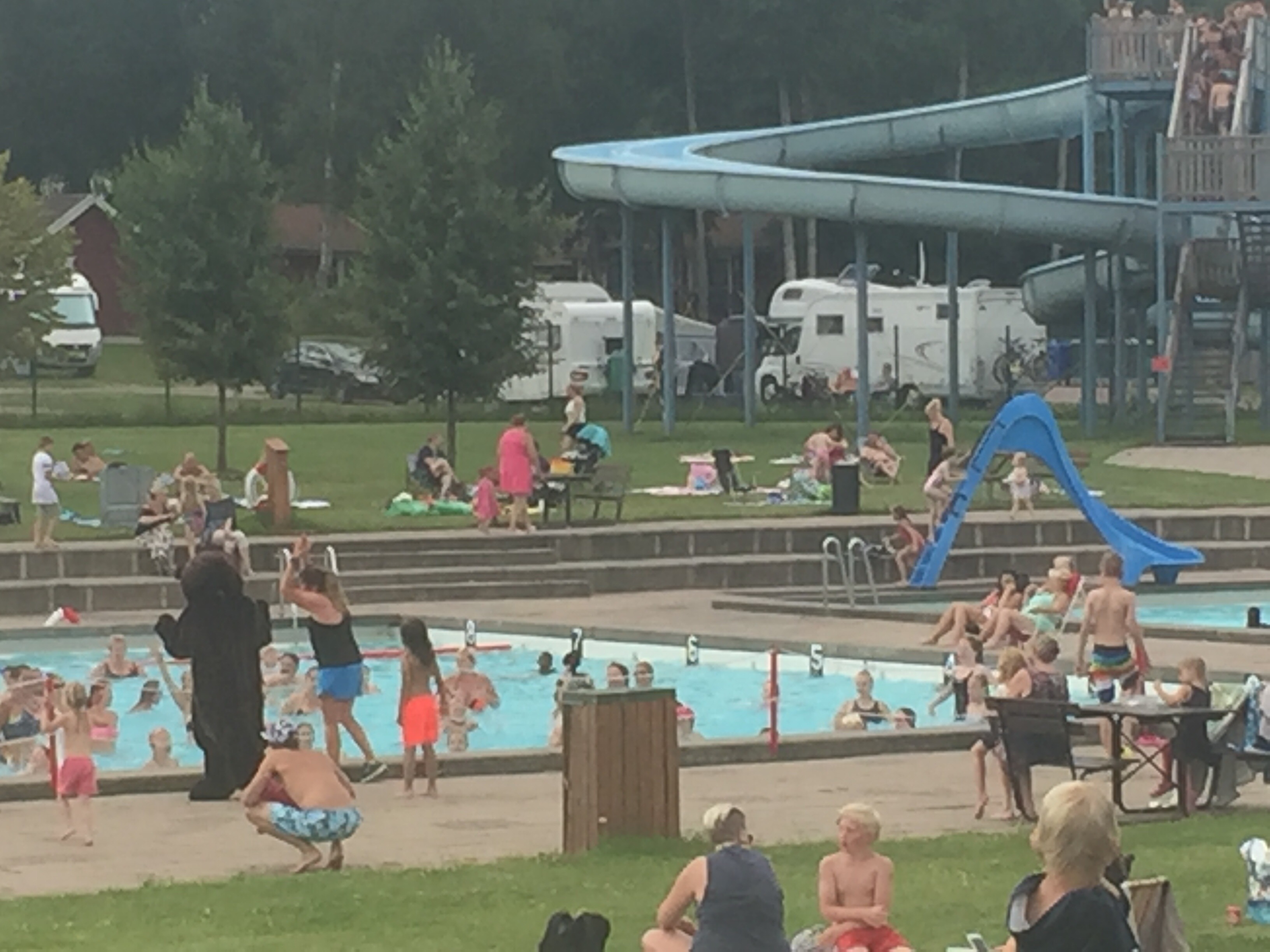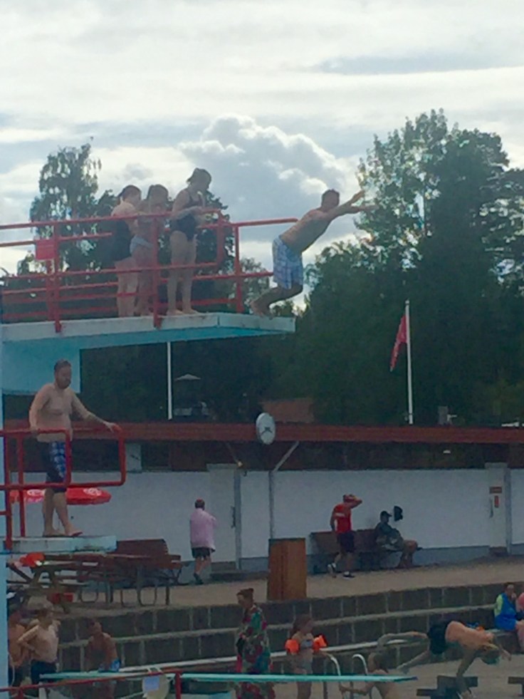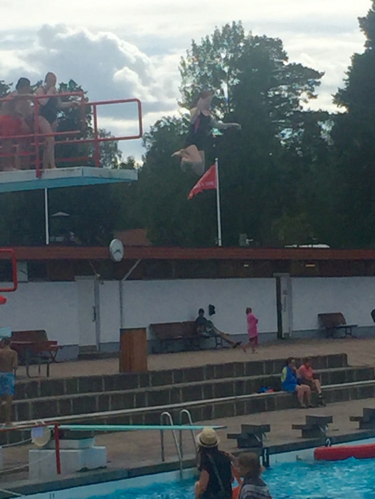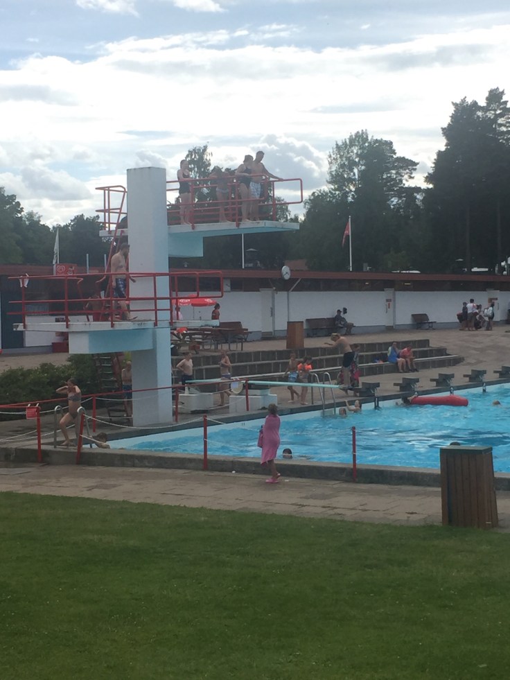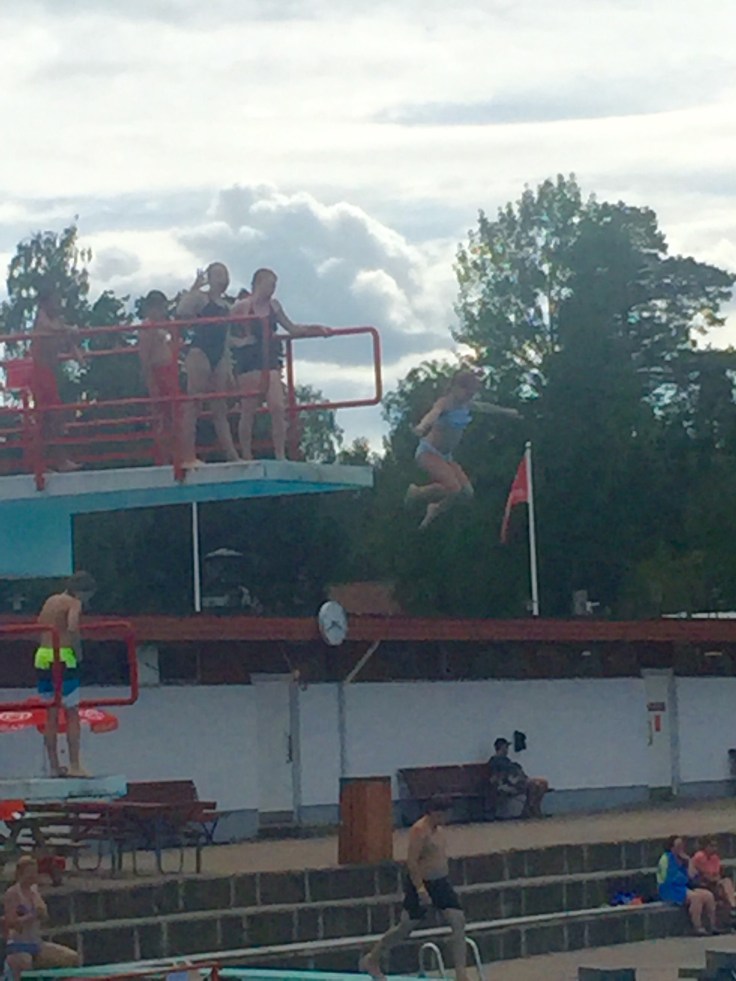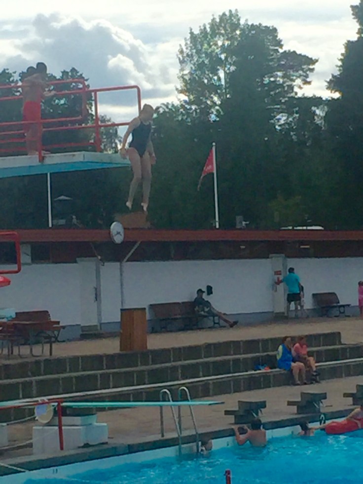 Dagen efter hängde vi med till Skantzöbadet där de hade både hopptorn och vattenrutschbanor. Här står Magnus, Lina , Engla och Tove på rad för att hoppa från 5:an, vilka tokstollar!