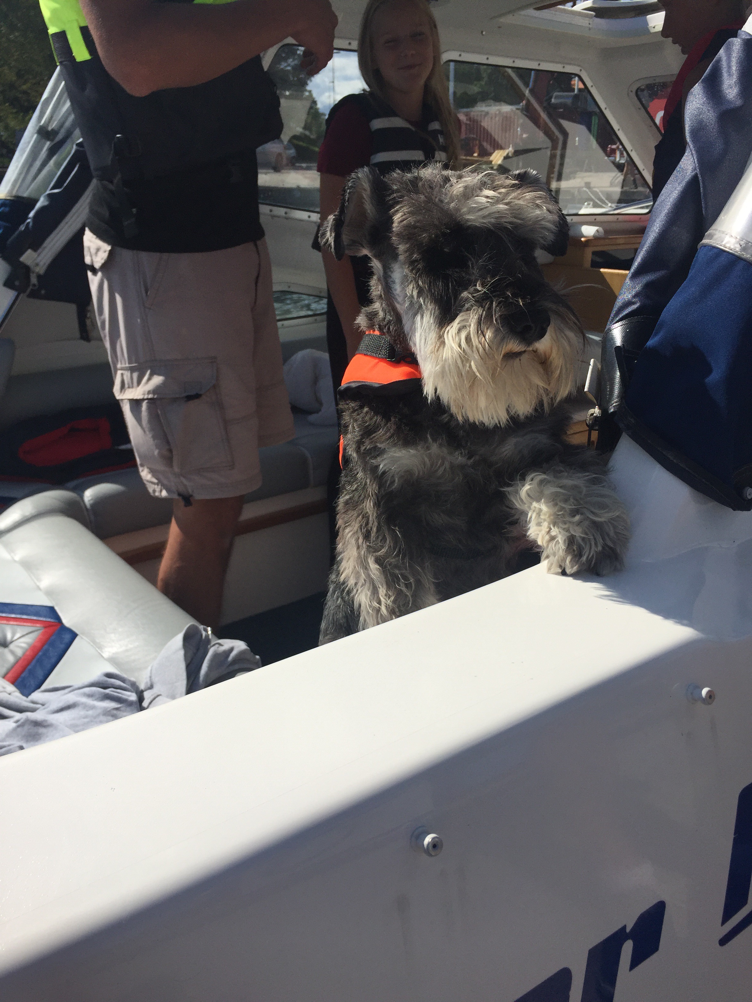 Skeppshunden Pepsi lutar sig lite coolt mot kanten och kollar in läget i hamnen😊