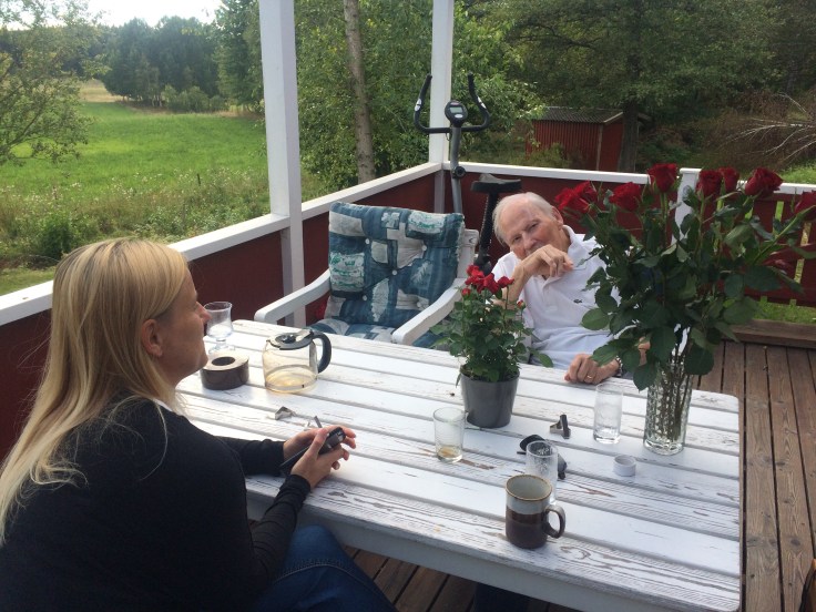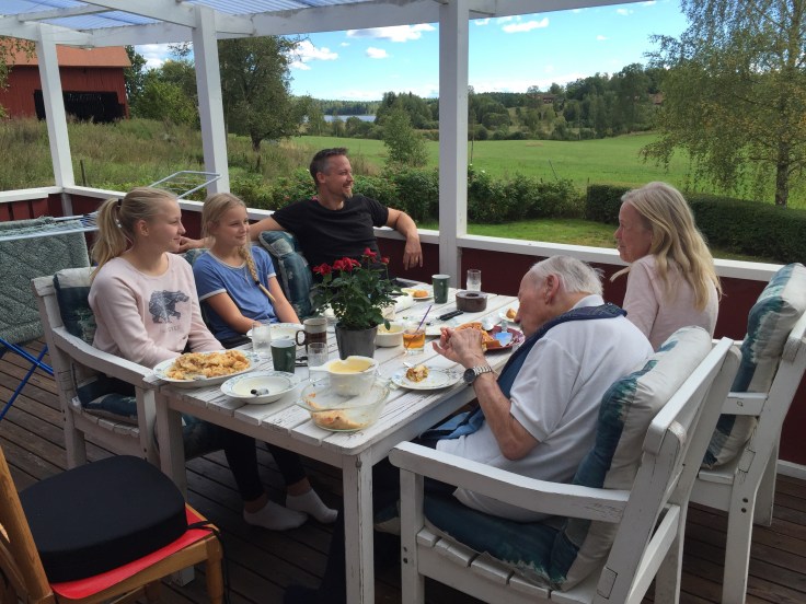 Nu är vi på väg hem igen efter dagens utflykt till Södermanland där vi har firat pappa som fyllde 88 år i fredags. Gunilla bjöd som vanligt på jättegod mat och tre!!! olika sorters äppelkakor (en tror jag syster Annika hade bidragit med😊). Äppelkaka är det bästa pappa vet så det kunde inte bli bättre. När jag var liten sa pappa att äppelkaka skulle jag inte äta, citat ”nej fy, det smakar fotosken och dieselolja, så det ska du inte äta”. Det tog ett tag innan jag vågade prova, men uj vad sur jag blev då när jag insåg att det var jättegott och att pappa hade sagt så för att han skulle få allt för sig själv! 😏 Jag antar att man får skylla mig själv om man går på en sån sak🤔