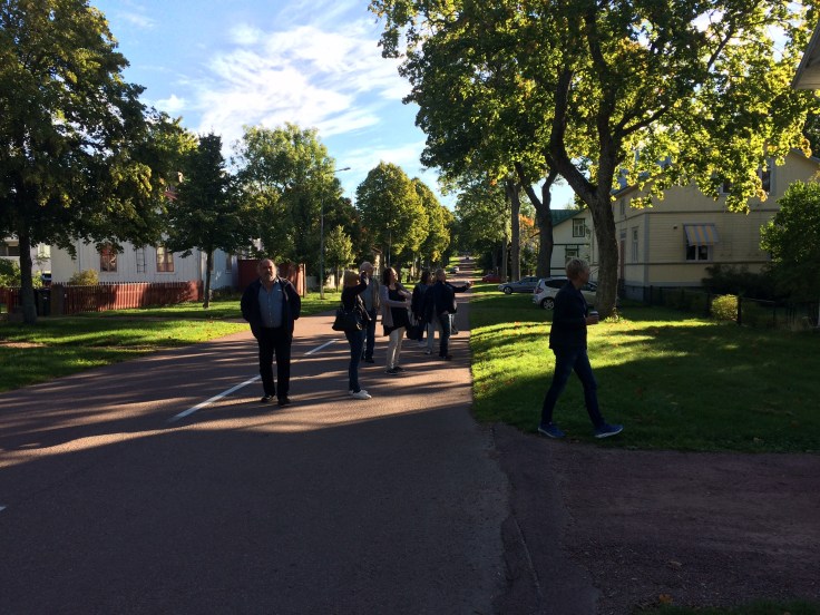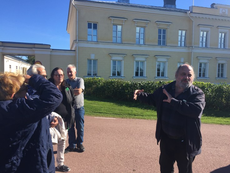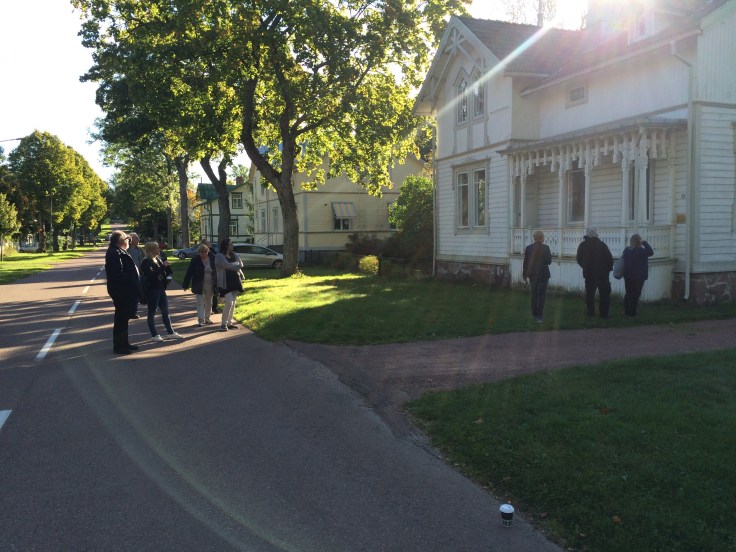 Söndag morgon gav vi oss ut på sightseeingtur i Mariehamn. Här är vi utanför ett av Hilda Hongells hus. Hon var Finlands första kvinnliga arkitekt. Hon hann rita ett stort antal bostadshus i Mariehamn under 1890- och 1900-talen innan hon gifte sig, skaffade barn och blev hemmafru. Det finns över hundra bevarade ritningar till hus i Mariehamn, varav de flesta uppfördes.