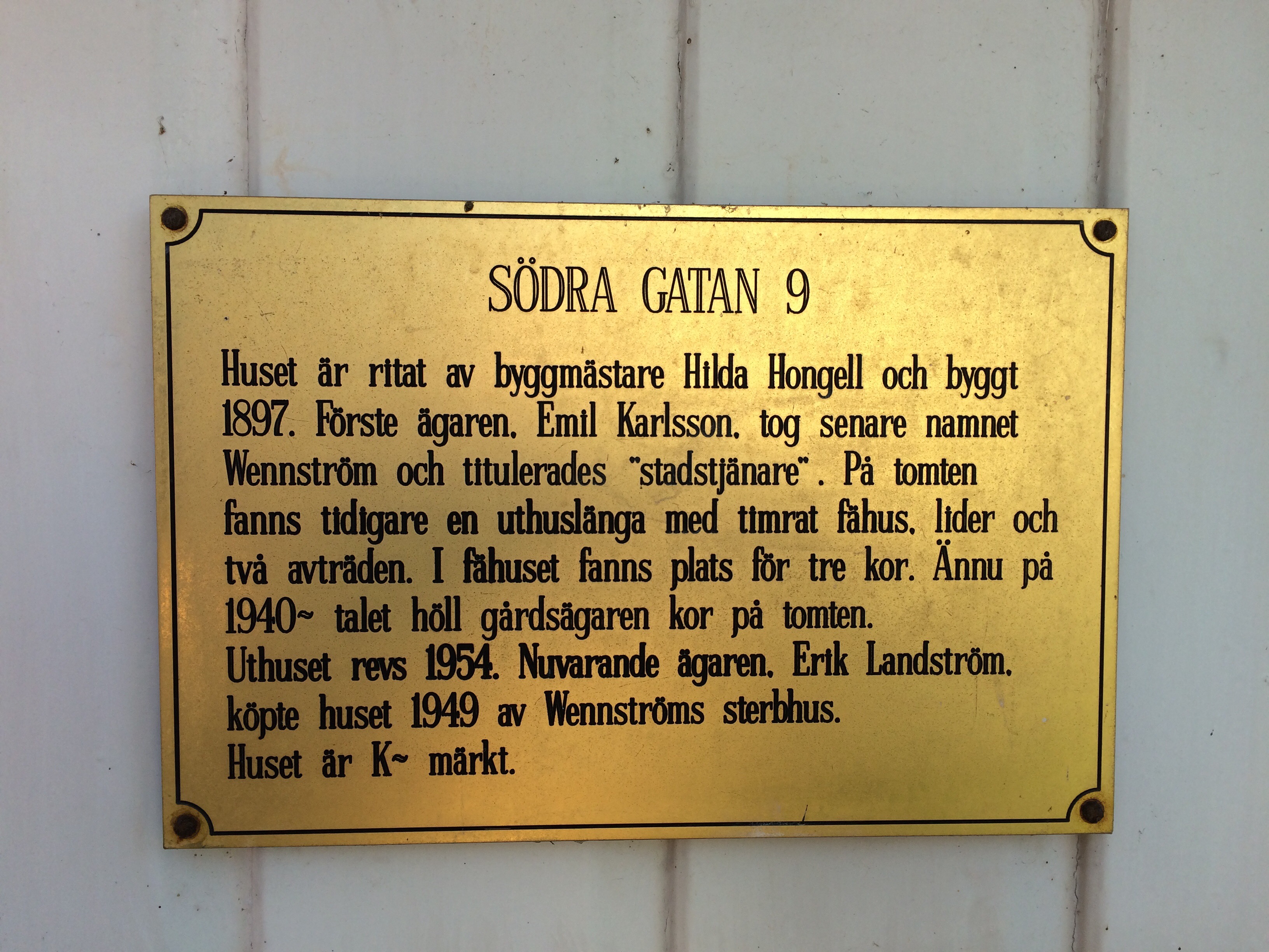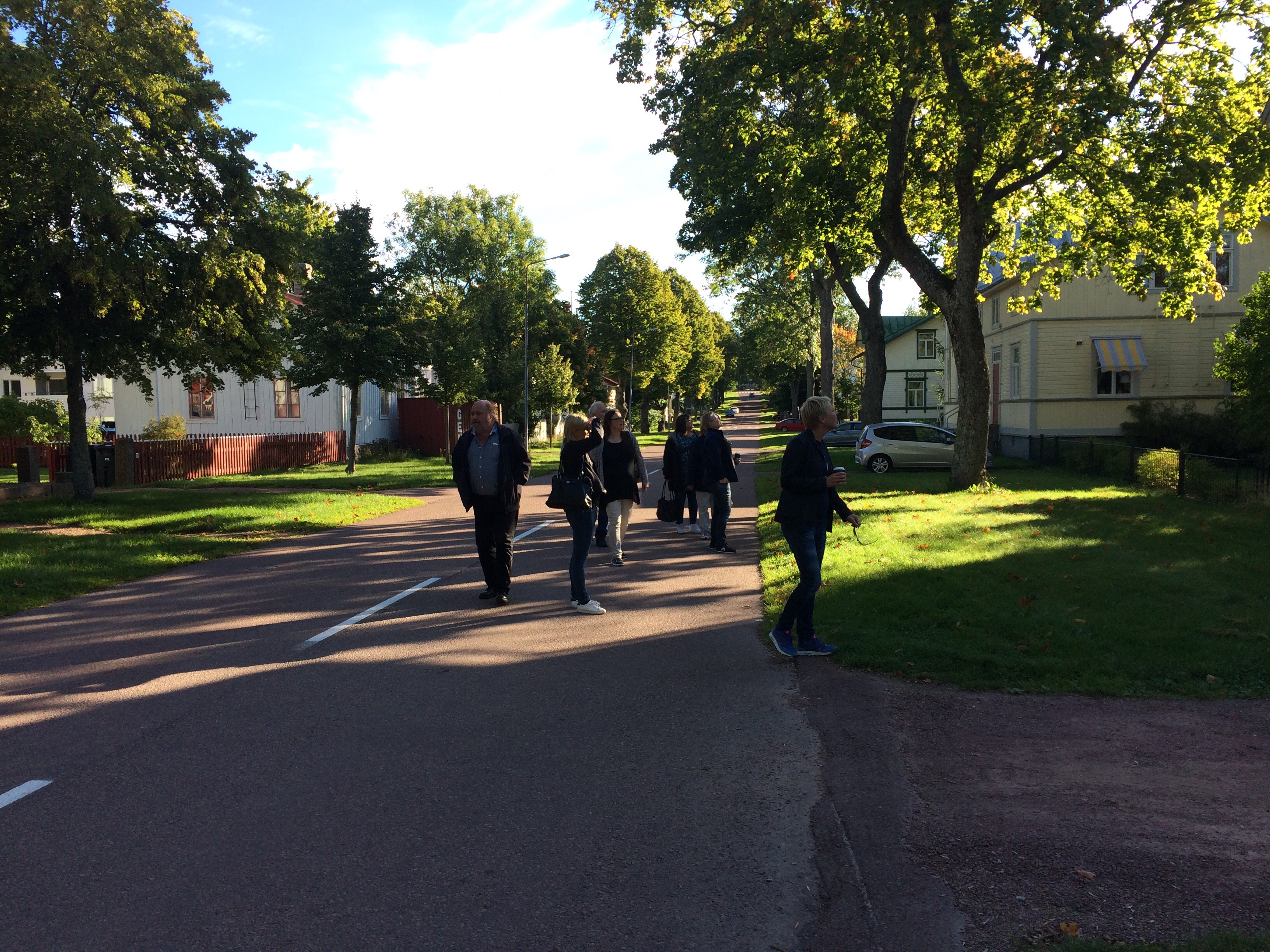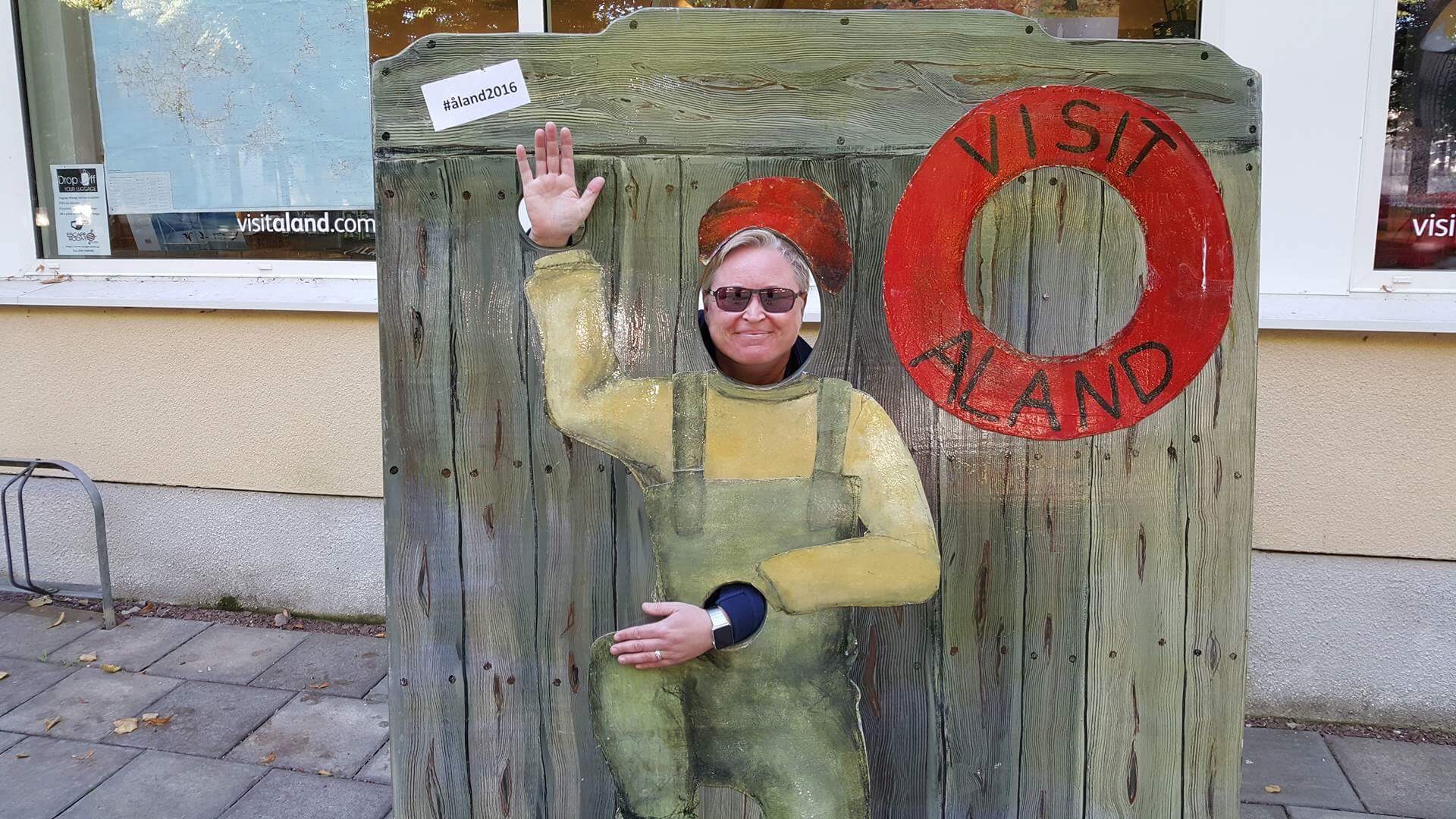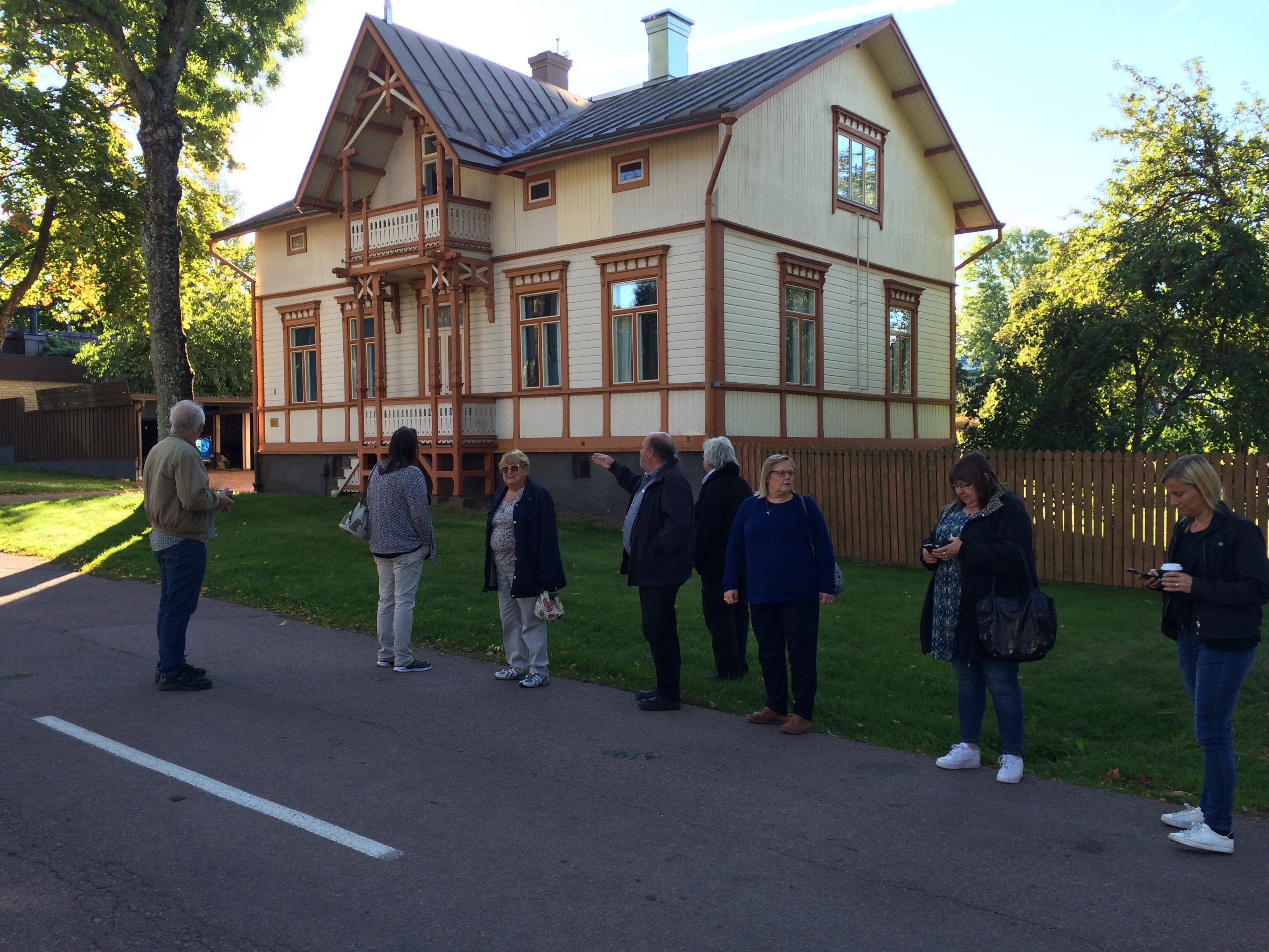 Söndag morgon gav vi oss ut på sightseeingtur i Mariehamn. Här är vi utanför ett av Hilda Hongells hus. Hon var Finlands första kvinnliga arkitekt. Hon hann rita ett stort antal bostadshus i Mariehamn under 1890- och 1900-talen innan hon gifte sig, skaffade barn och blev hemmafru. Det finns över hundra bevarade ritningar till hus i Mariehamn, varav de flesta uppfördes.