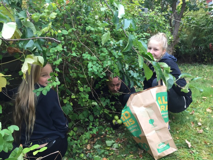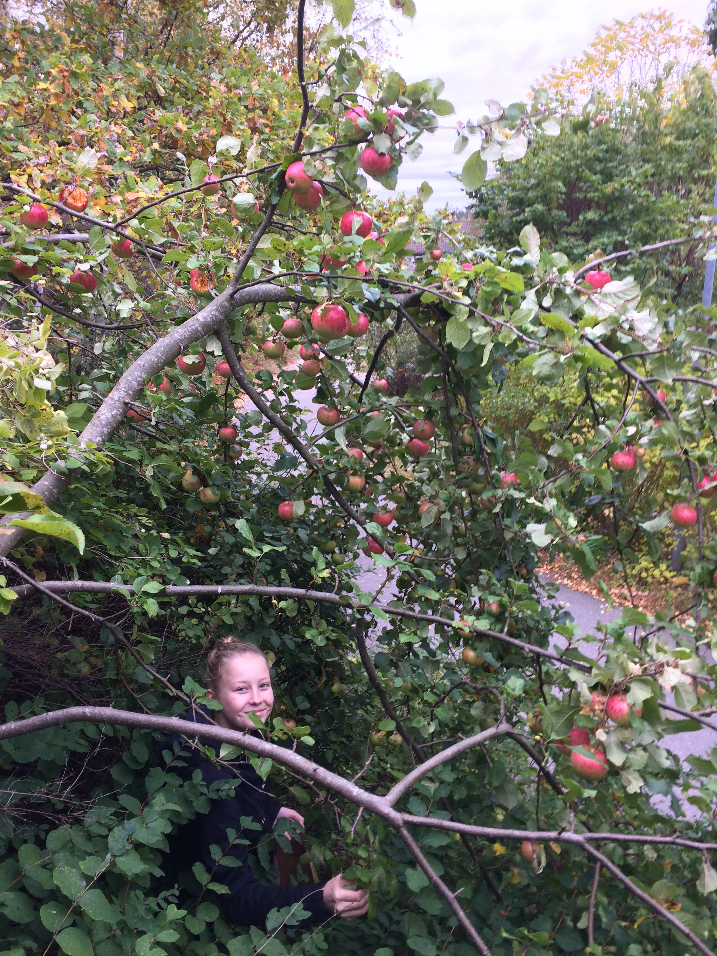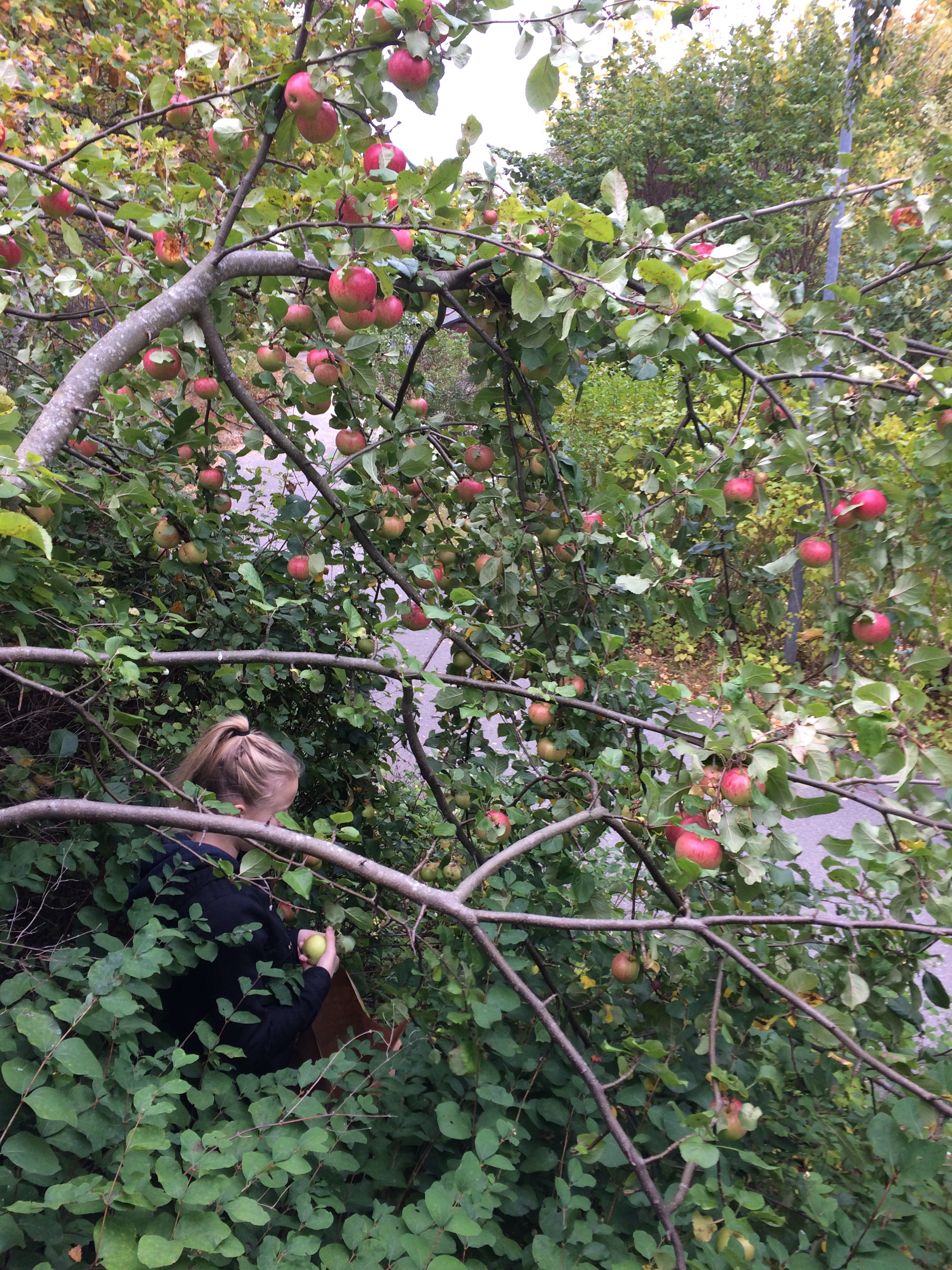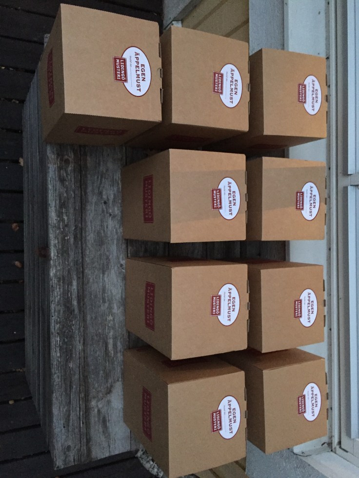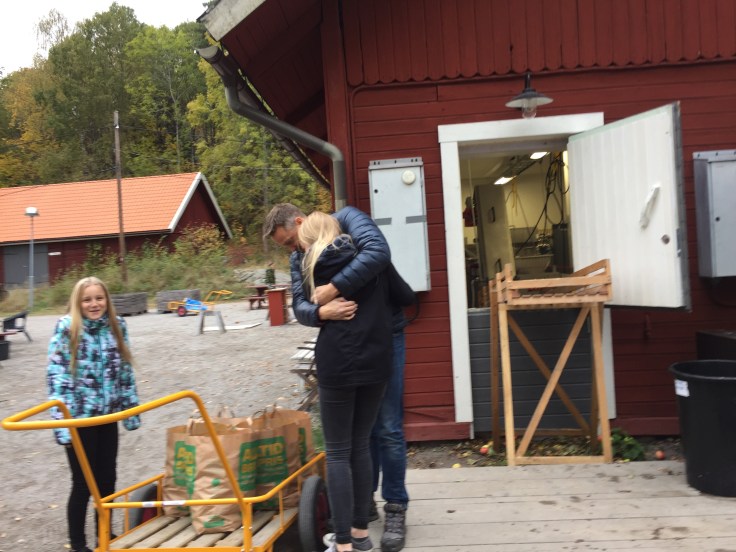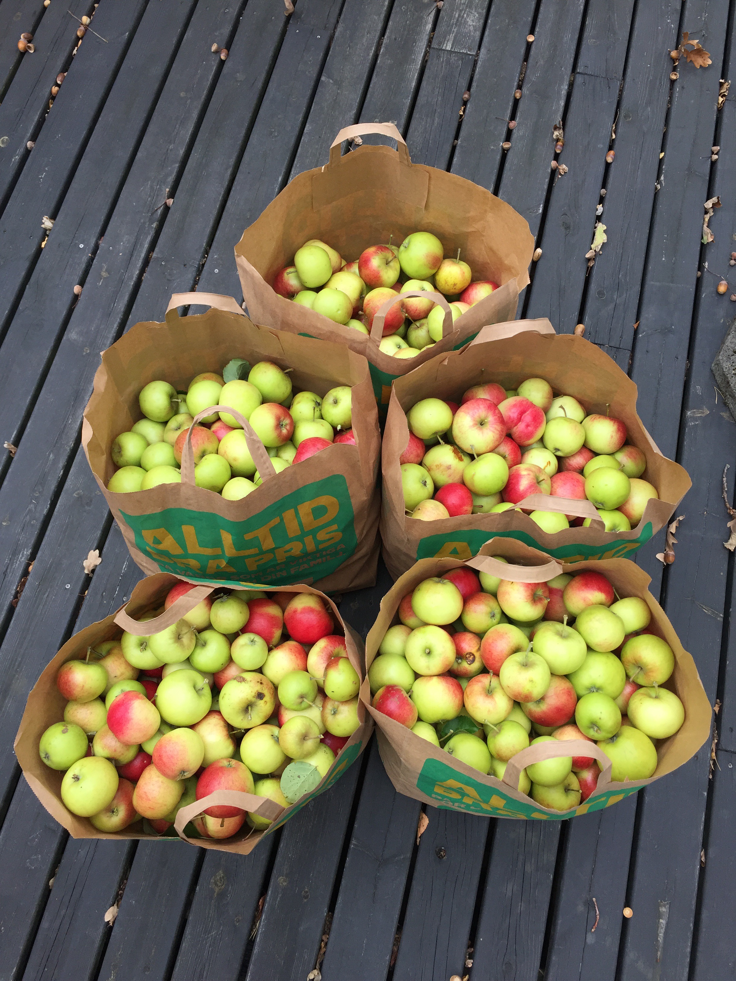 Idag hade vi bokat tid för mustning på Lidingö Musteri. Det är det mysiga stället som min kompis Helena har tillsammans med sin man och en kompanjon. Så imorse efter frukost gick vi ut och plockade av alla äpplen på vårt lilla självsådda äppelträd. 5 kassar fick vi ihop!