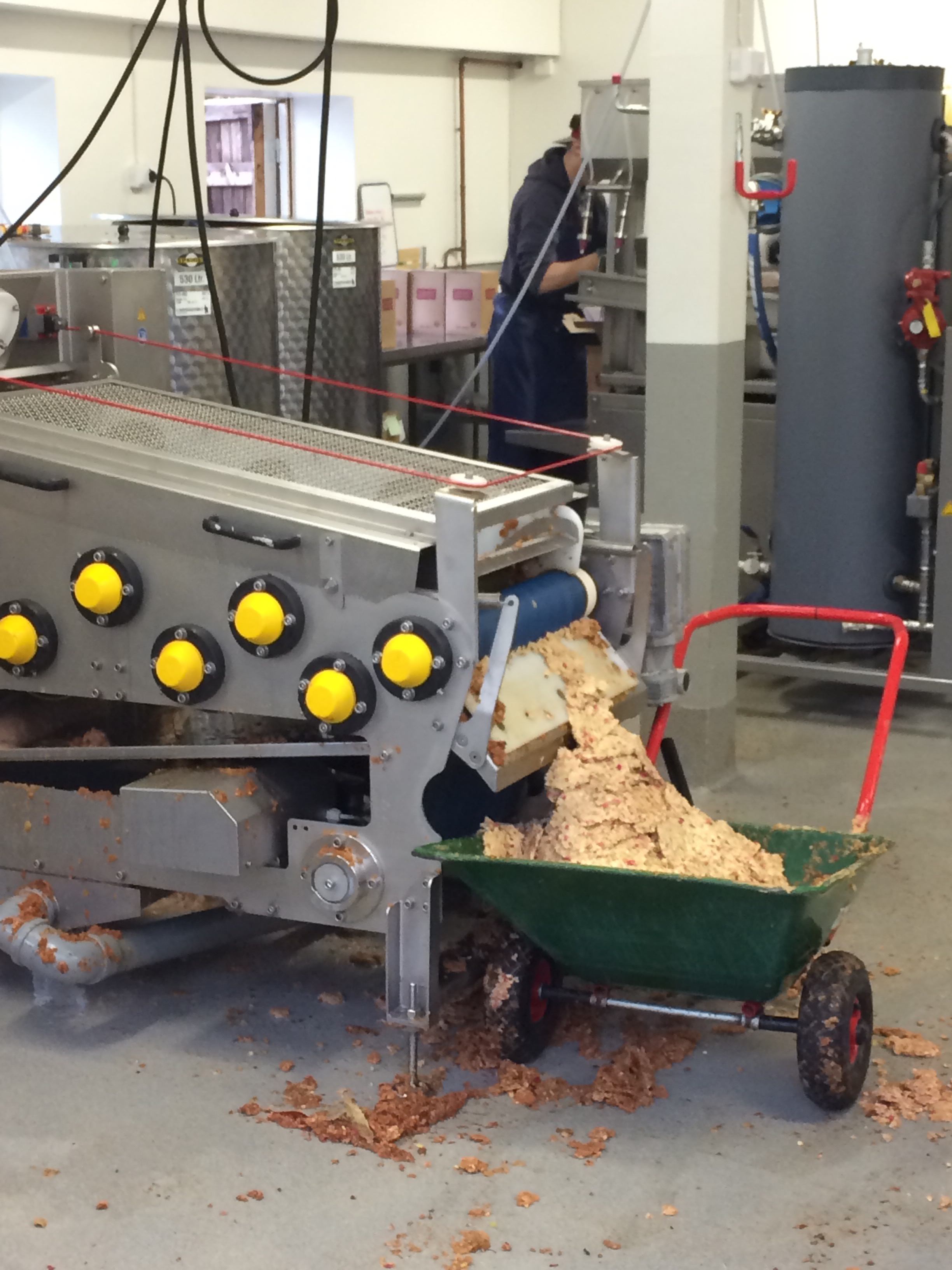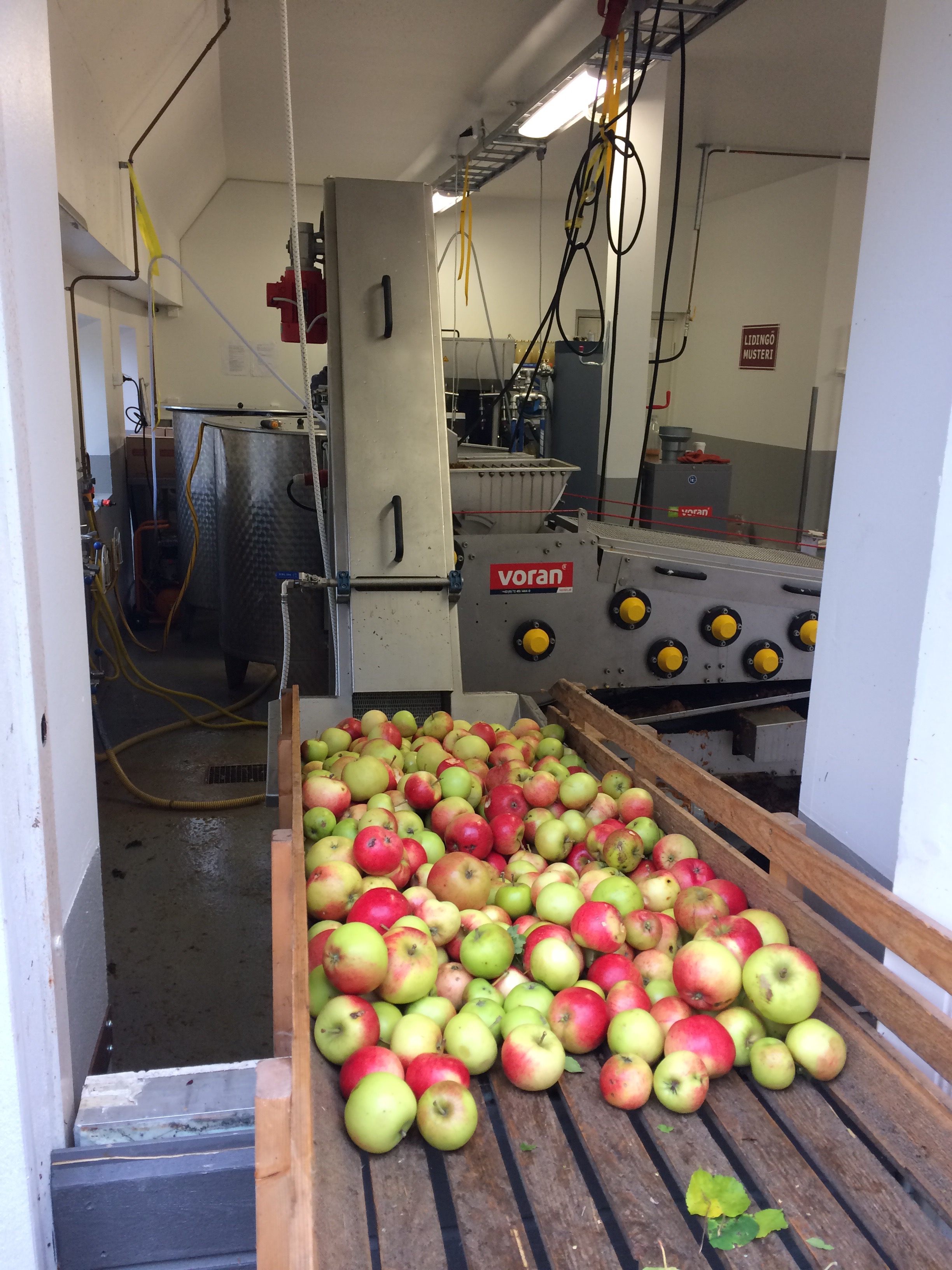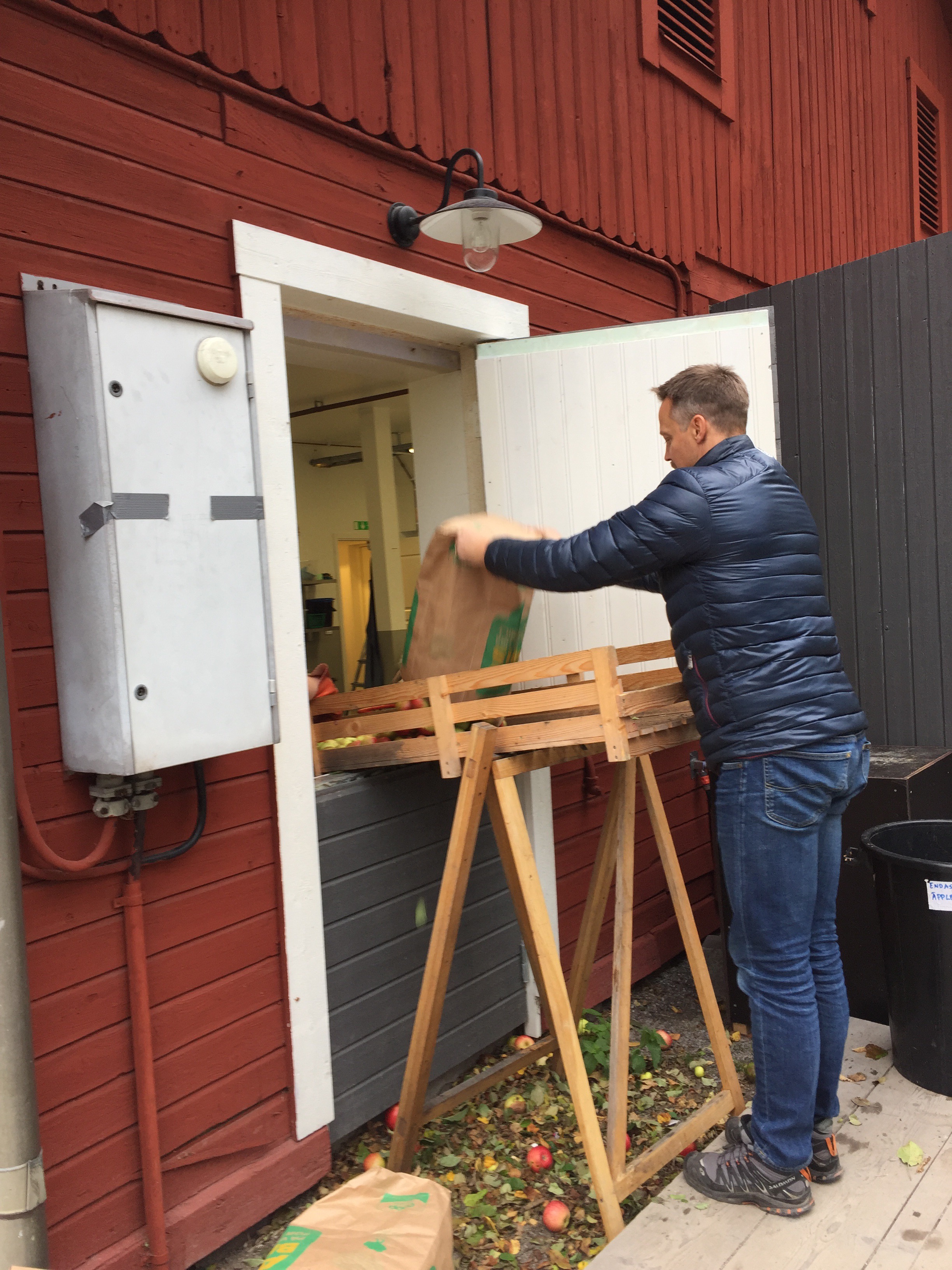 Framme på musteriet lastade vi upp våra kassar på vagn, vägde in (68kg) och ställde oss och väntade på vår tur.