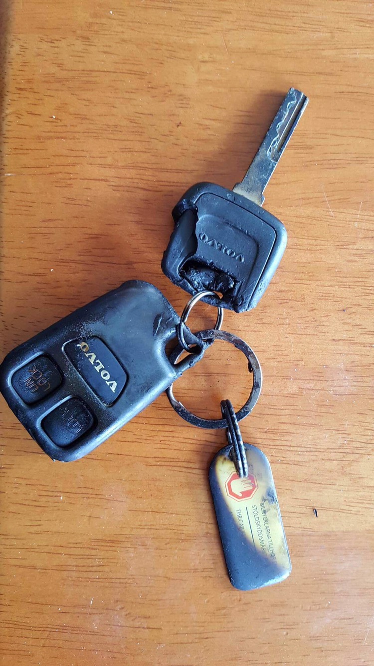 Uppdatering söndag: Annika har varit och pratat med grannen som har bilen. Hon fick reda på att det var grannarna som bor längre bort som just kom förbi som fick ut pappa sista biten. De fick in honom i bilen. Gunilla fick ut bilnyckeln, som den ser ut måste den brunnit när hon tog den. Grannen backade bort bilen. Sen exploderade huset.