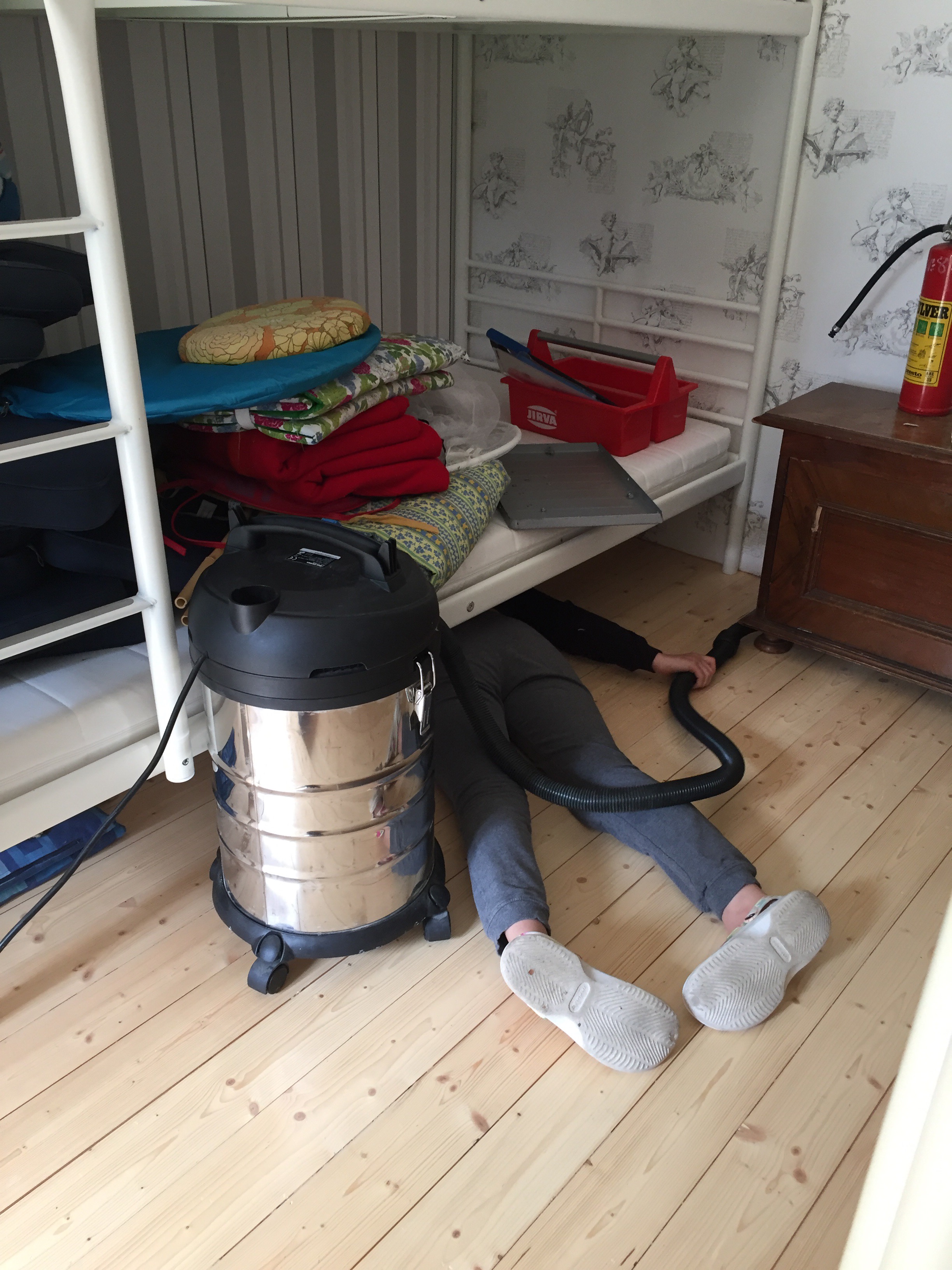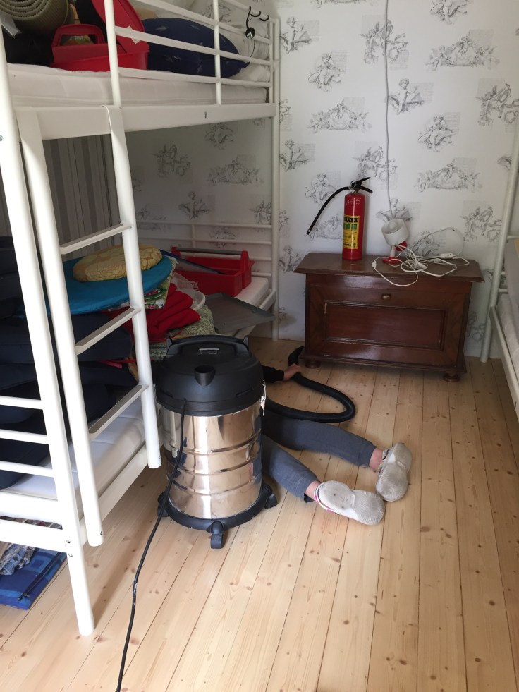 Lina kämpar med dammsugaren medan Tove klippte gräset och plockade blommor.