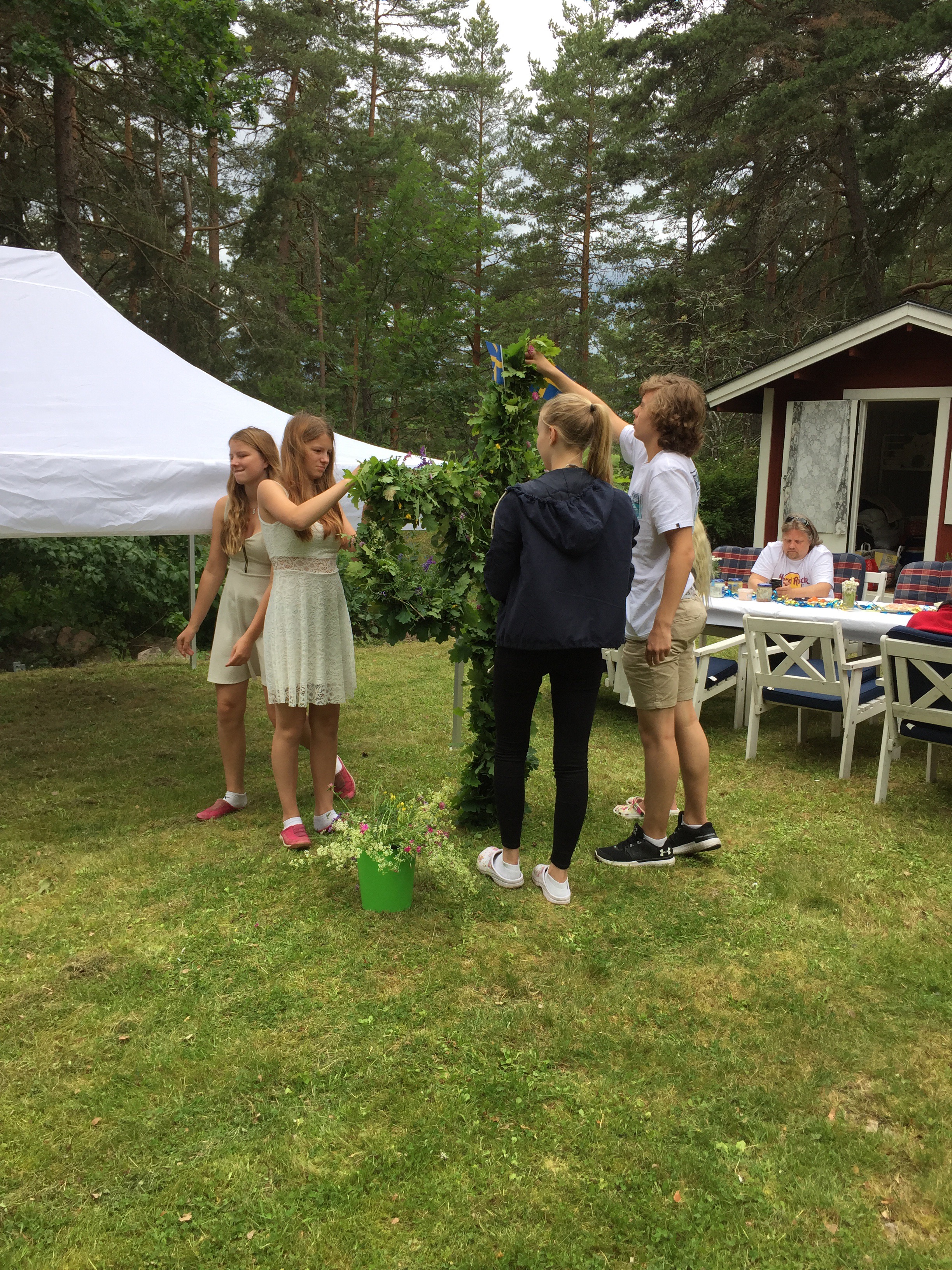 I år har vi firat midsommar i Linköping med Magnus pappa, syrra och barnens kusiner. Sent torsdag kväll, dagen före midsommar kom vi fram. Så fredag morgon studsade vi upp hyfsat tidigt och åkte iväg och handlade frukost, röjde ut gäststugan från gräsklippare, cyklar och diverse andra prylar så att kusinerna kunde sova över, klippte gräset, lagade utemöbler, hämtade sly och plockade blommor till midsommarstången (som för övrigt stod kvar bakom uthuset med all sin skrud från förra året😁), innan alla andra ramlade in med midsommarmat och alla andra prylar vid halv två-tiden😅.