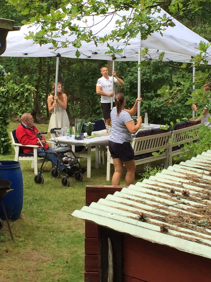 Midsommar utan regn är ingen riktig midsommar, eller hur! Så i lite förebyggande syfte så hade Ingela och Henric, som har kontakter i go-kart världen, fixat värsta sjysta tältet! (vy från kojan😊)