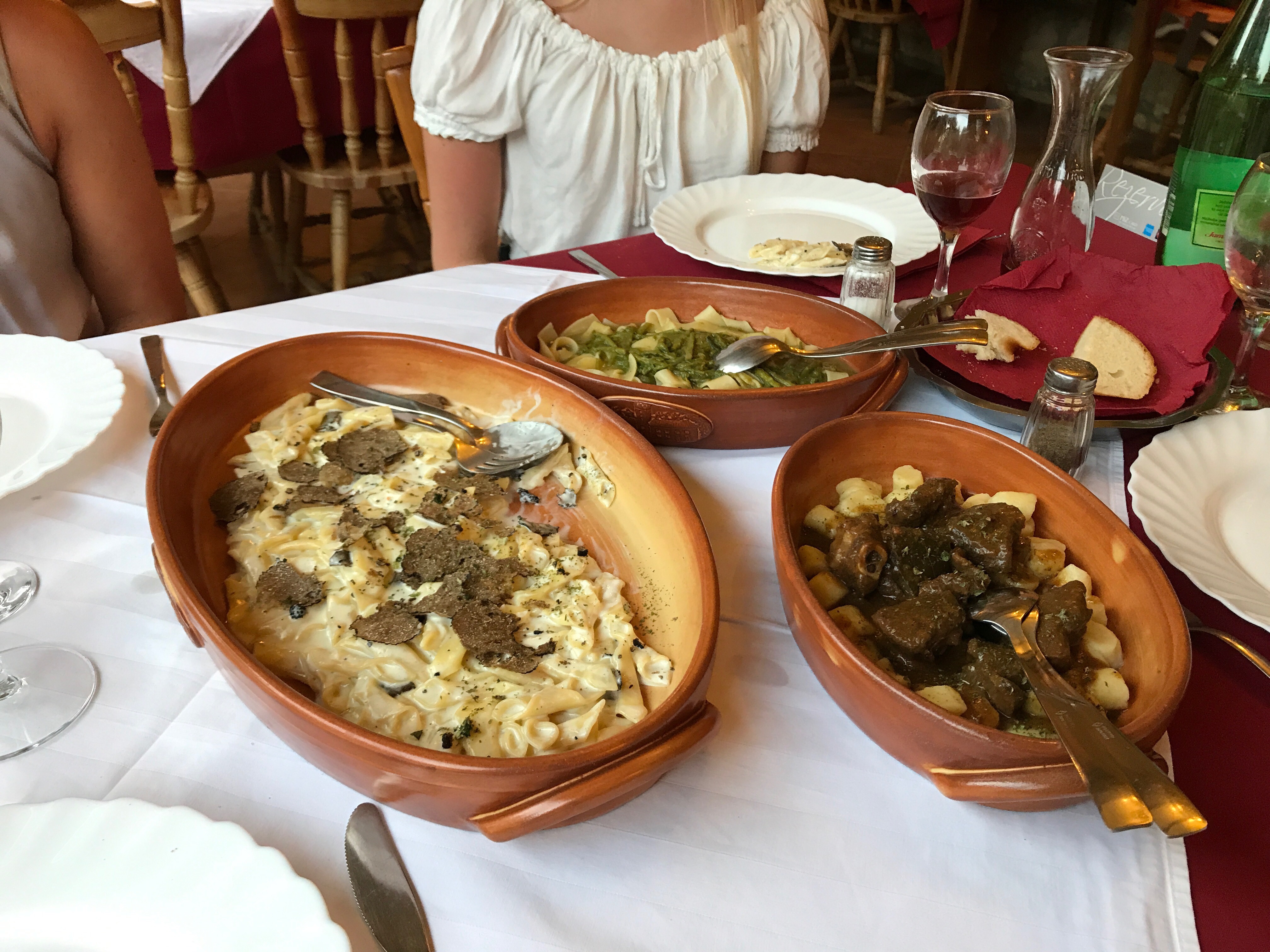 Till förrätt gjorde familjen iordning en plocktallrik med hemgjord ost och skinka. Det var bland annat get och fårost från de ca 100 getter och får de hade och en ost på komjölk med Tryffel från området. Sen var det egen lufttorkad skinka. De berättade att just nu håller dom på med skinkan till nästa år så denna är från förra året, torkad i ett år. Oliverna är också från egna träden. Ricotta och tomatsallad, hembakt bröd och egen olivolja.