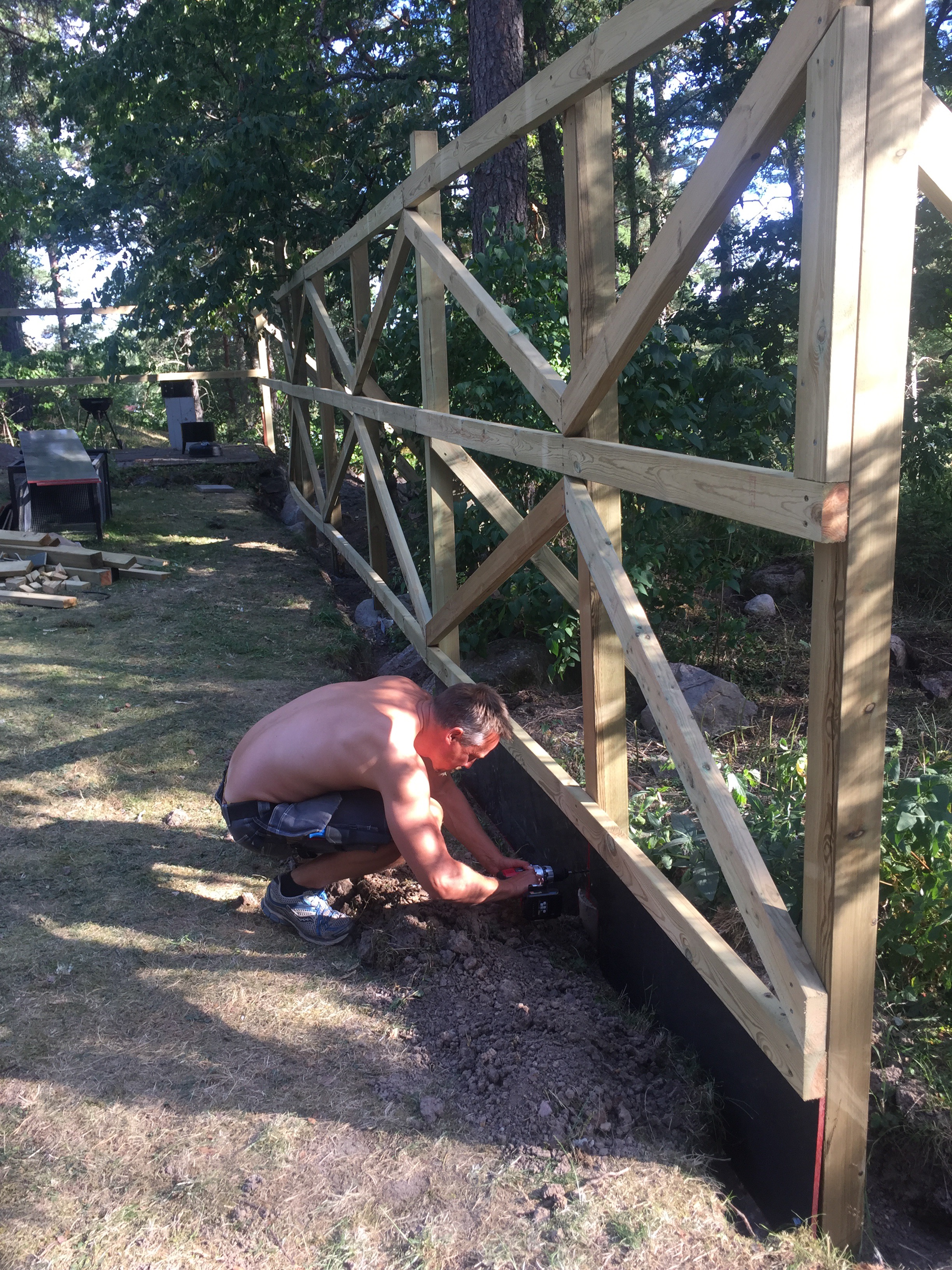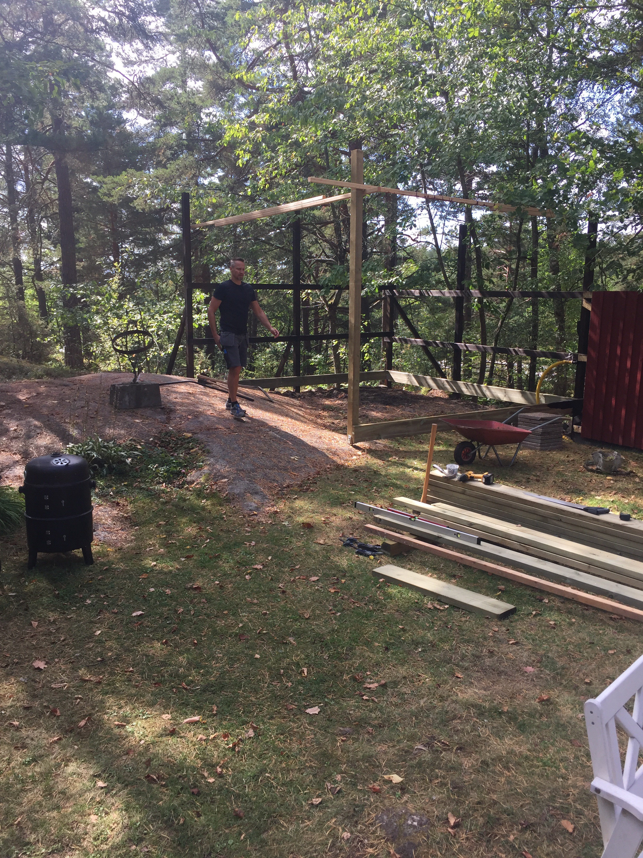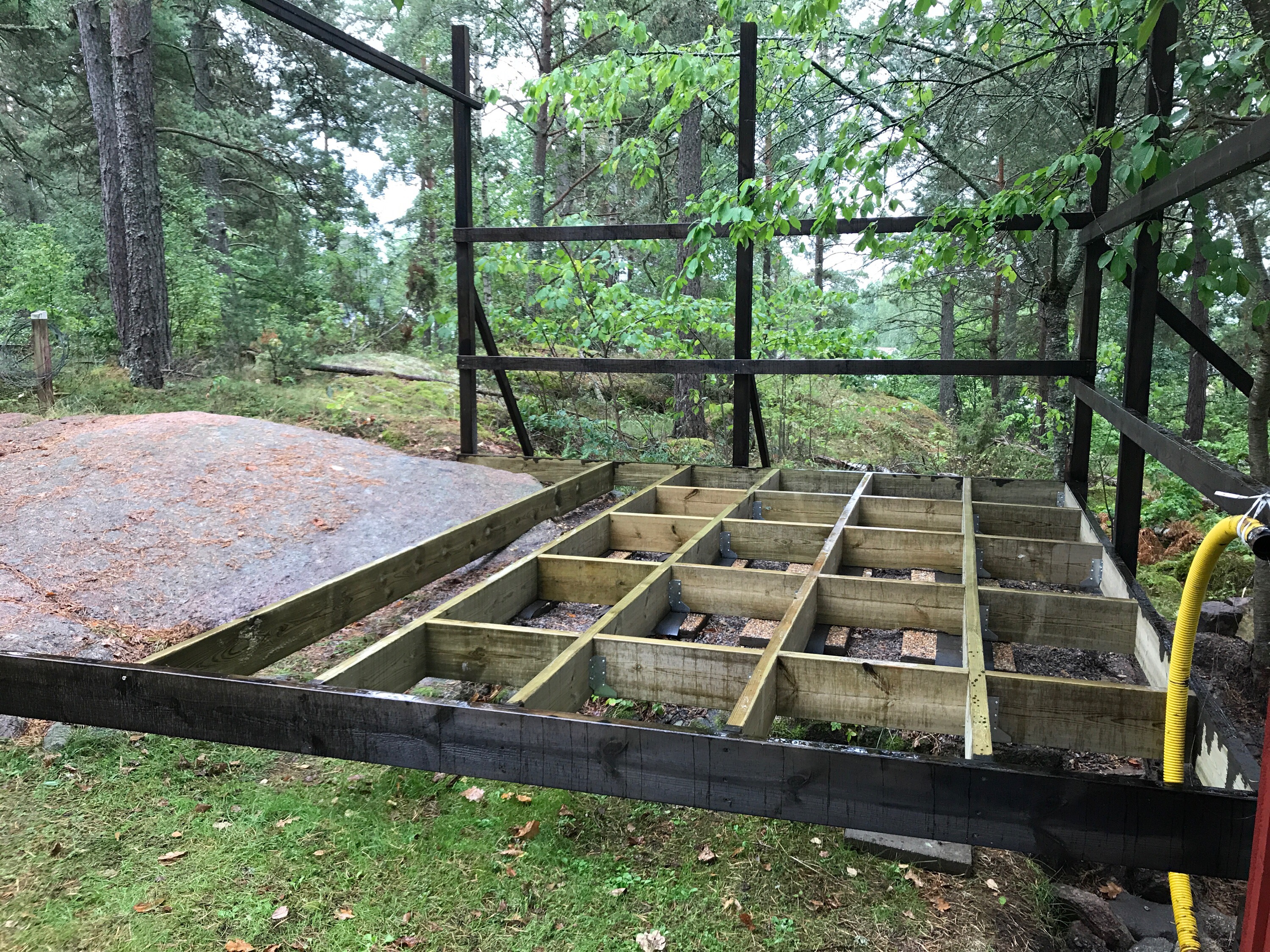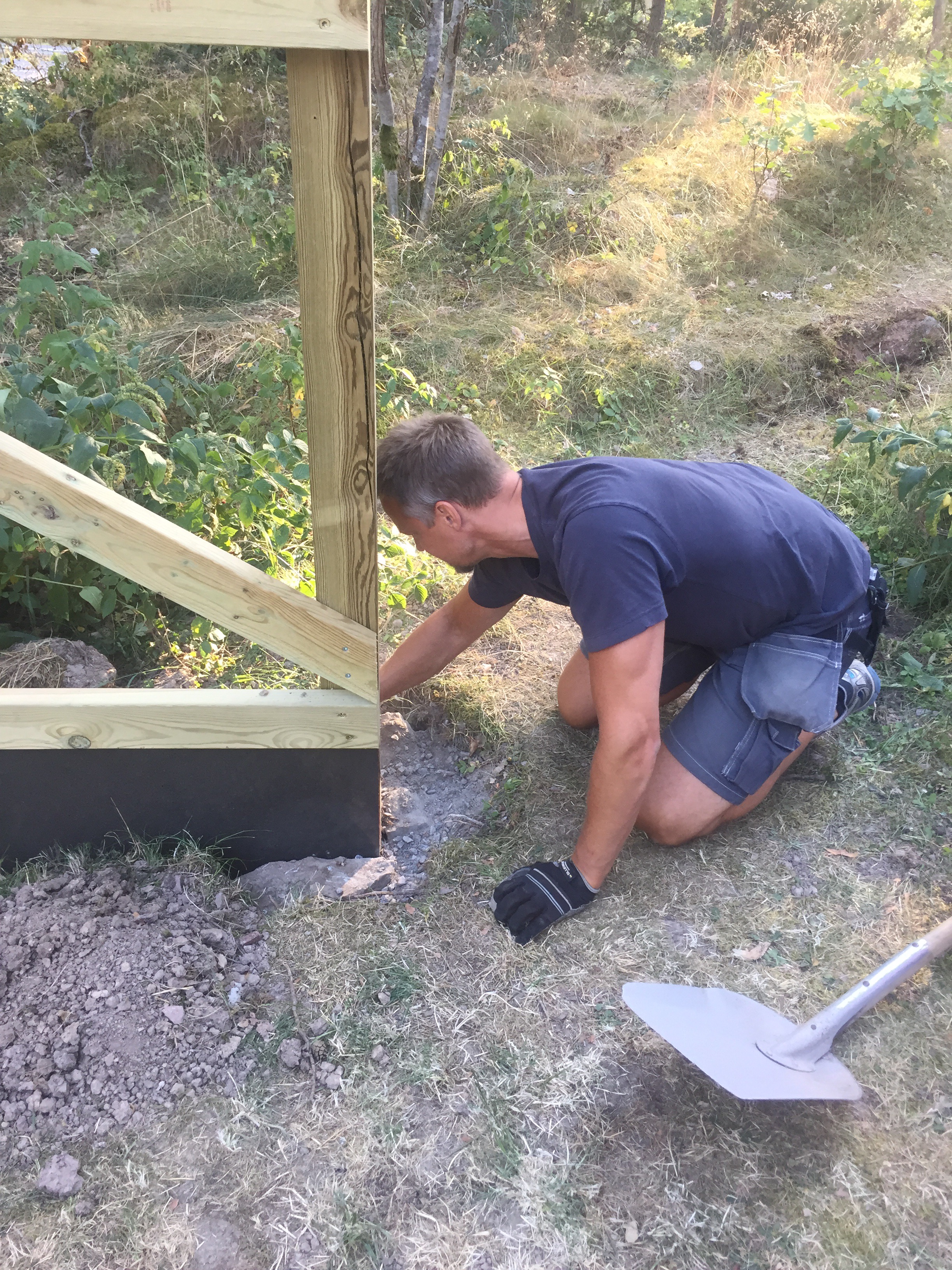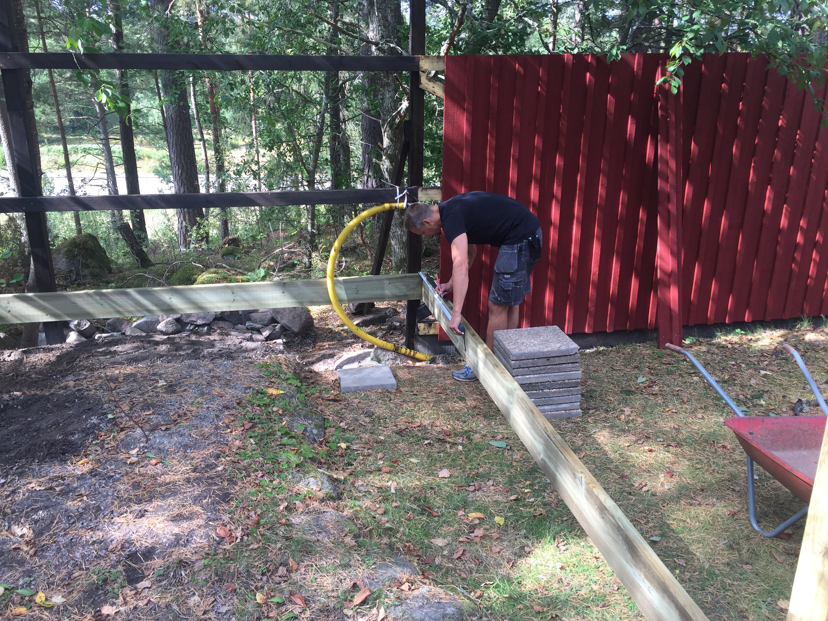 Dax att börja med golvet i uterumsdelen. Vi bestämde oss för att vi nog behöver två stolpar till för att kunna bära taket, så lite mer gräva först för att få till en plats för dom. Montering av dessa var det sista vi hann på semestern.