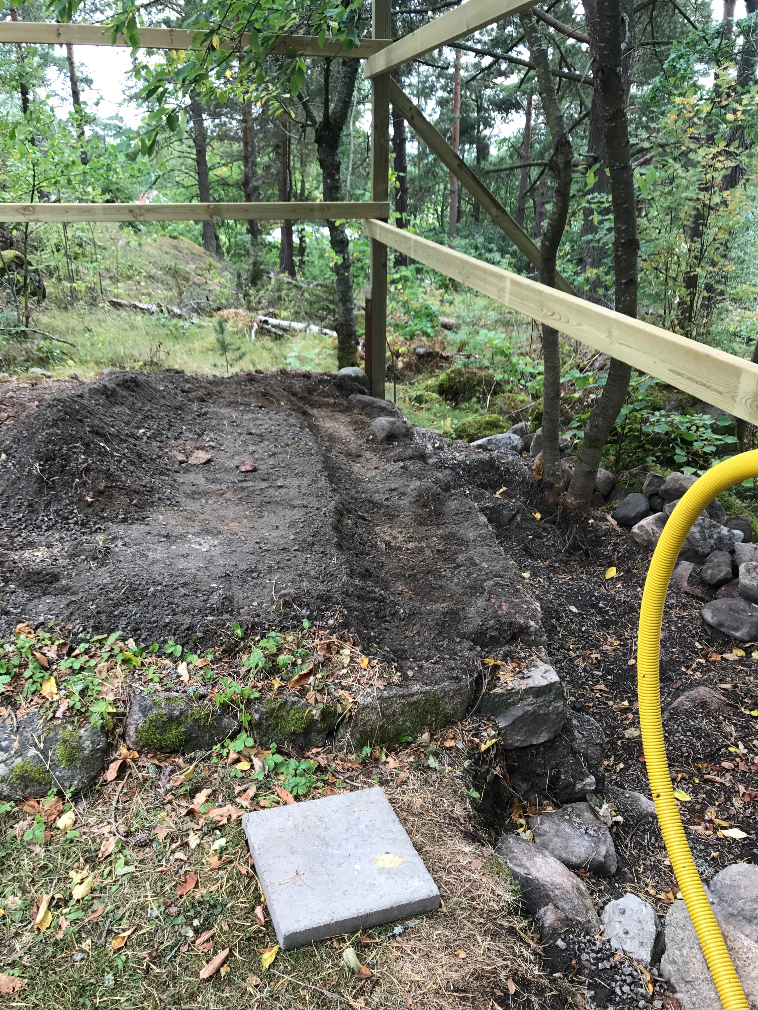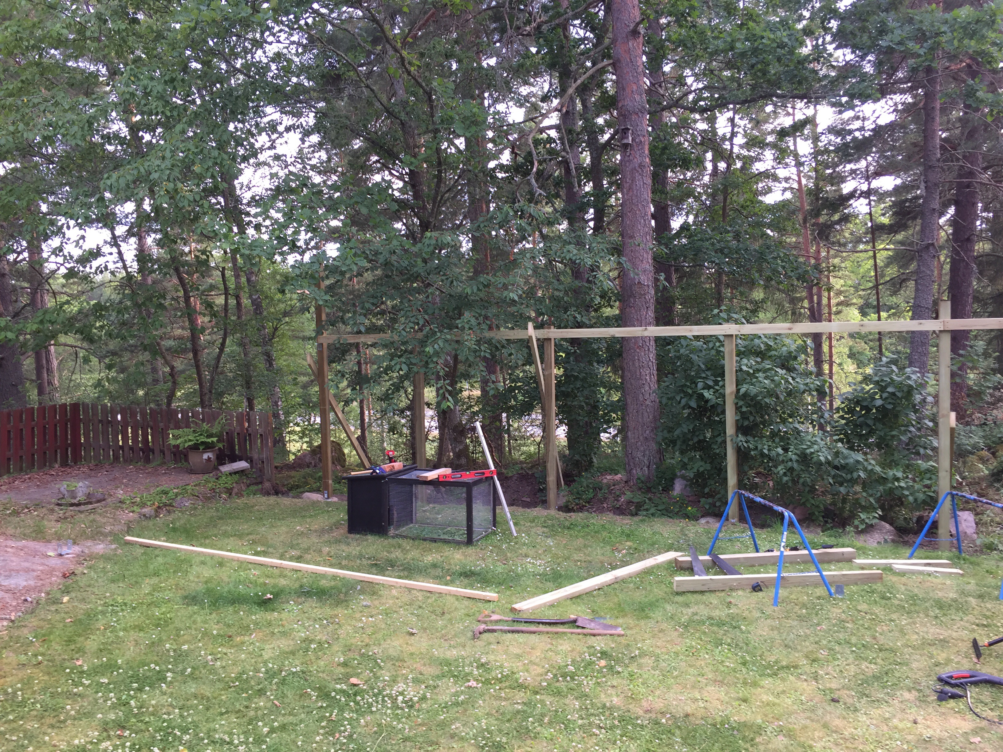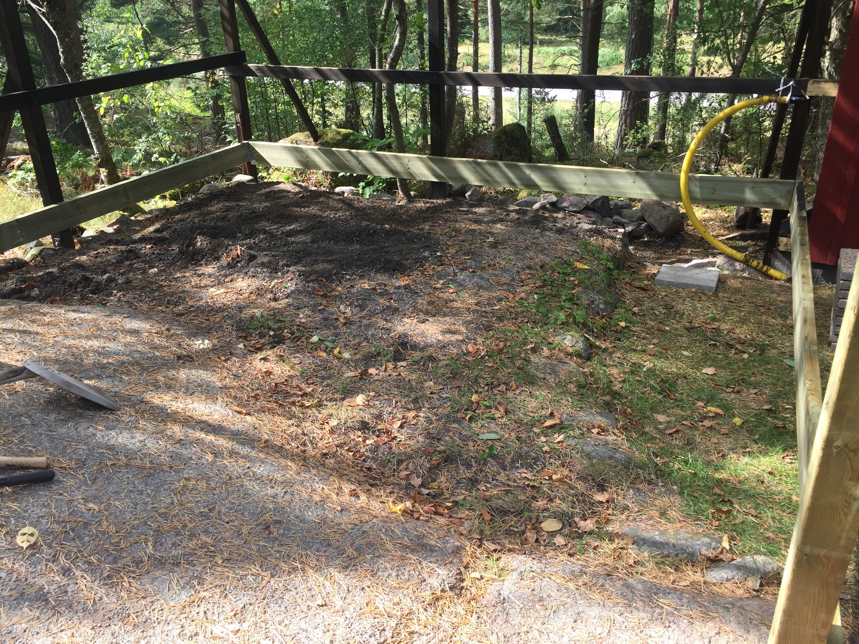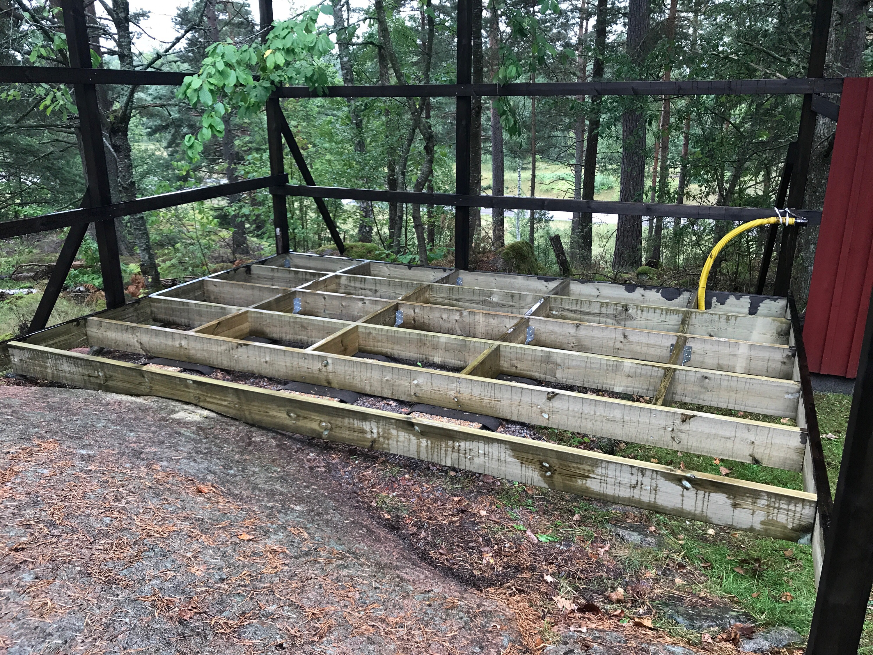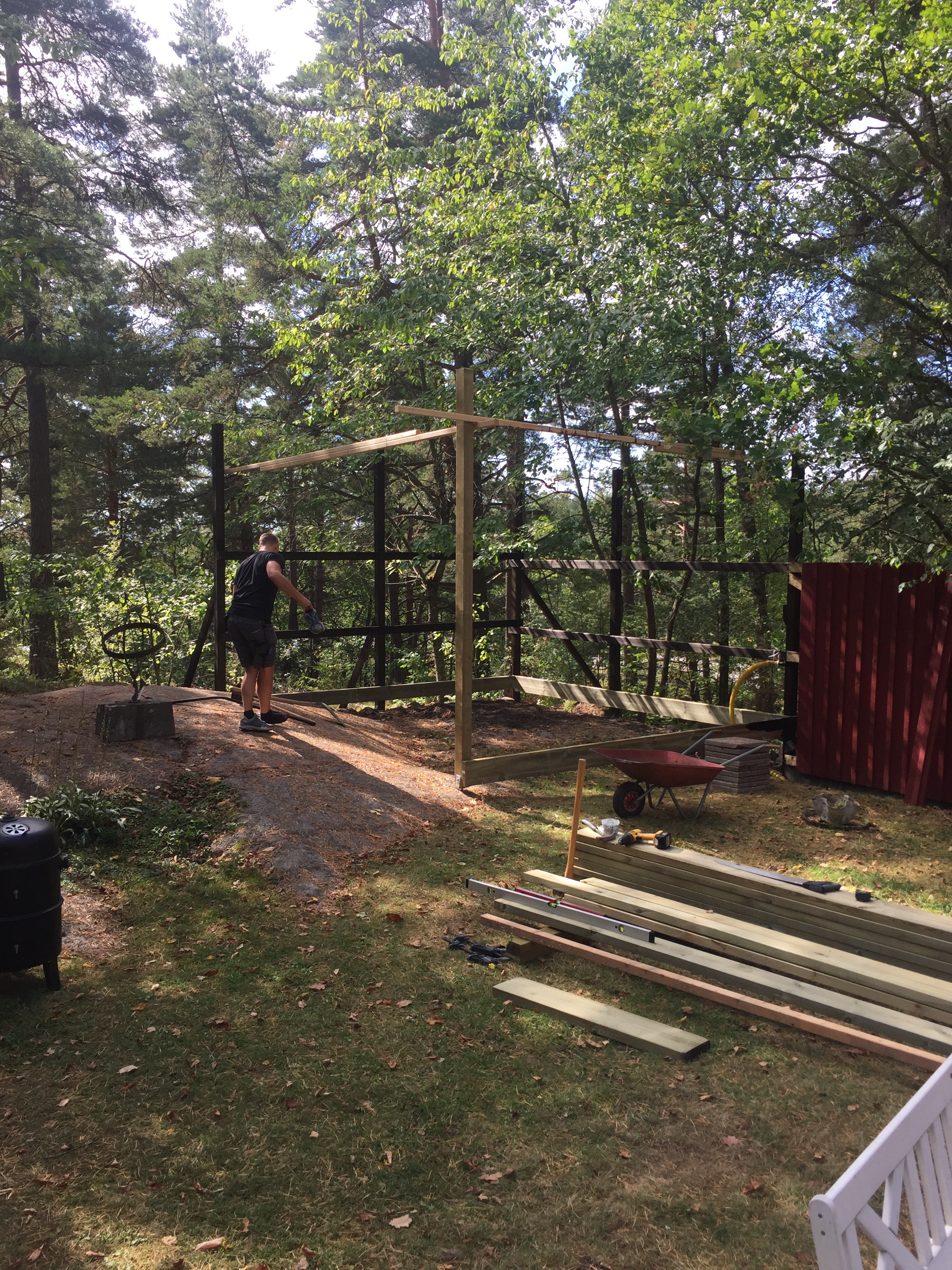 Dax att börja med golvet i uterumsdelen. Vi bestämde oss för att vi nog behöver två stolpar till för att kunna bära taket, så lite mer gräva först för att få till en plats för dom. Montering av dessa var det sista vi hann på semestern.