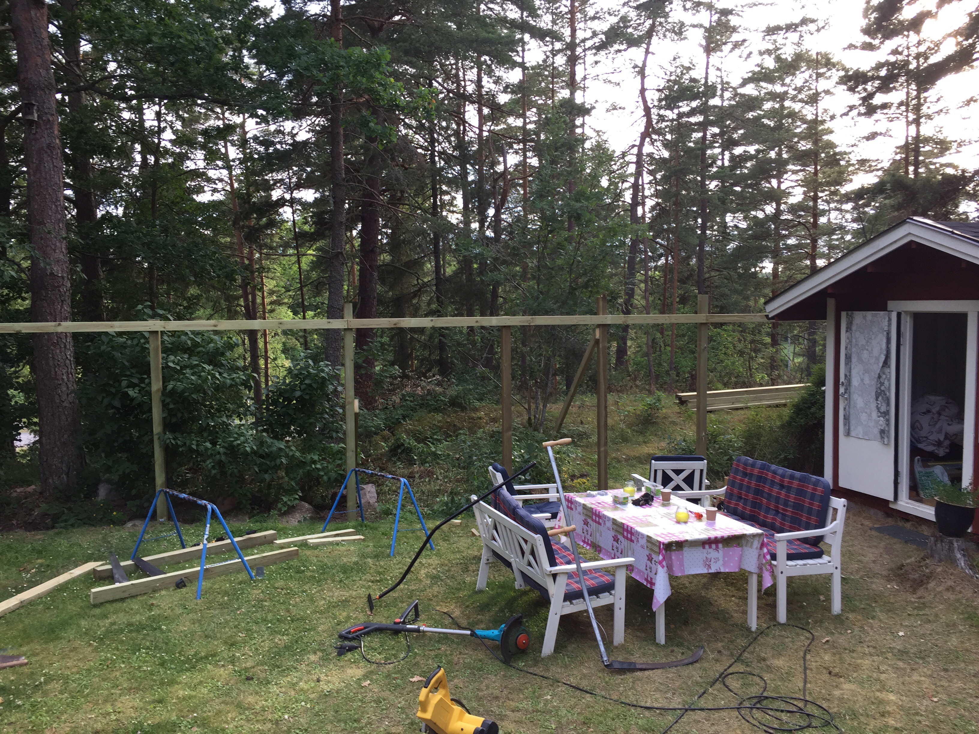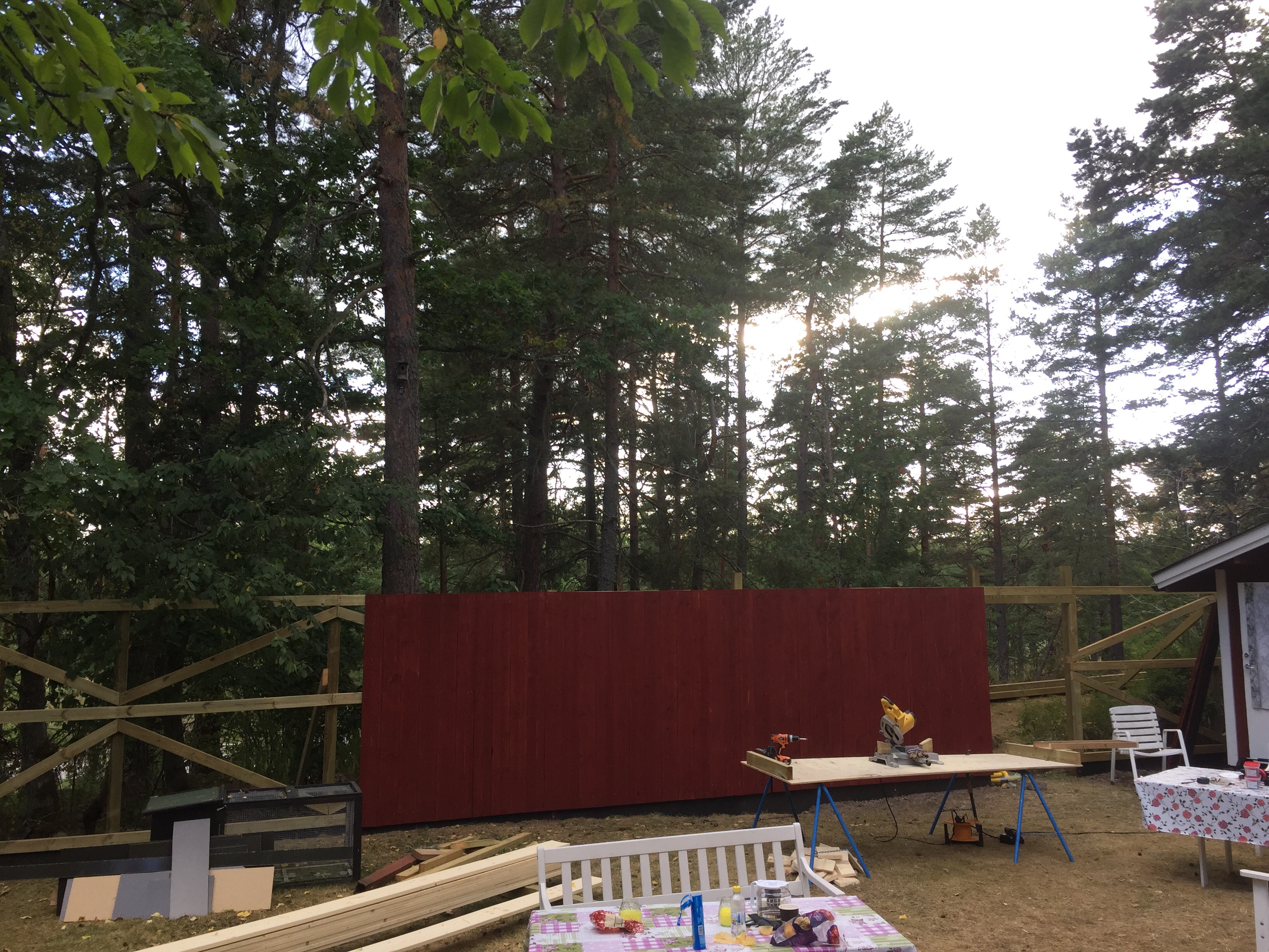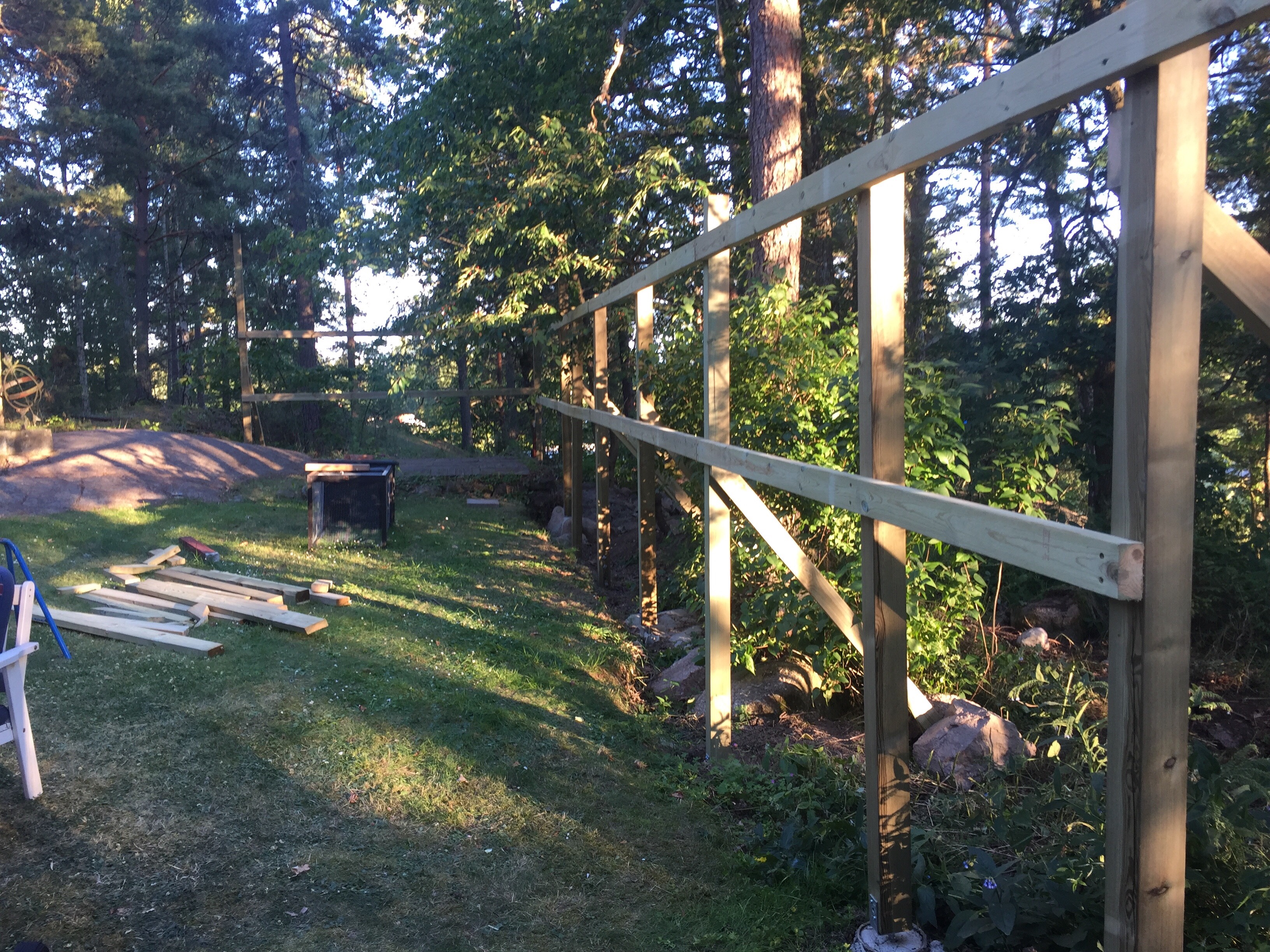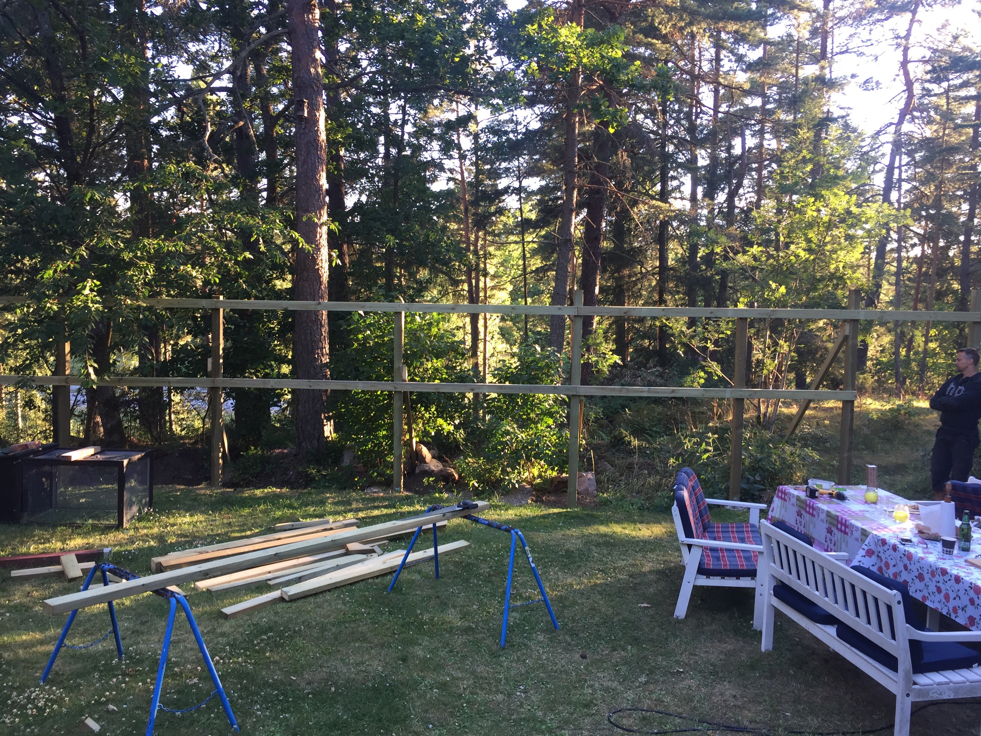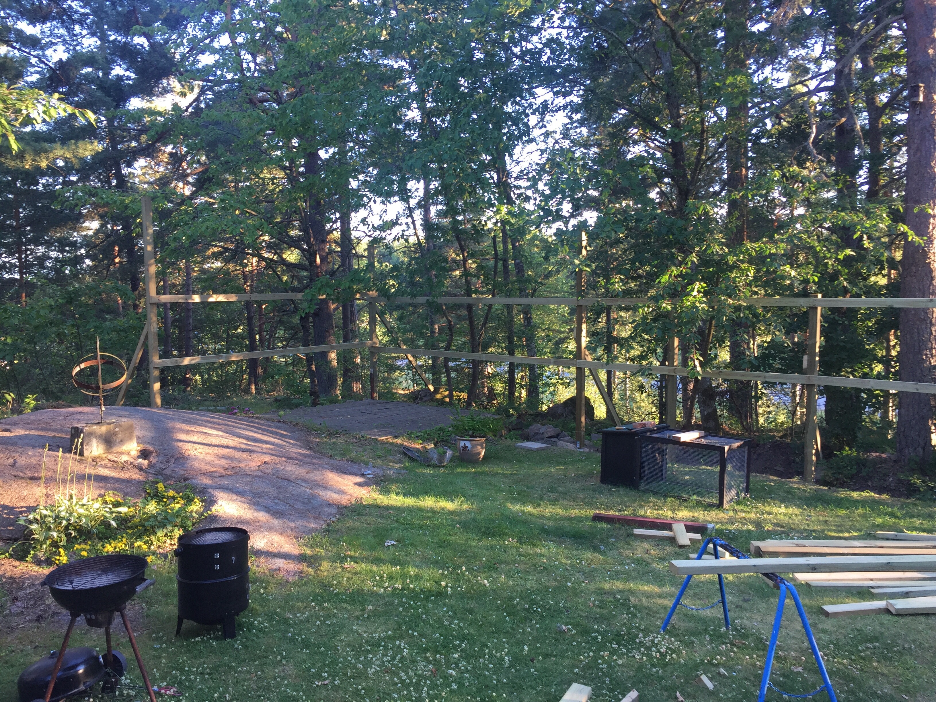 För några är sedan så byggdes vägen till samhället som ligger nära stugan om. Den flyttades egentligen längre bort från oss men i och med att vägen tidigare låg nedanför berget så hörde vi inte vägen på samma sätt. Förutom detta har dessutom hastigheten ökats och skogen glesats ur. Vi har dessutom en bergtäkt i Sturefors så många tunga lastbilar åker förbi. Magnus är nog den som har retat sig på ljudnivån mest sedan dess så i år gjorde vi slag i saken och satte igång bygget med ett bullerplank och en uteplats.