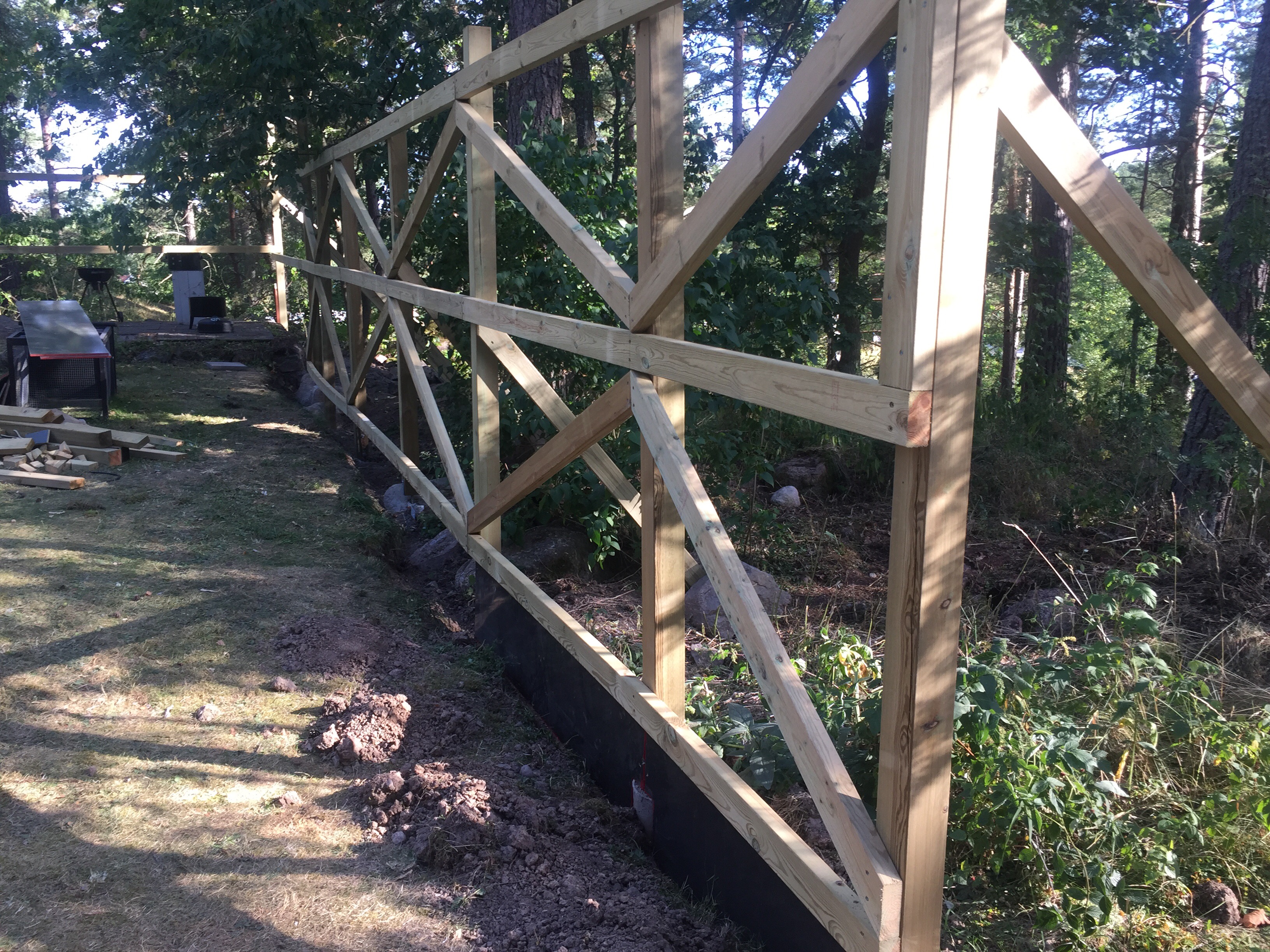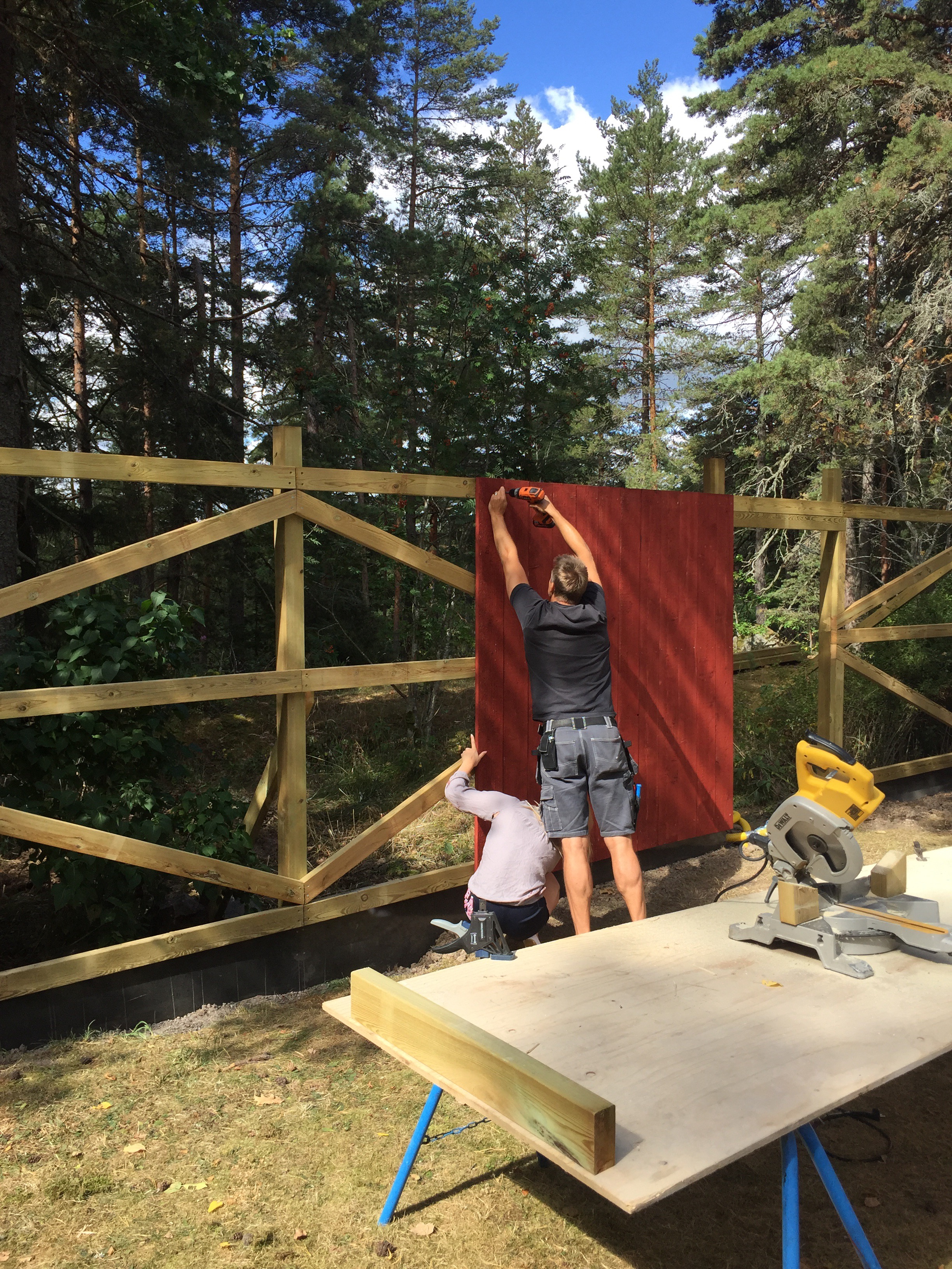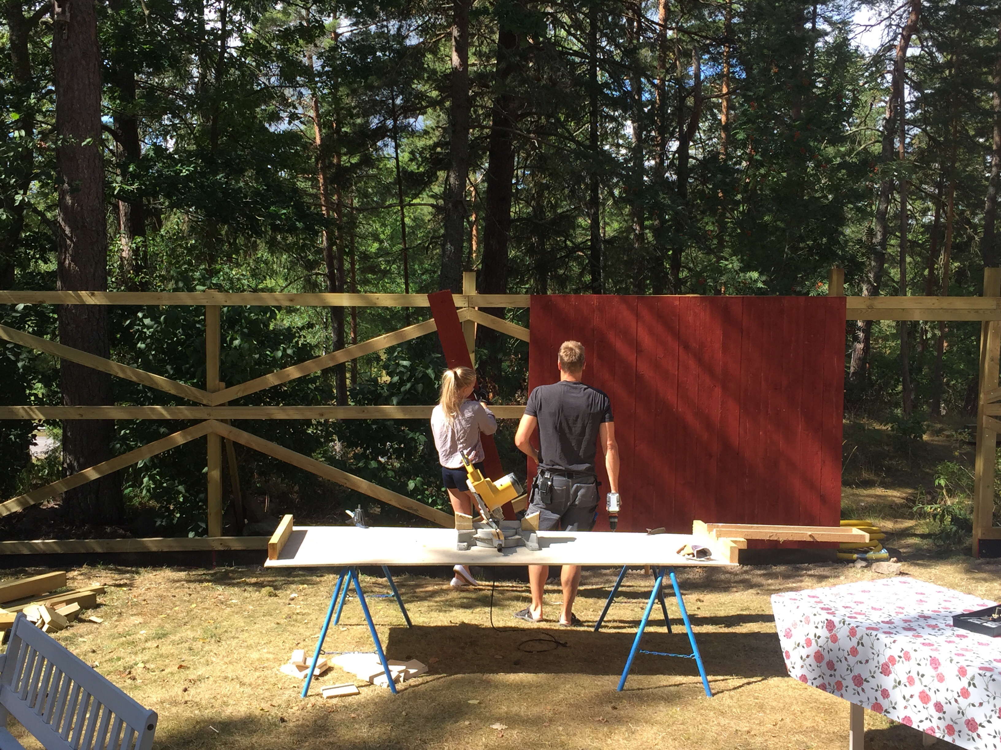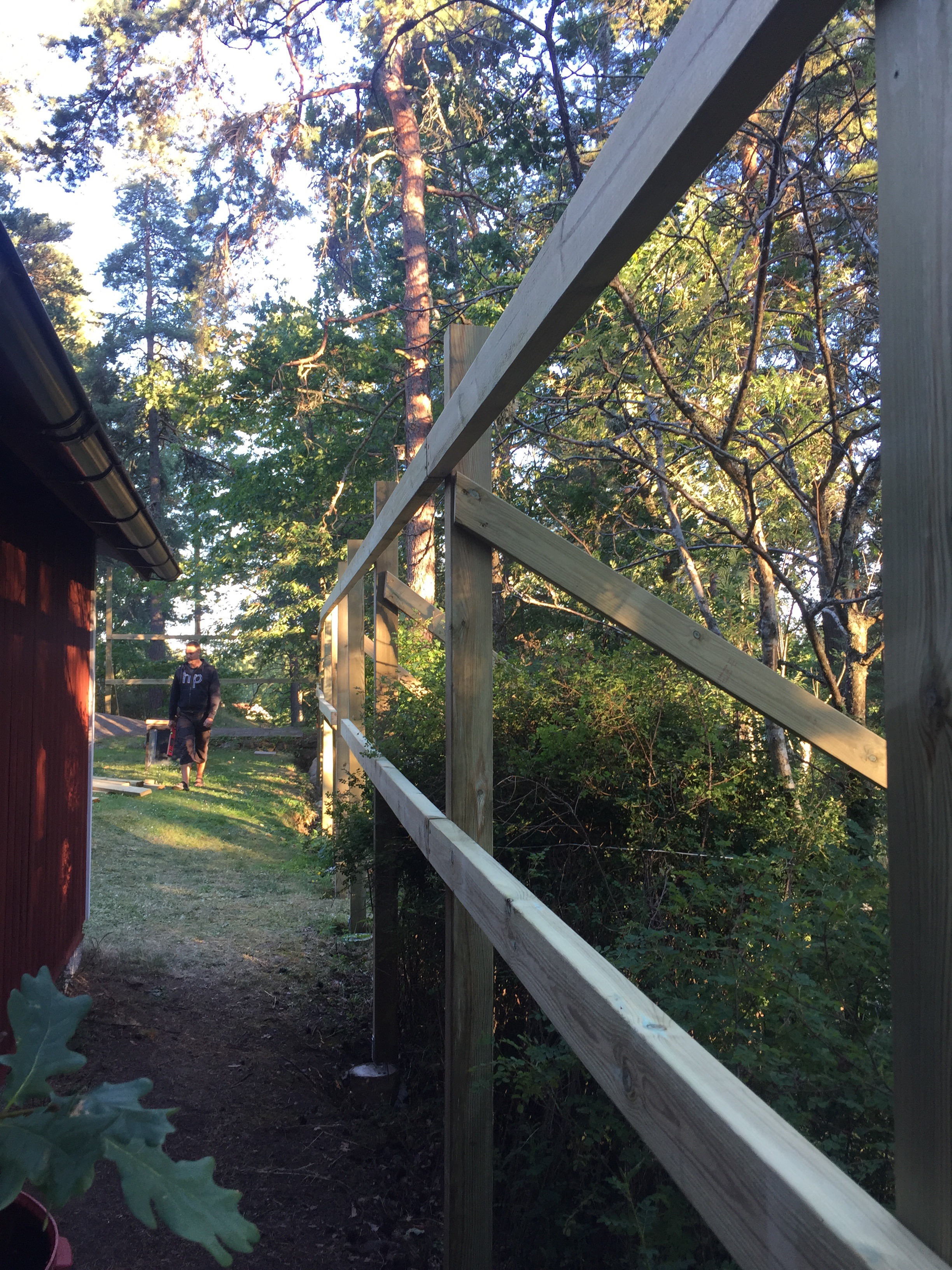 För några är sedan så byggdes vägen till samhället som ligger nära stugan om. Den flyttades egentligen längre bort från oss men i och med att vägen tidigare låg nedanför berget så hörde vi inte vägen på samma sätt. Förutom detta har dessutom hastigheten ökats och skogen glesats ur. Vi har dessutom en bergtäkt i Sturefors så många tunga lastbilar åker förbi. Magnus är nog den som har retat sig på ljudnivån mest sedan dess så i år gjorde vi slag i saken och satte igång bygget med ett bullerplank och en uteplats.