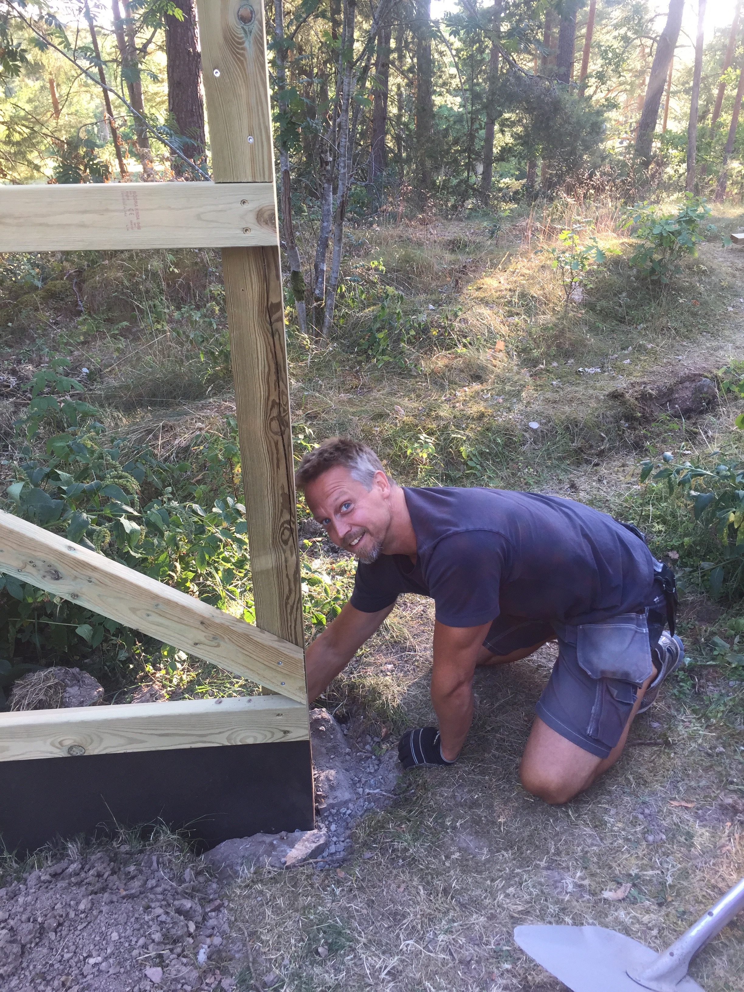 Steg 1 var egentligen att gjuta plintar. Det gjorde Magnus tillsammans med Micke och Tommy innan semestern. Hade det inte varit för den hjälpen hade vi nog inte kommit igång i år🙏 Som steg 2 kom sen att regla .