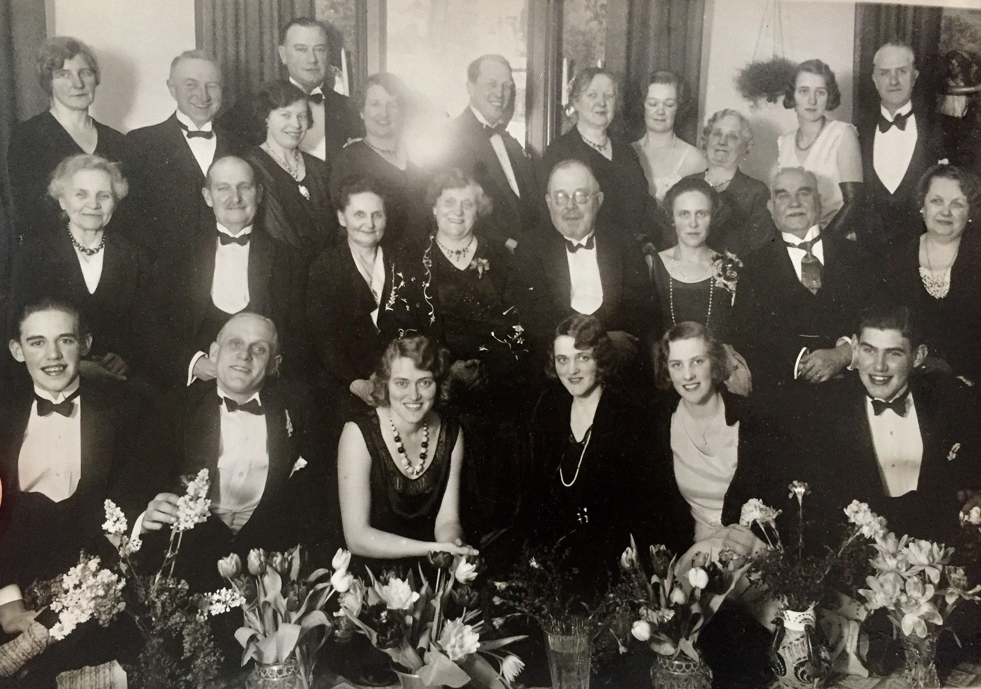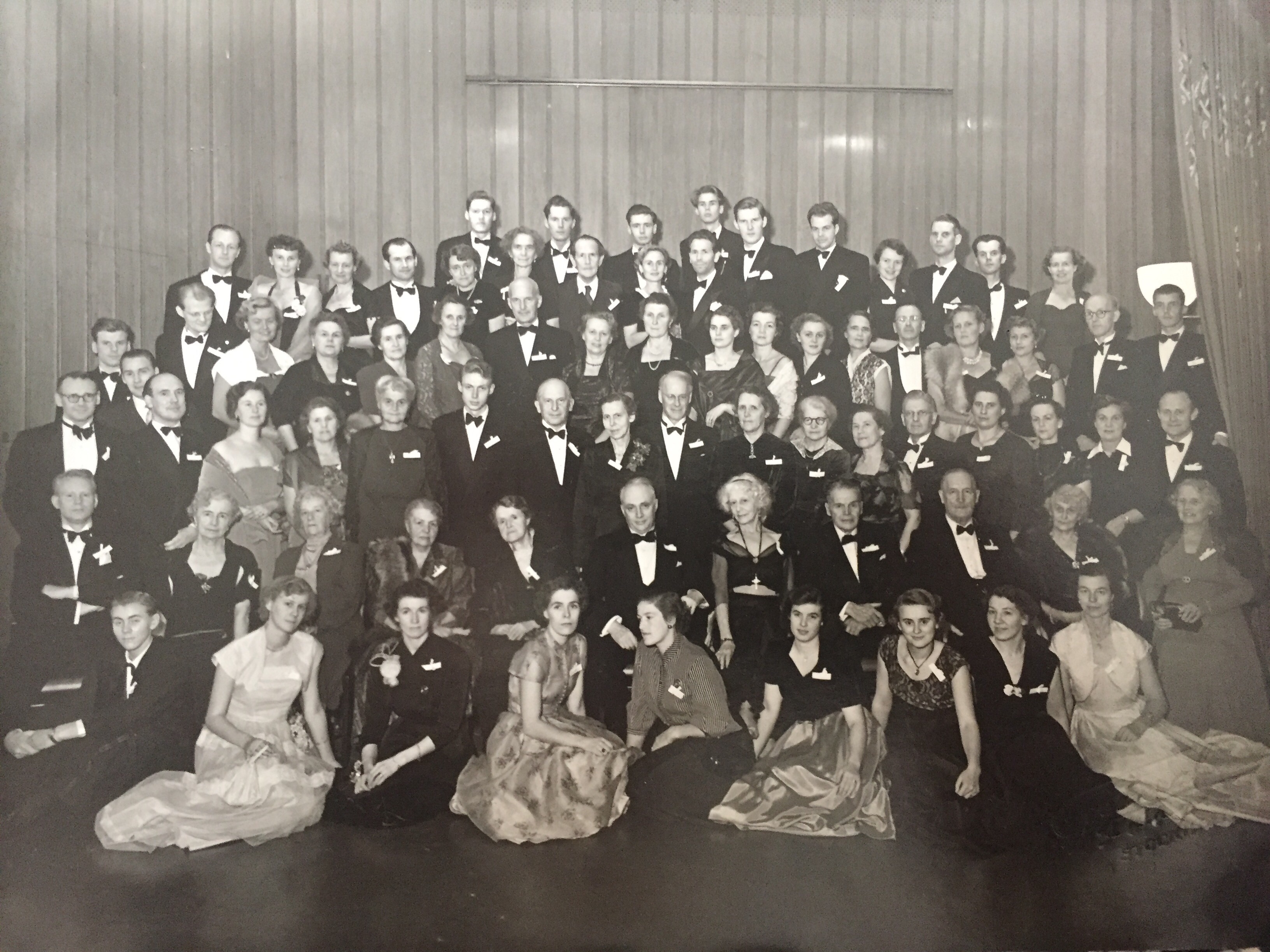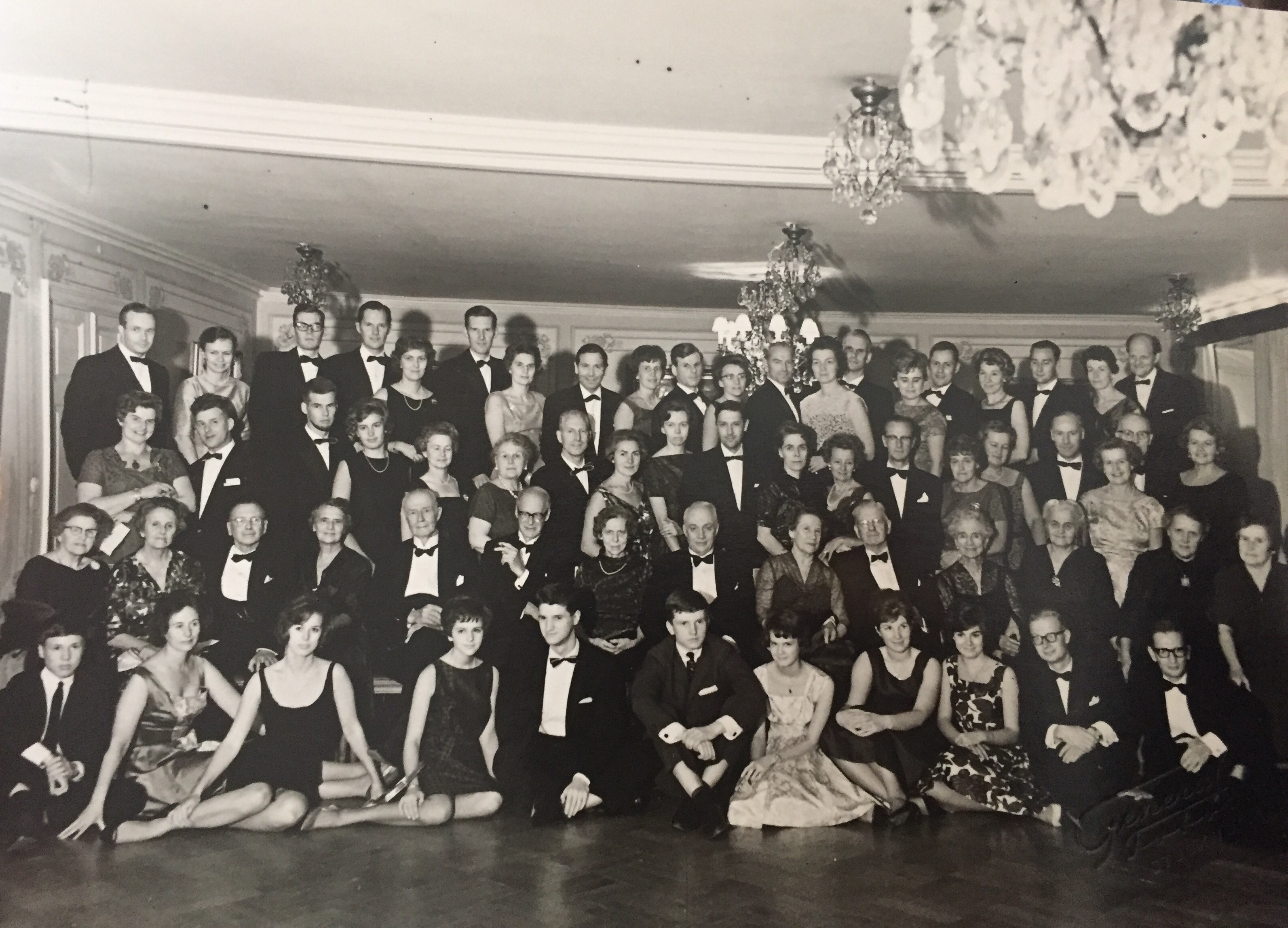 Herlitz träff på Hasselbacken. Mamma och pappa står längst upp, femma och sexa från höger. Mormor står i raden nedan, femma från höger och farmor Emy precis nedanför mormor, fyra från höger.