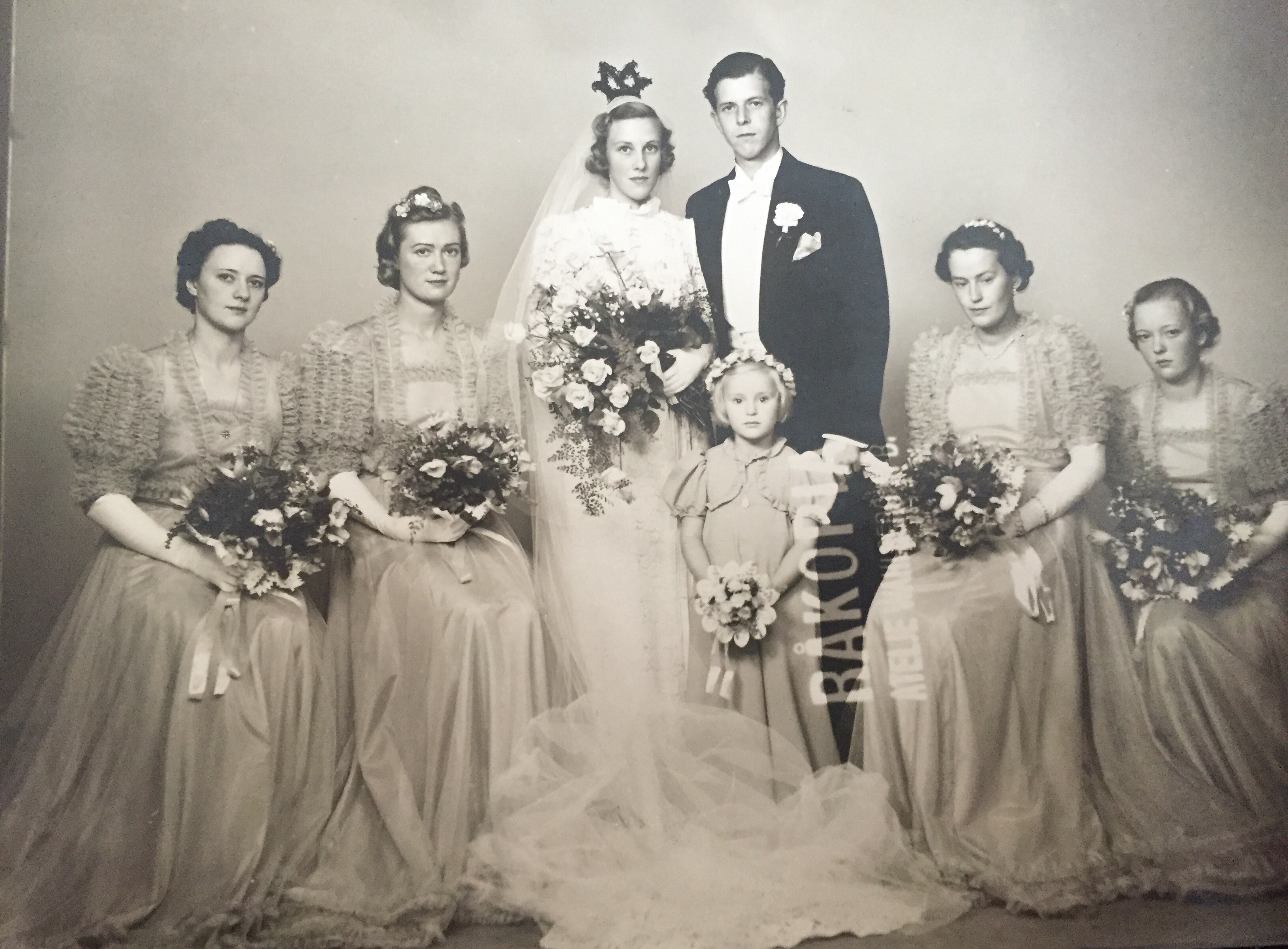 Margit (mormors syster Elsas dotter) och Stigs Höglers bröllop. Mamma är brudnäbb och moster Kerstin längst ut till höger är brudtärna. De andra vet inte mamma vilka det är.