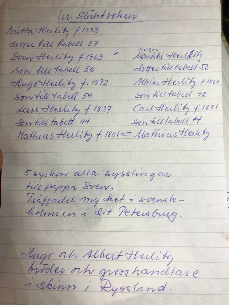 Mamma hade suttit och bläddrat i släktboken och en bok om svenska handelsmän i Ryssland. Hugo, som alltså är mammas farfar, och hans bror Albin var grosshandlare i skinn i St Petersburg i Ryssland under en period.