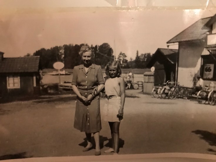 Mamma med (mammas) farmor Emmy utanför affären i Stavsnäs vinterhamn där mamma spenderade somrarna när hon var liten. Mamma sommarjobbade i affären en sommar. Hennes uppdrag var att uppdatera nummerbrickorna som användes som könummer. De hade blivit lite slitna så mamma fick handmåla nya siffror på alla 300 st! Det tog hela sommaren😊
